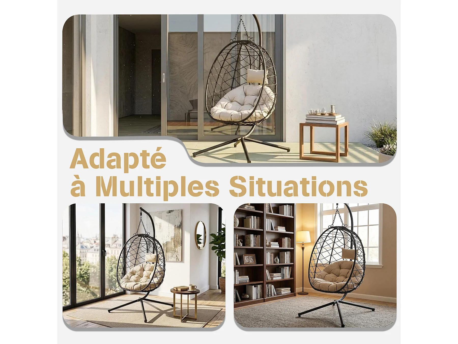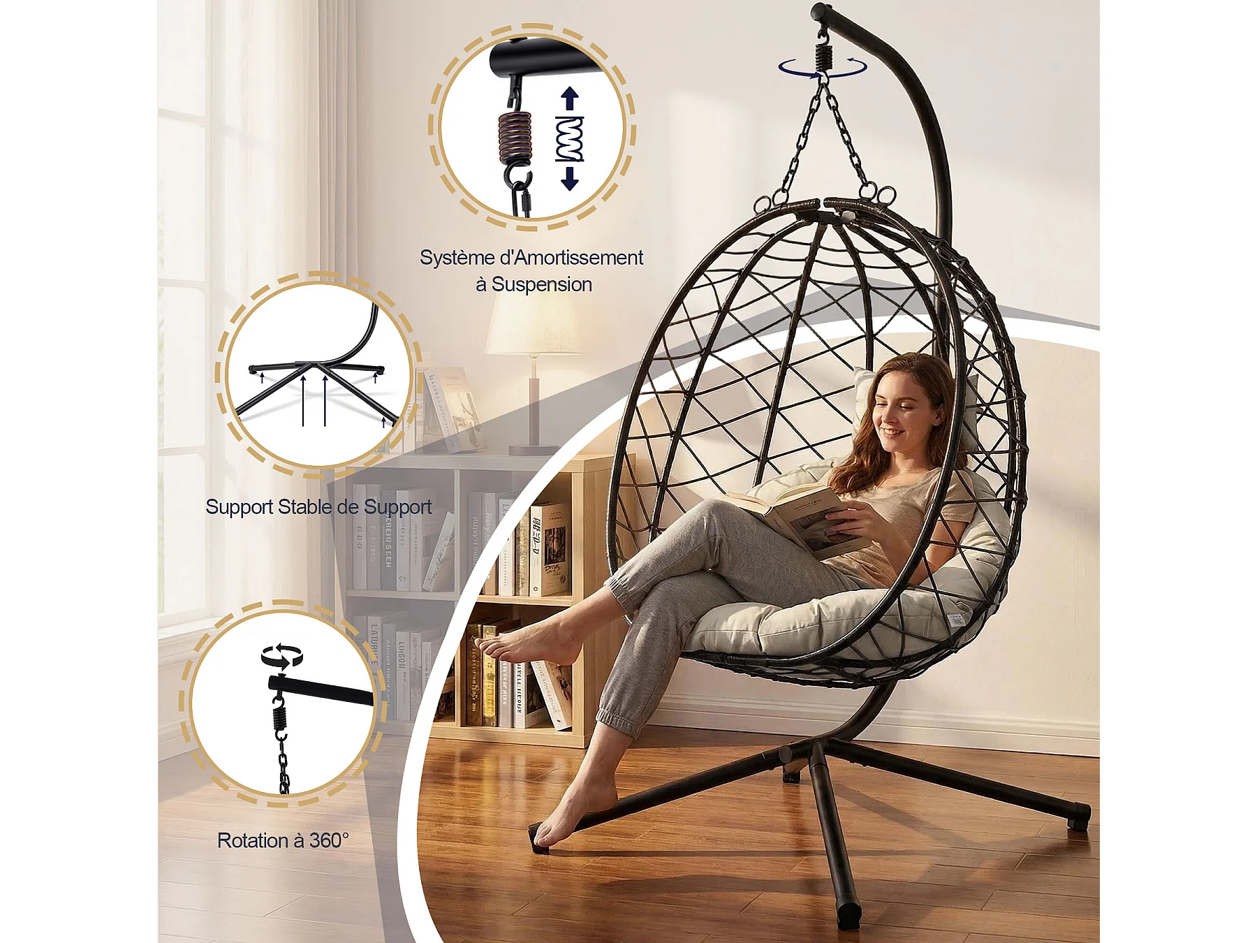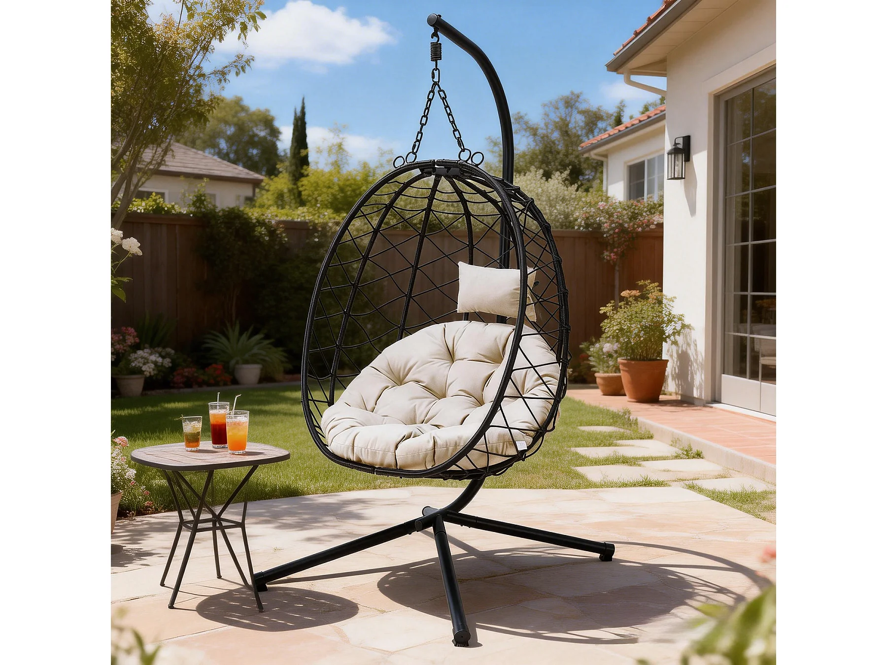 Fauteuil suspendu HOMEMIYN avec coussin, chaise hamac avec support métallique noir, coussin gris ou beige, idéal jardin balcon printemps