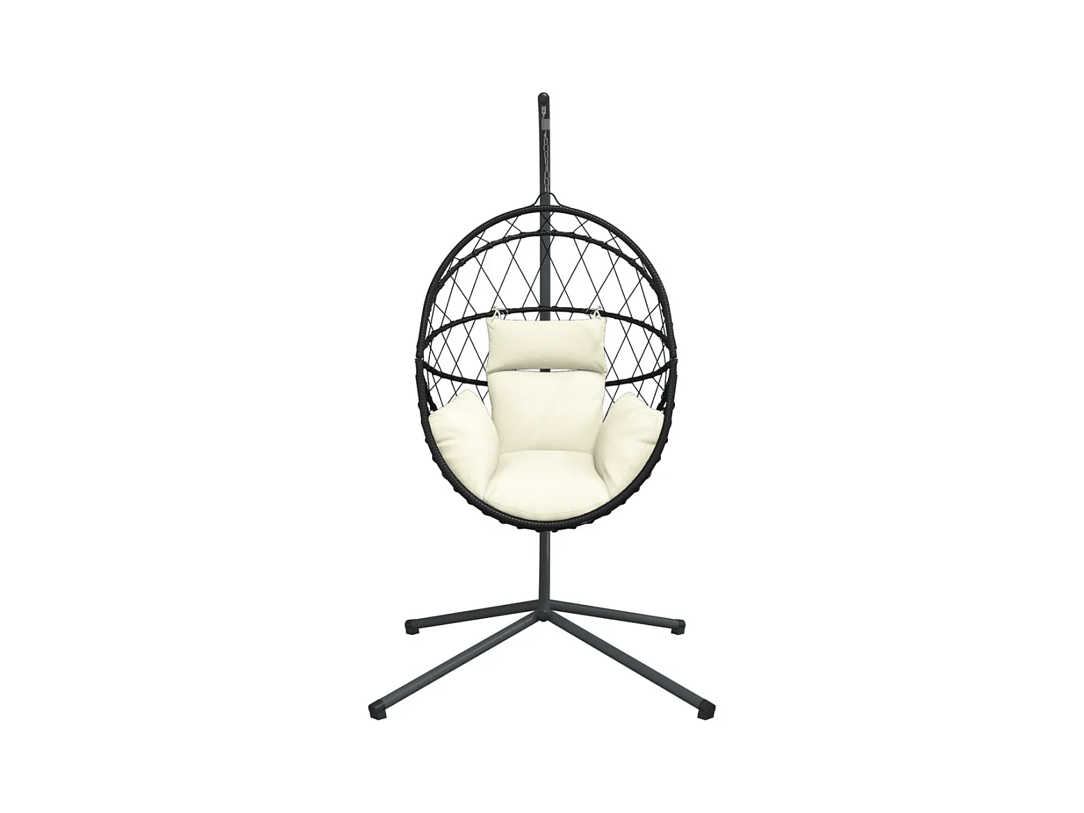 Chaise suspendue en forme d'œuf et support beige rotin et acier
