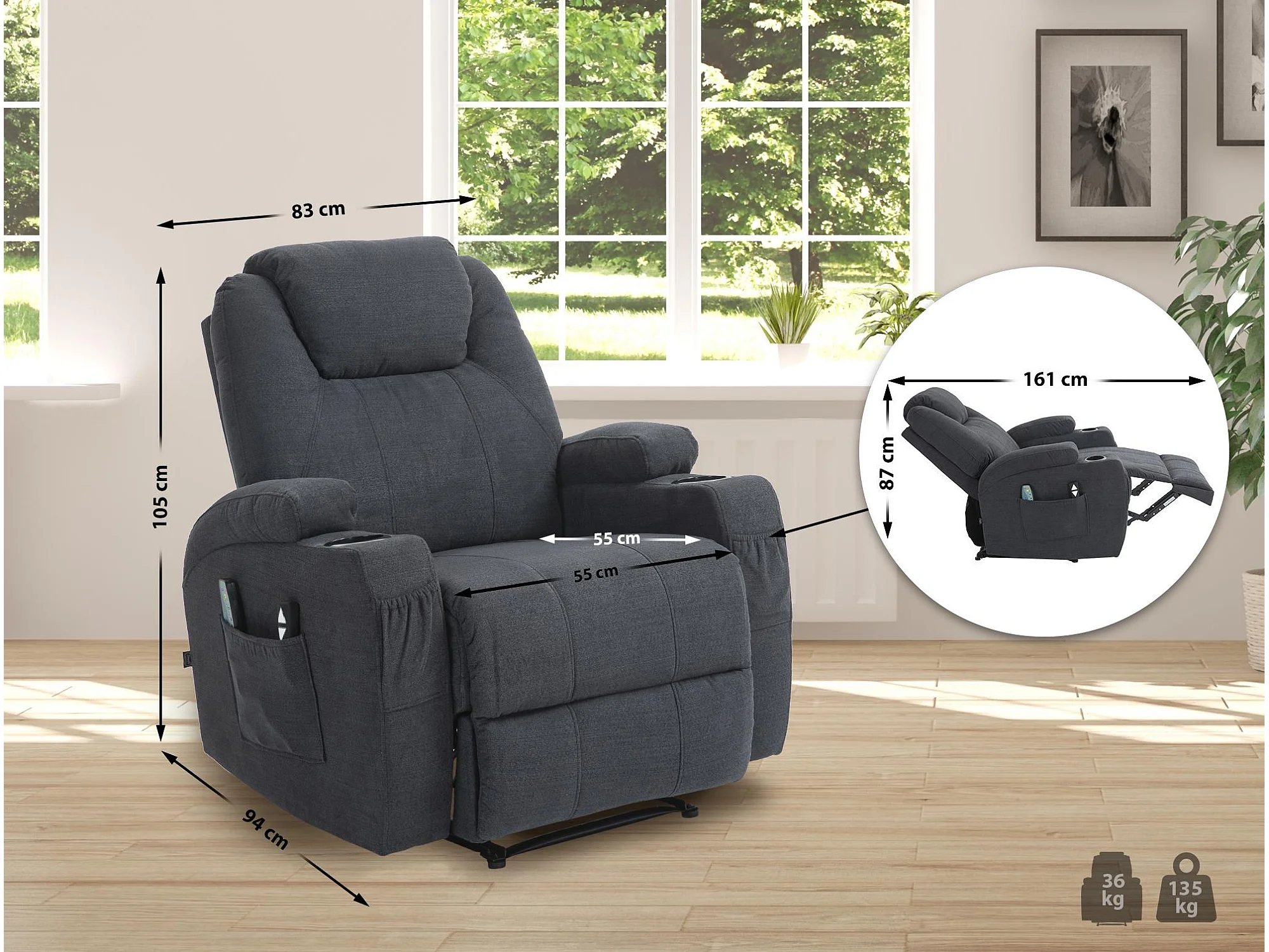 Fauteuil de relaxation électrique tissu Klona-Couleur Gris foncé