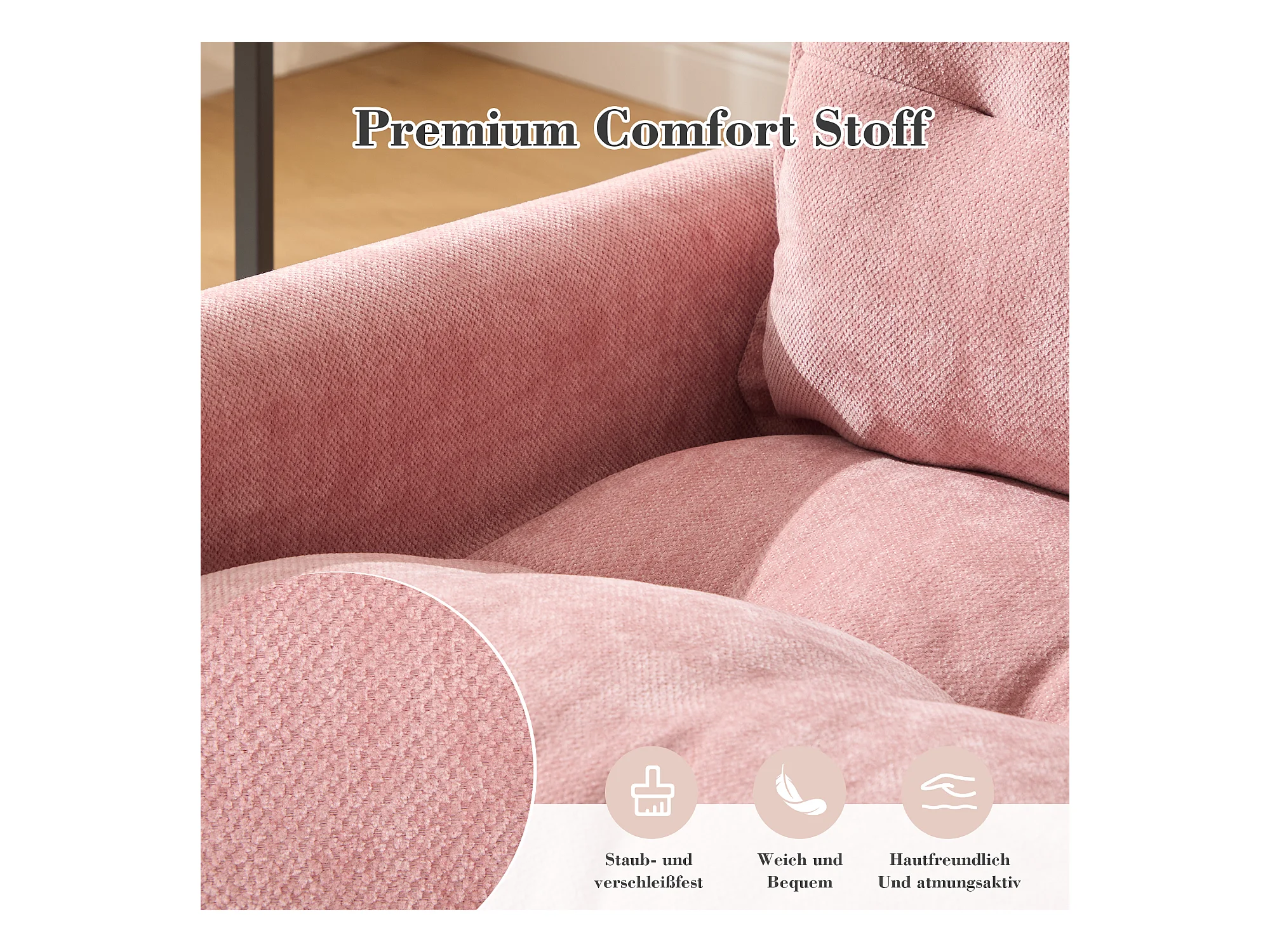 Fauteuil tournant 360° avec accoudoirs, design moderne, tissu chenille, rose, inclinable avec coussin (92x74x67 cm)