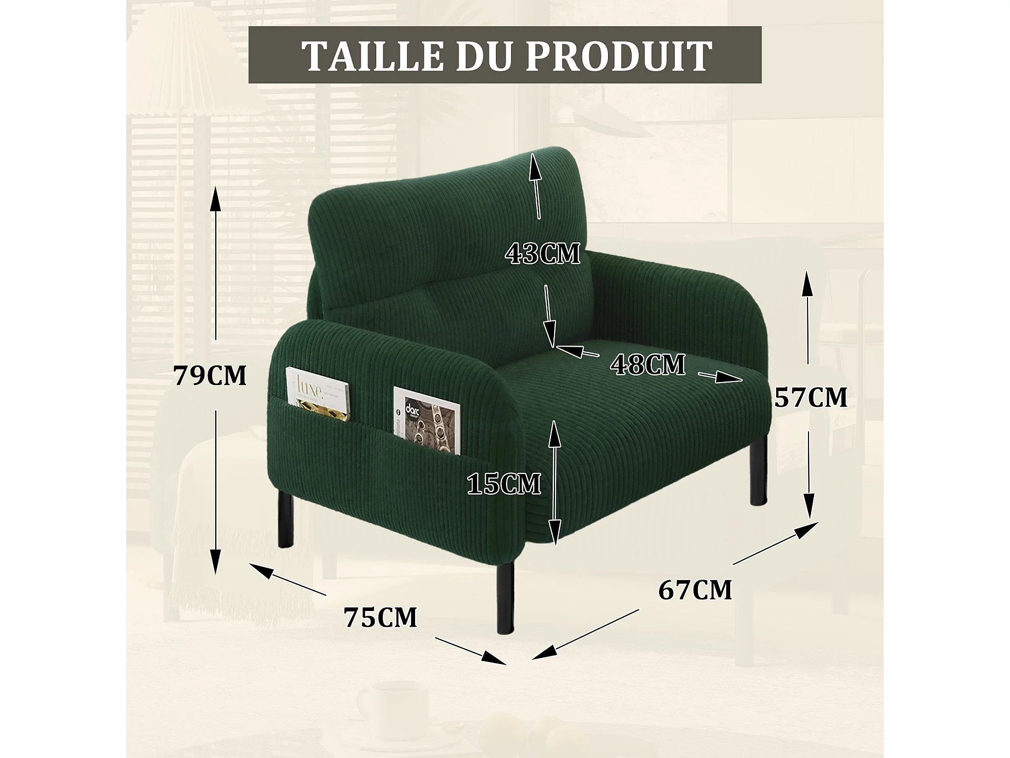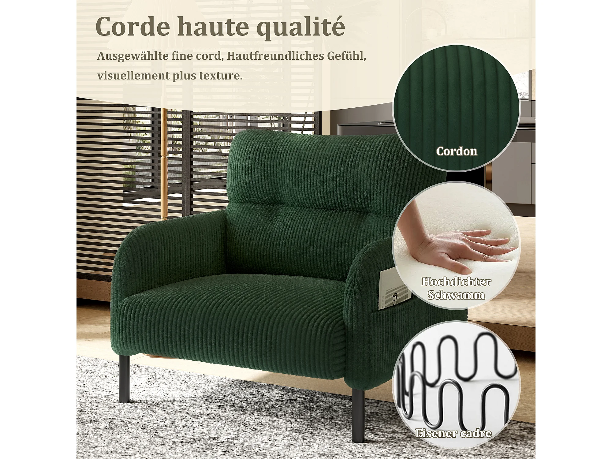Fauteuil velours côtelé vert - avec Poches Latérales - Style Carré et Design Naturel pour Salon ou Balcon