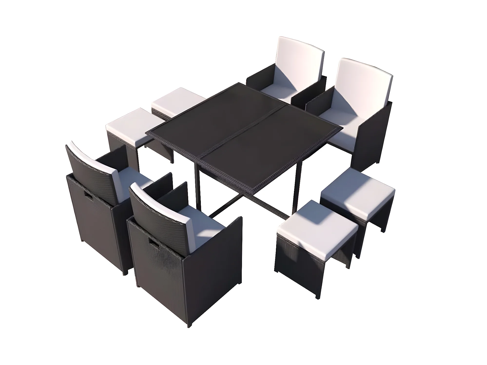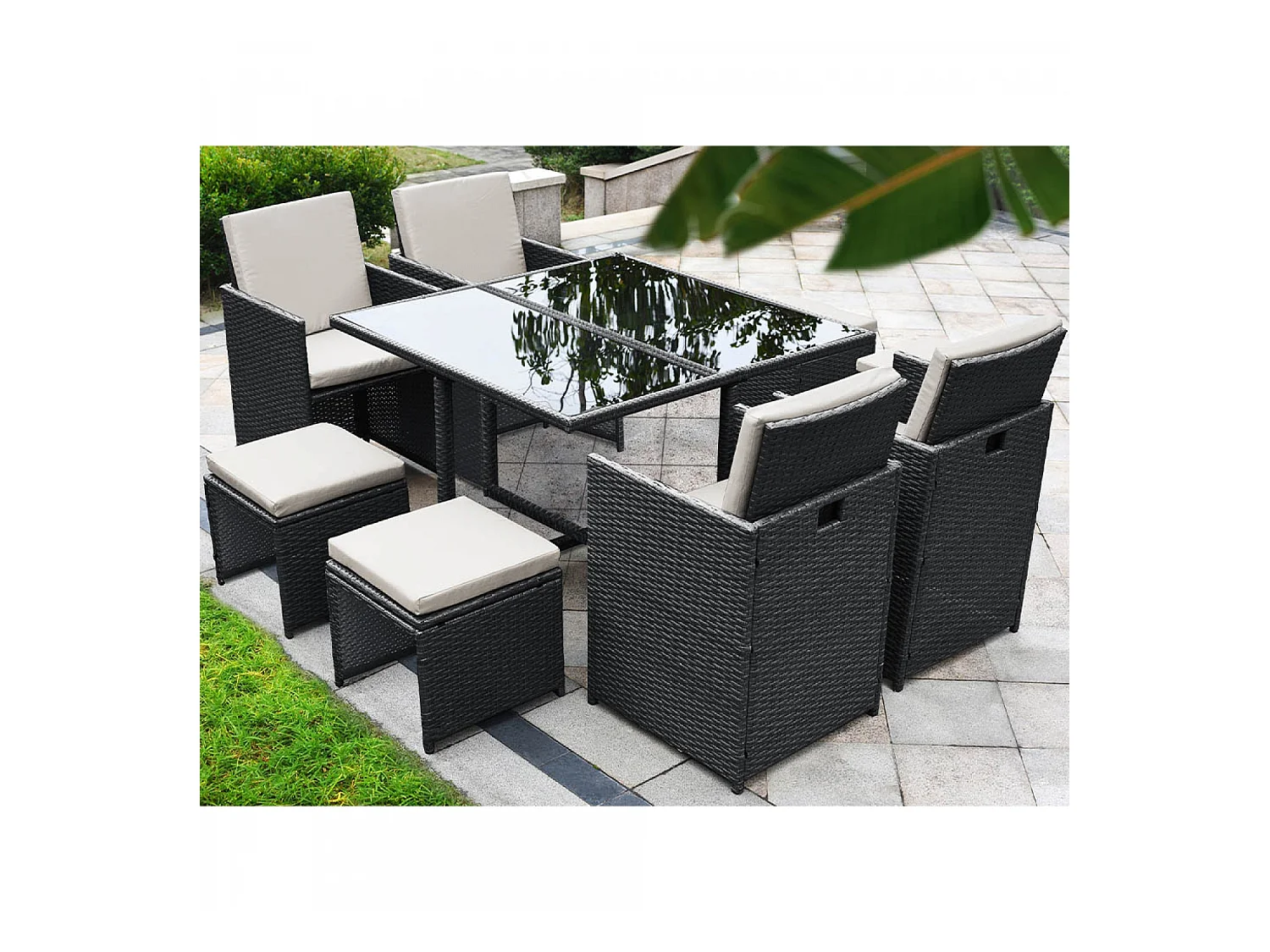 Table et chaises 8 places en résine tressée noir et blanc FLORIDA