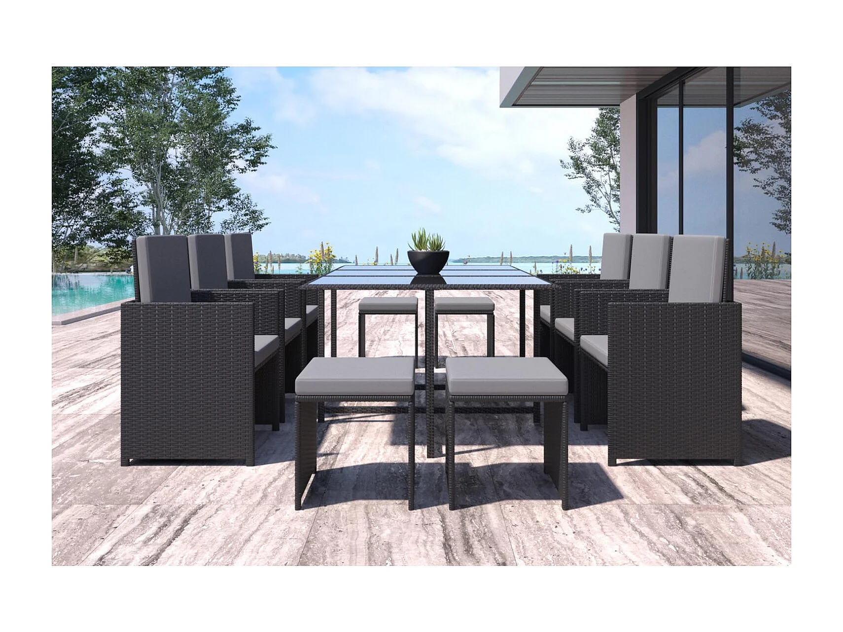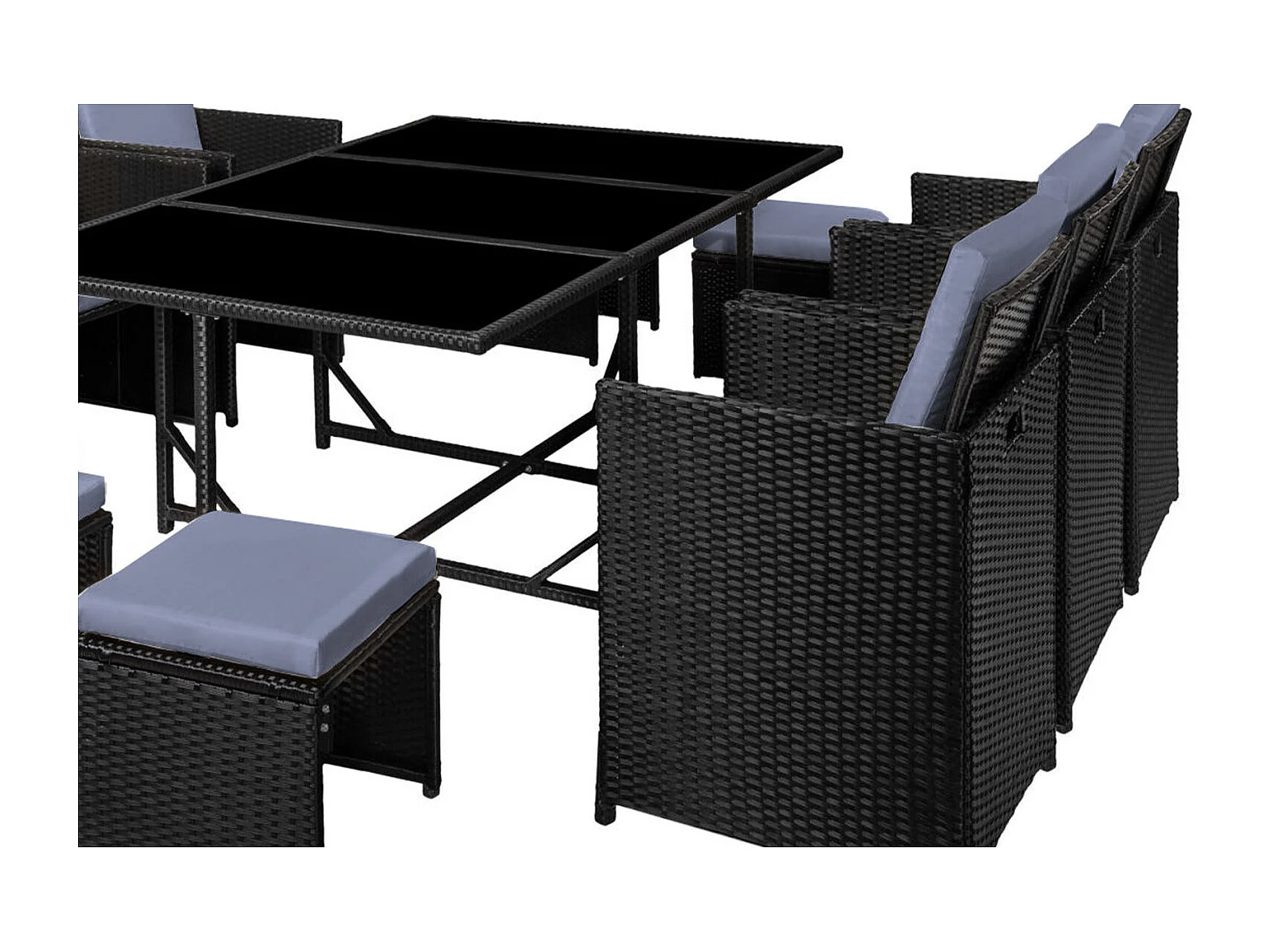 Table et chaises 10 places en résine tressée noir et gris FLORIDA