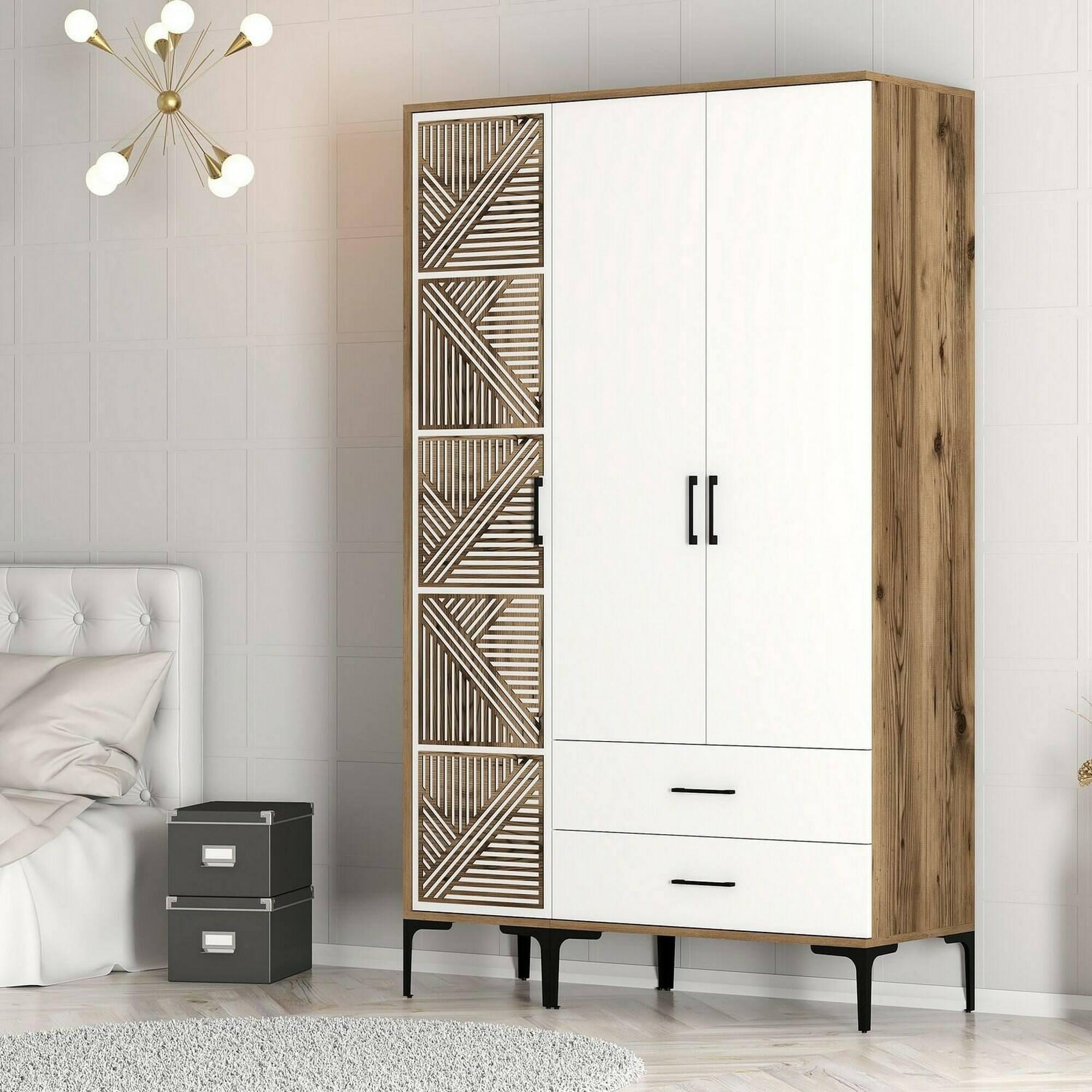 GARDE-ROBE 3 PORTES - Meubles de chambre, Penderie de plain-pied, Placard à vêtements, 120x48h201 cm, Noyer et Blanc. STRUCTURE ET UTILISATION - Armoire-penderie polyvalente idéale pour garantir un grand espace de rangement, adaptée pour contenir des vêtements, des chaussures et des accessoires - Toute la structure design du meuble est multifonctionnelle, parfaite pour meubler une chambre double ou une chambre d'enfant dans un espace- moyen d'économie ou la chambre d'amis - Solution élégante qui vous permet d'organiser vos vêtements avec style, offrant de grands espaces et des fonctionnalités conçues pour répondre à vos besoins de stockage, tout en ajoutant une touche de raffinement et d'ordre à votre environnement domestique. QUALITÉ ET DESIGN - Meuble au design moderne et élégant, parfait pour meubler un environnement contemporain et lumineux - Idéal pour ceux qui recherchent des solutions fonctionnelles et peu encombrantes, ce produit est parfait pour les maisons et les appartements de toutes tailles - Garantie de deux ans à compter de la date d'achat. CARACTÉRISTIQUES TECHNIQUES - Accessoire d'ameublement polyvalent, conçu pour une intégration facile avec d'autres meubles - Emballage résistant, conçu pour le commerce électronique - Matériau: Panneau mélaminé 18mm - Informations supplémentaires: Avec fermeture éclair - Fermeture standard - Ne convient pas comme séparateur de pièce - Monté. DIMENSIONS EN CM - Garde-robe 3 portes : Longueur: 120 Largeur: 47,5 Hauteur: 201,4