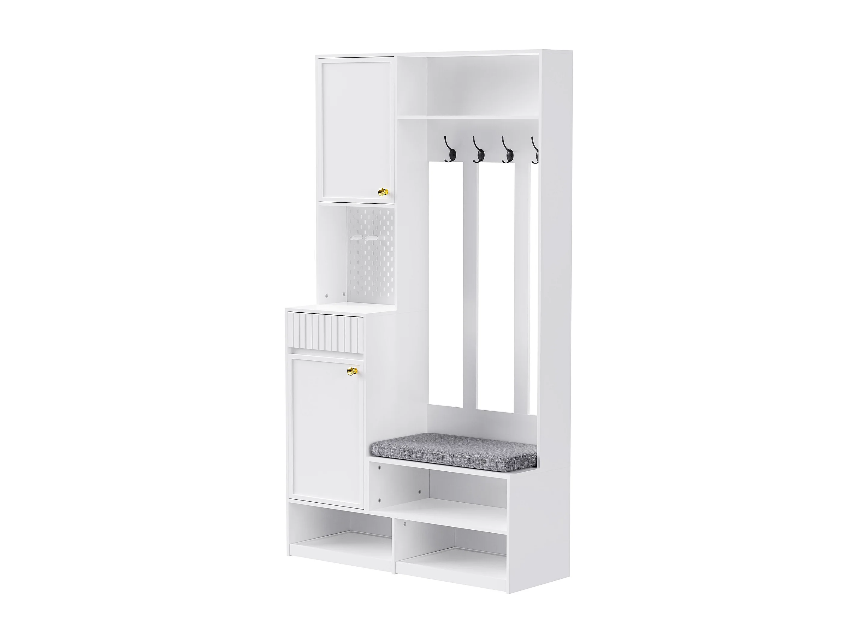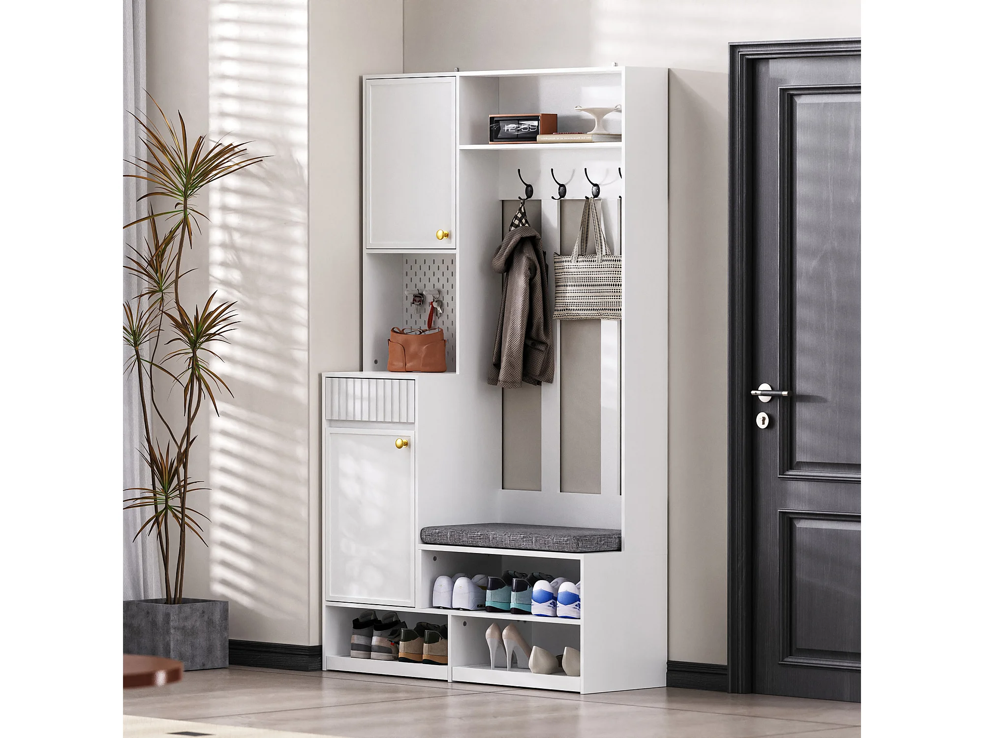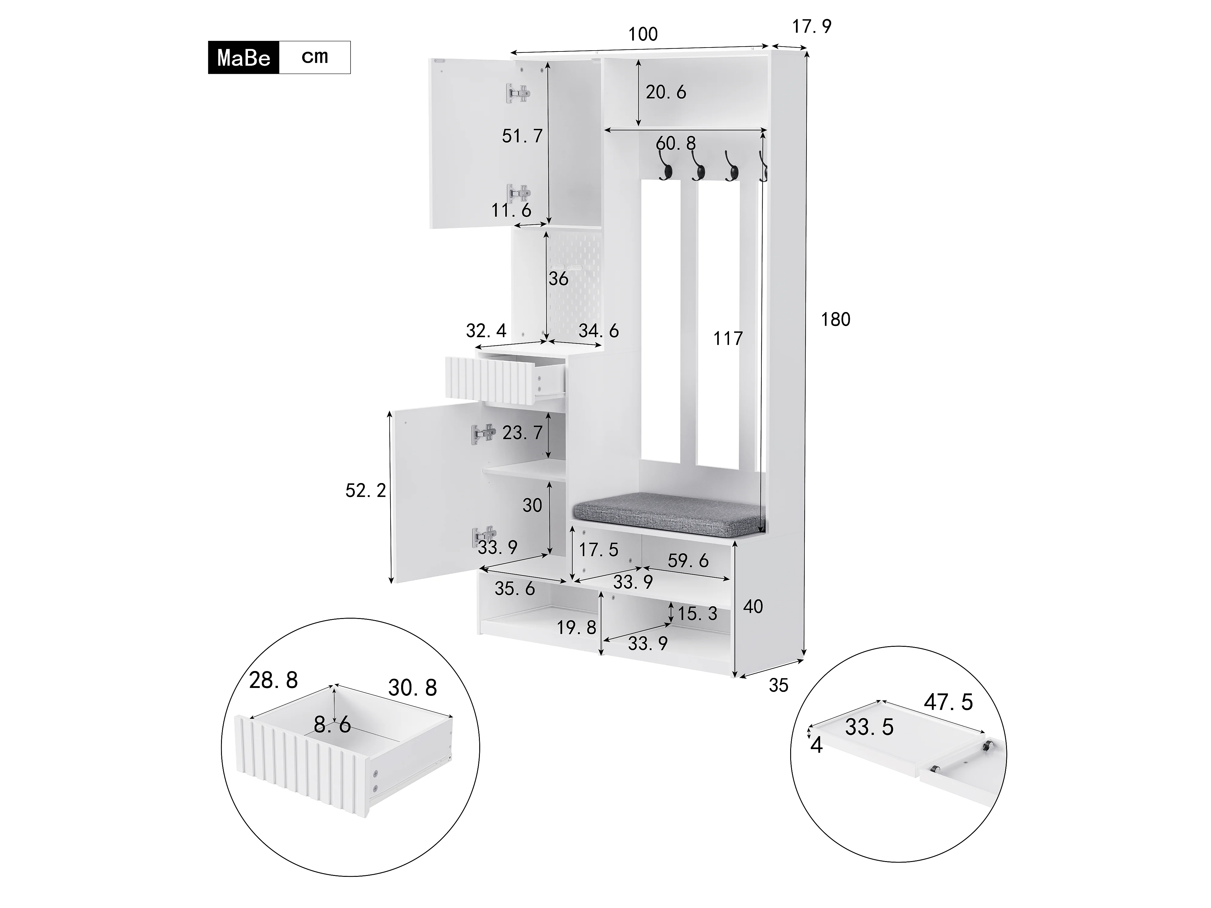 Garde-robe d'entrée complète avec banc, 4 crochets, portes et tiroirs, MDF, blanc (100x180x35cm)