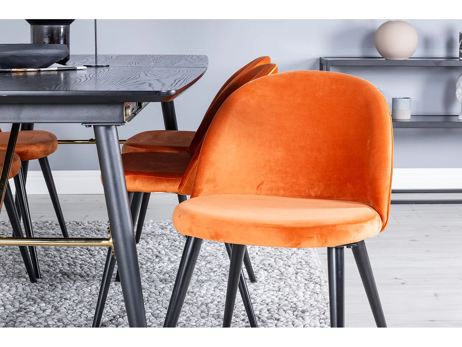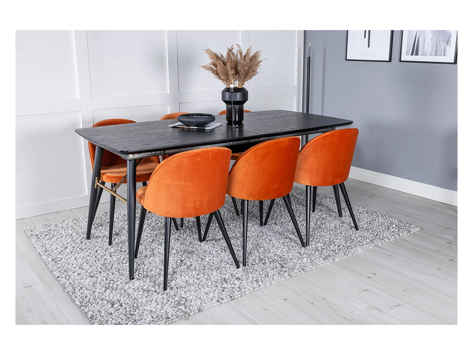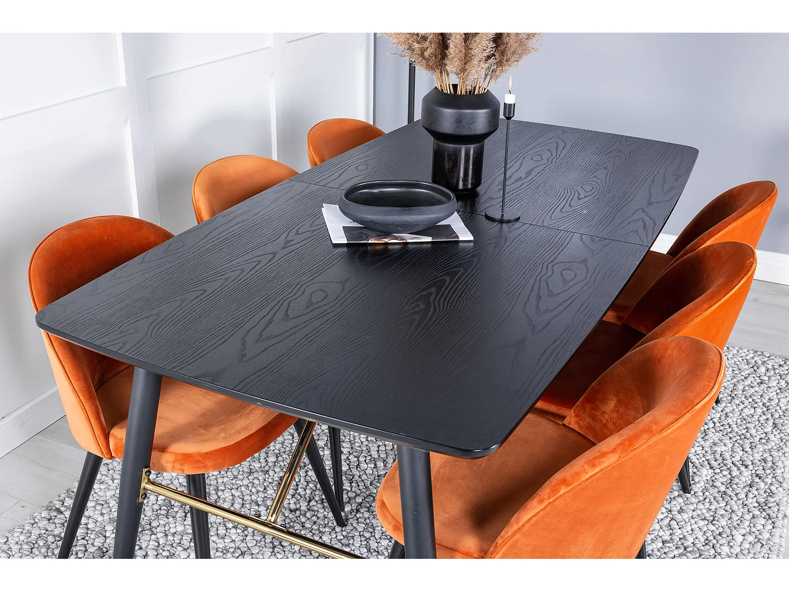 Gold ensemble table, table extensible longueur cm180 / 220 noir et 6 Velvet chaises Velours orange, noir.