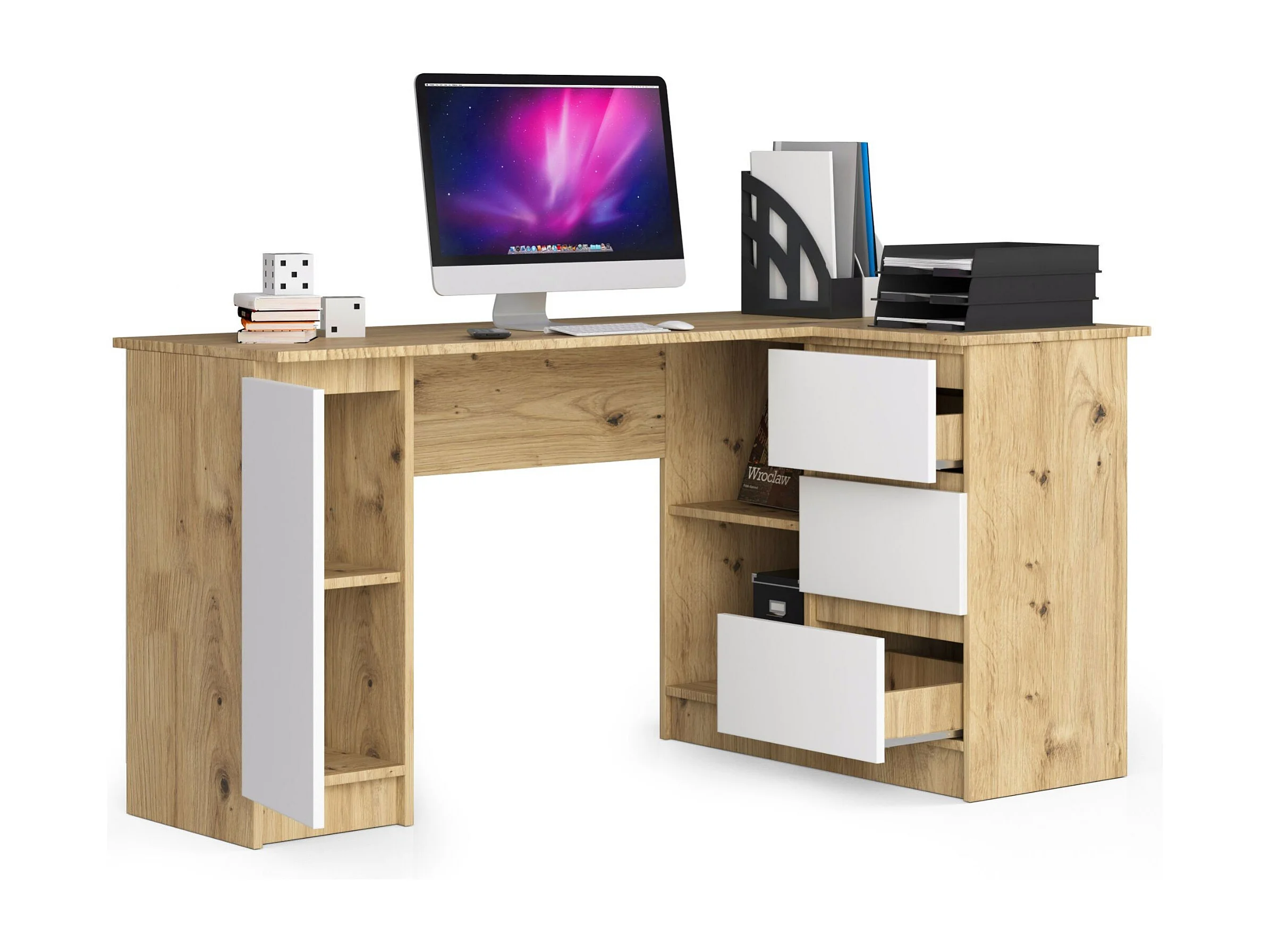 Grand bureau d'angle AKORD droit B20 Chêne Artisan 155 cm 1 porte 3 tiroirs façade Blanche 4 étagères 155x85x77 cm