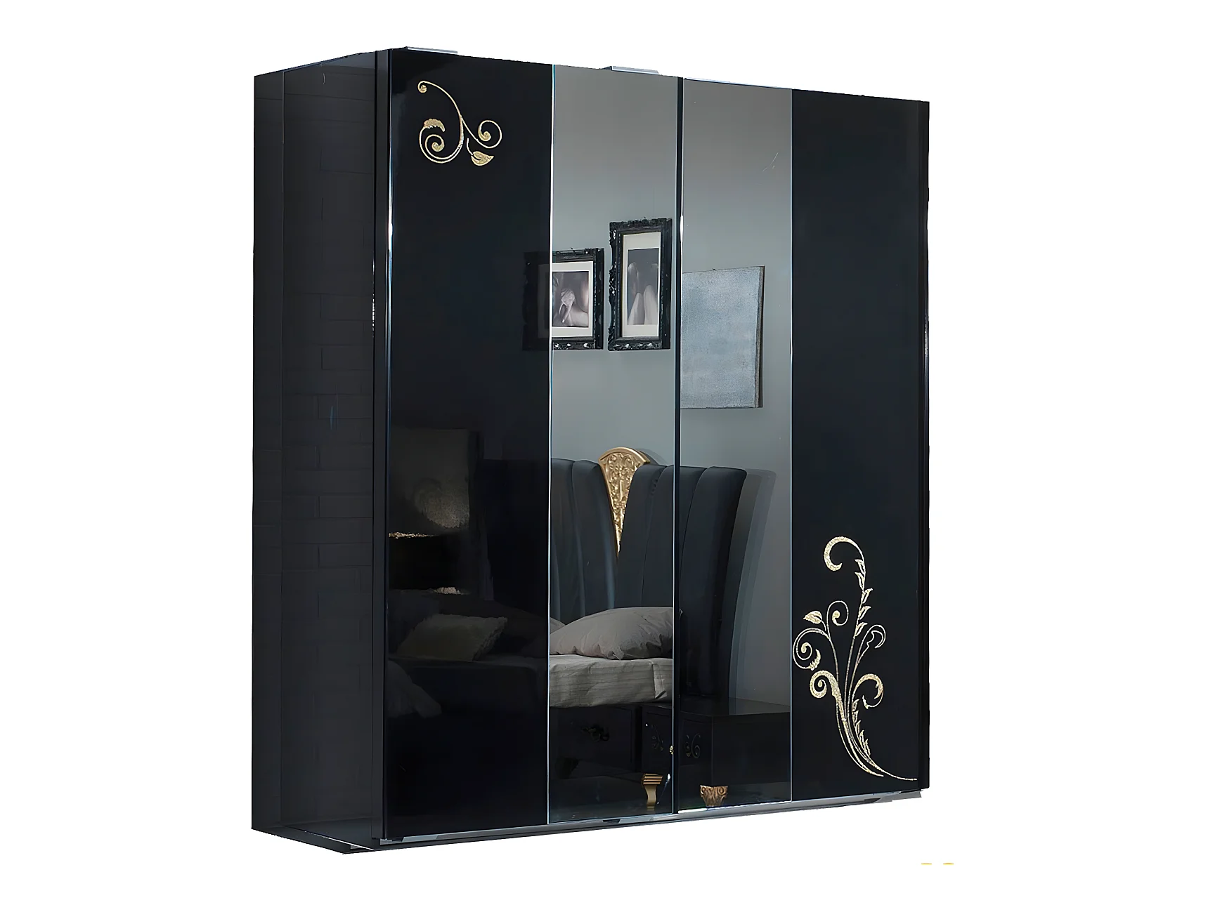 Armoire de chambre design 4 portes battantes bois noir laqué et métal doré Diamanto 182cm
