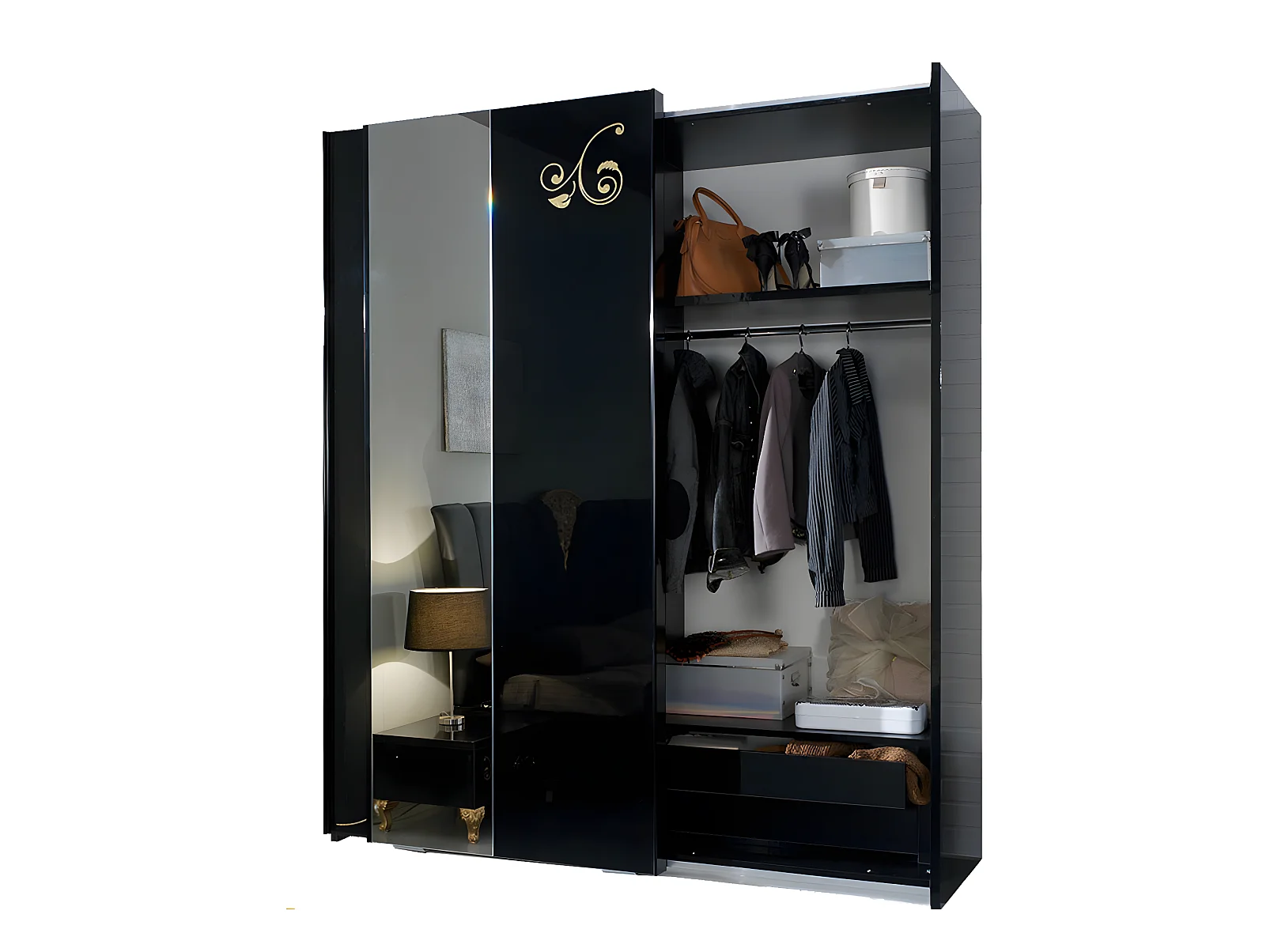 Armoire de chambre design 2 portes coulissantes bois laqué noir et doré Jade 182cm