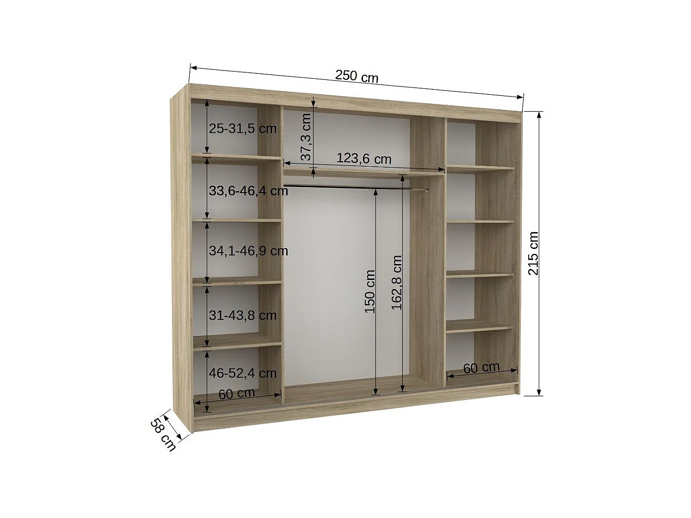 Grande armoire de chambre à coucher 3 portes coulissantes bois clair et miroir Dany 250cm