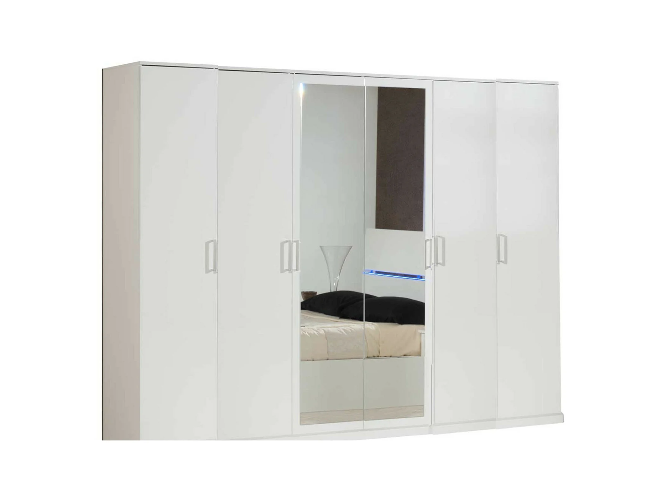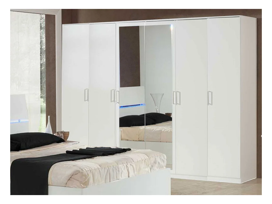 Grande armoire de chambre moderne 6 portes battantes bois blanc laqué et miroir Mona 272cm