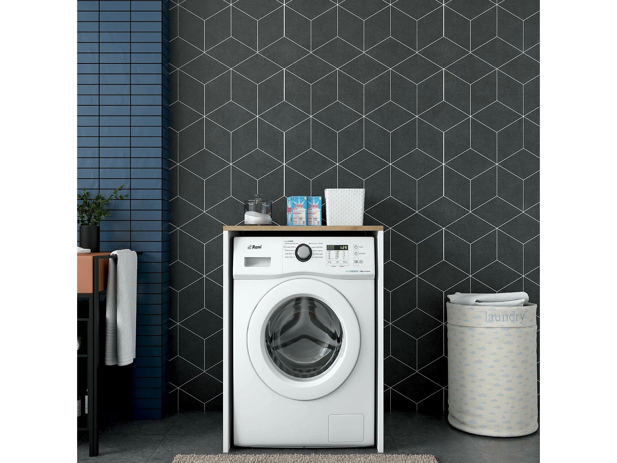 Panier à Linge SucceBuy Panier à Linge à 3 Compartiments avec Roulettes, Équipé d'un Sac Coulissant, d'un Plateau en Bois, de 2 Tiroirs et de Crochets