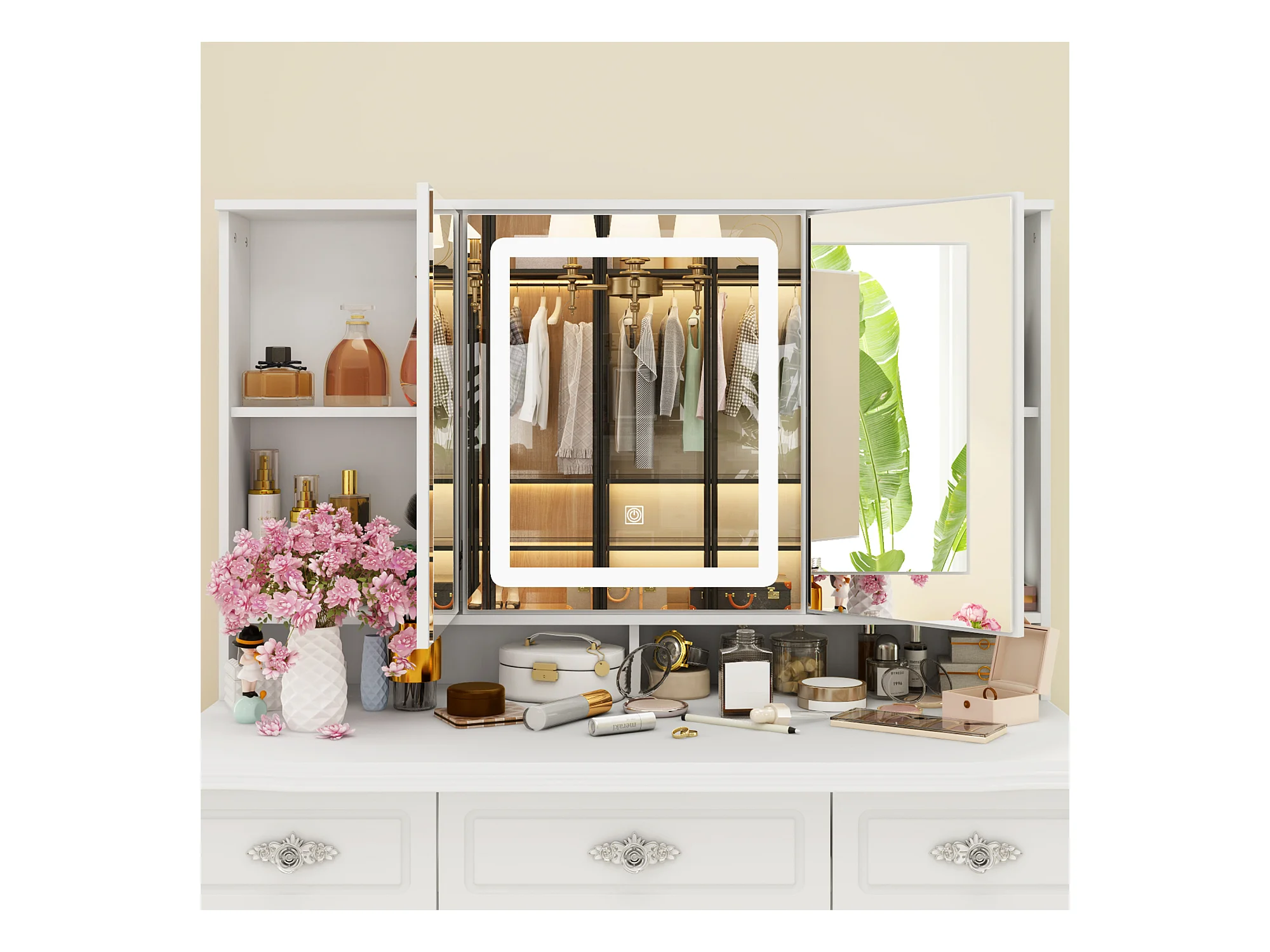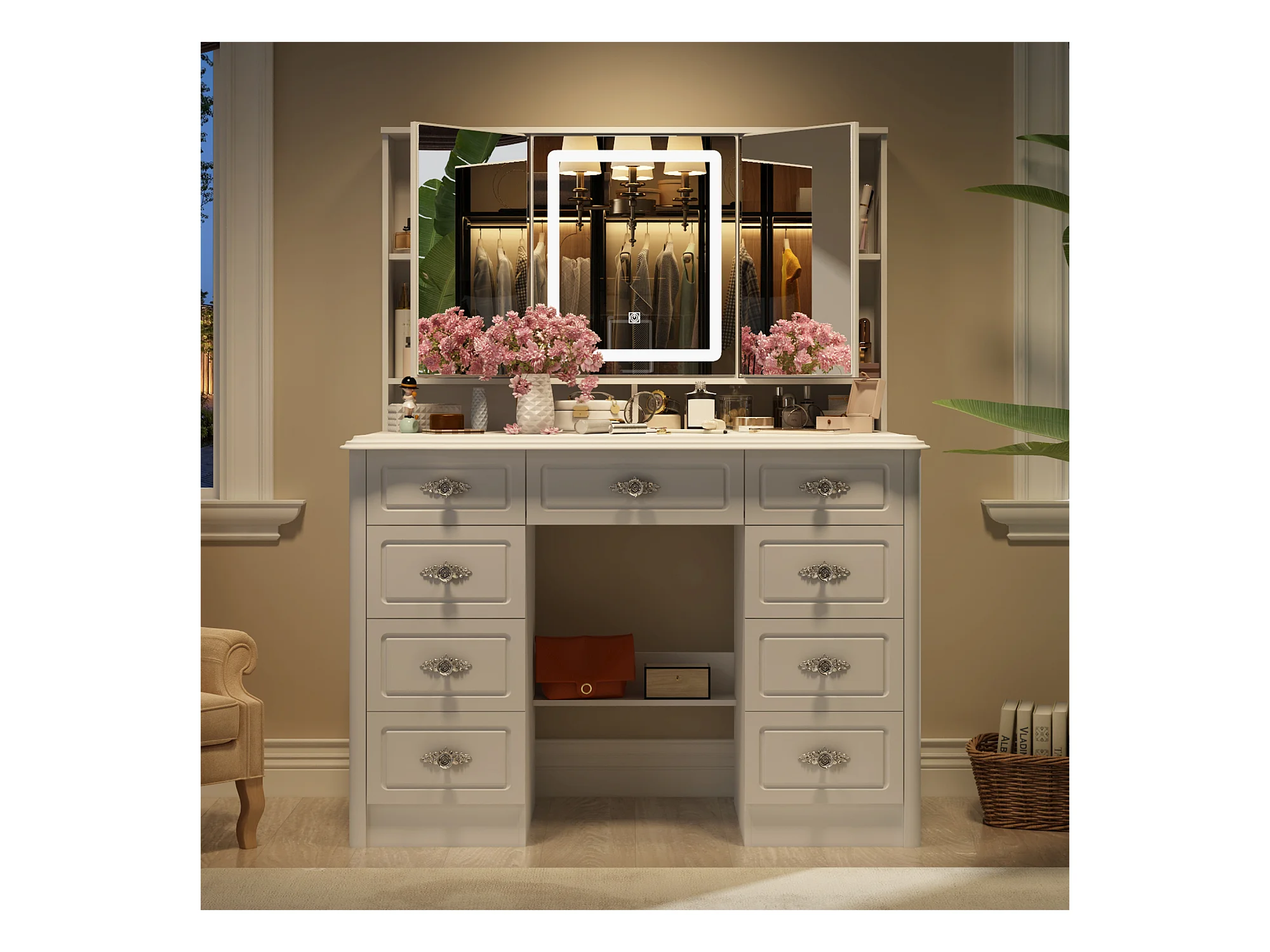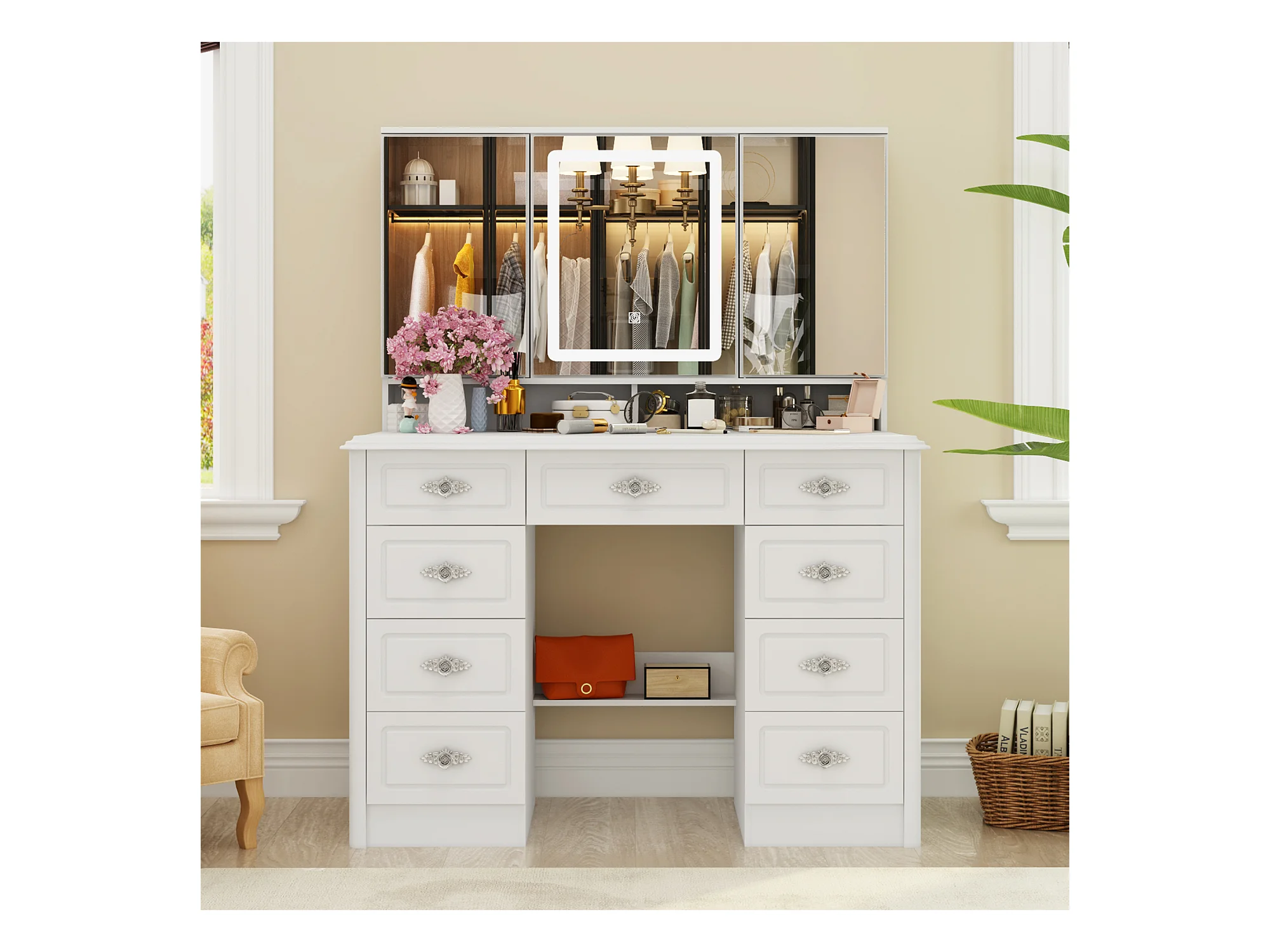 Coiffeuse avec éclairage LED et 3 miroir rectangulaire surdimensionné,Poignée en cristal,50x110x137cm,Blanc