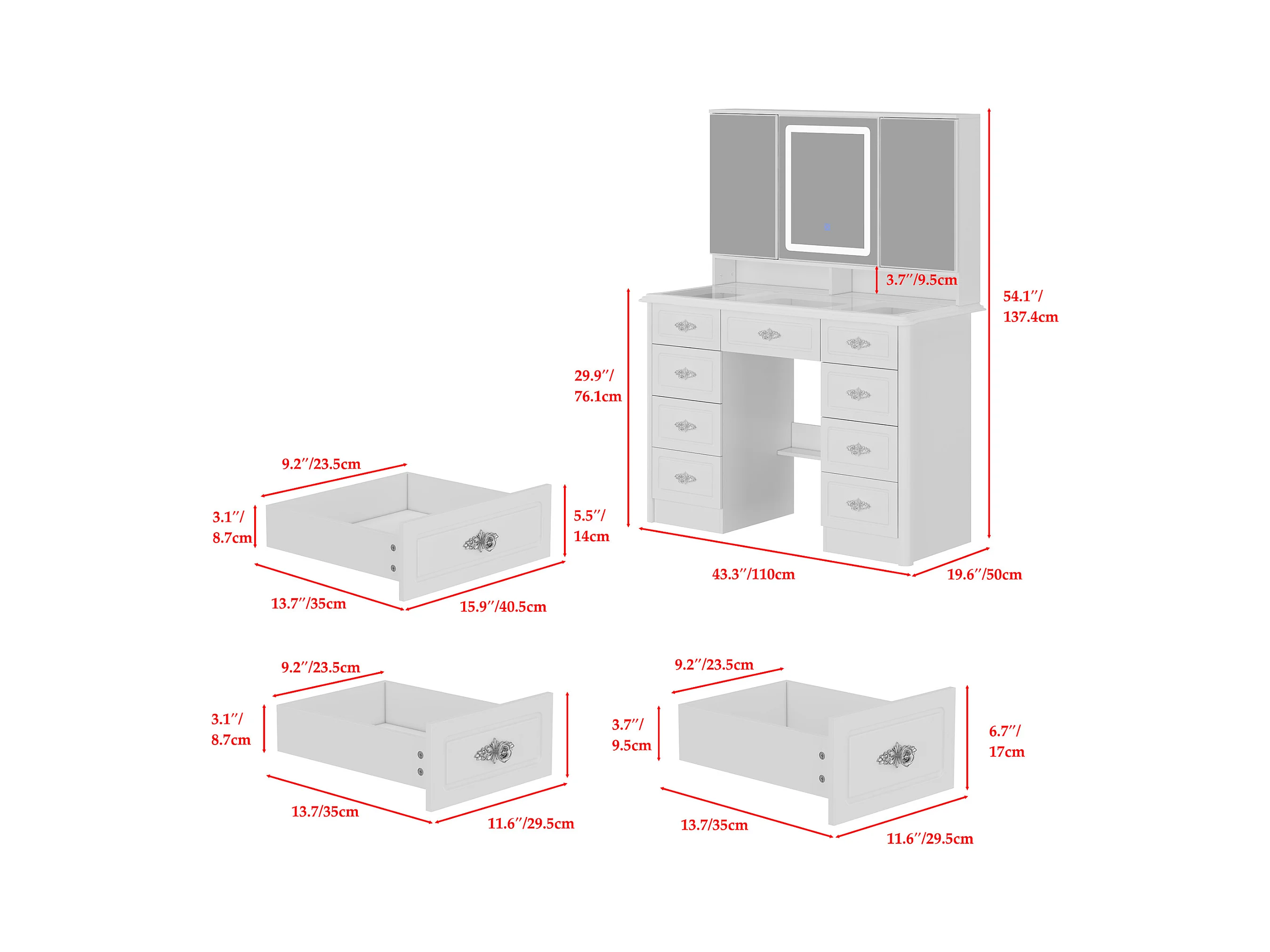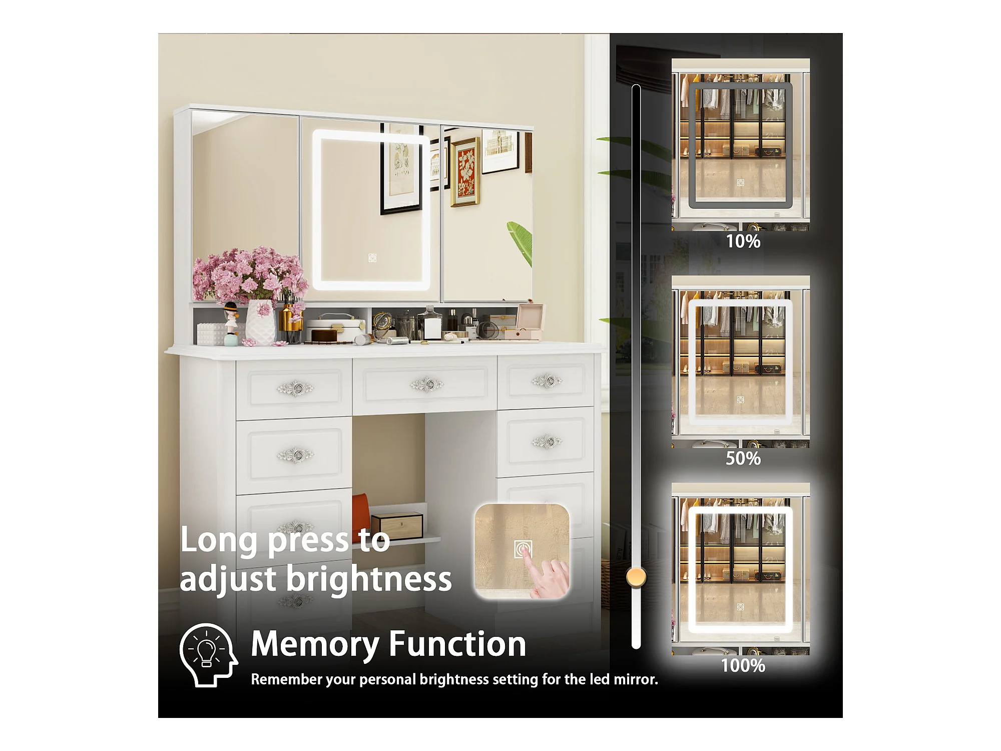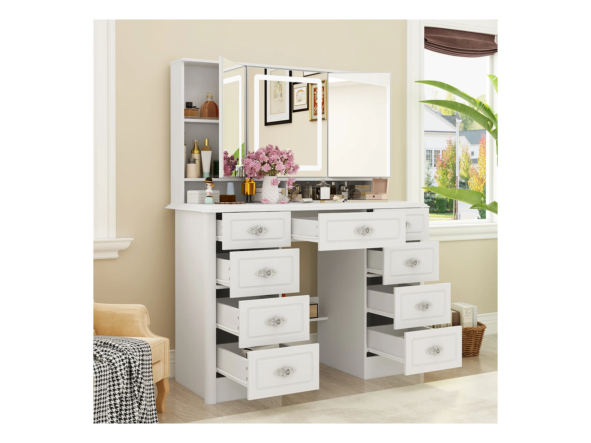Coiffeuse avec éclairage LED et 3 miroir rectangulaire surdimensionné,Poignée en cristal,50x110x137cm,Blanc