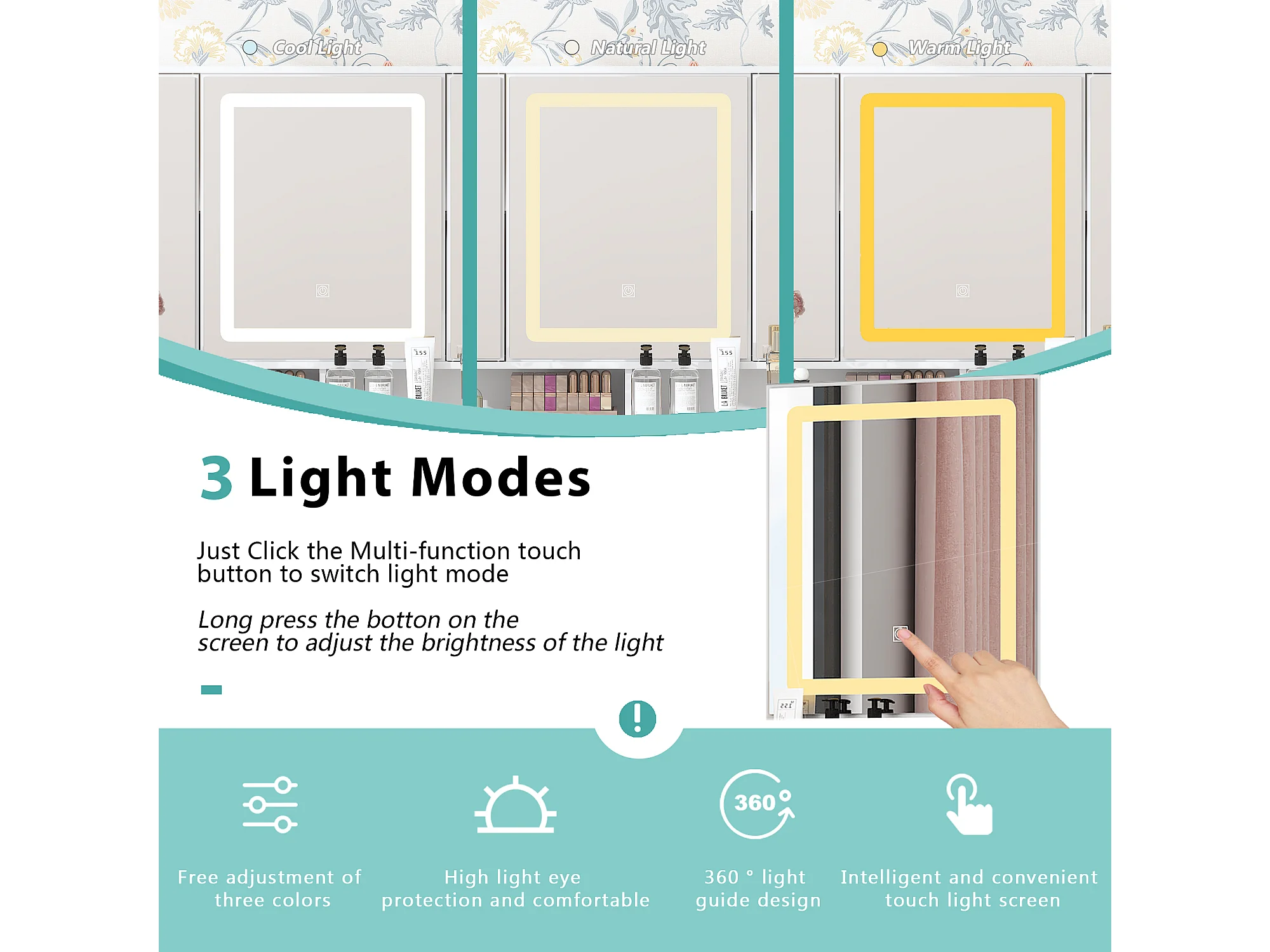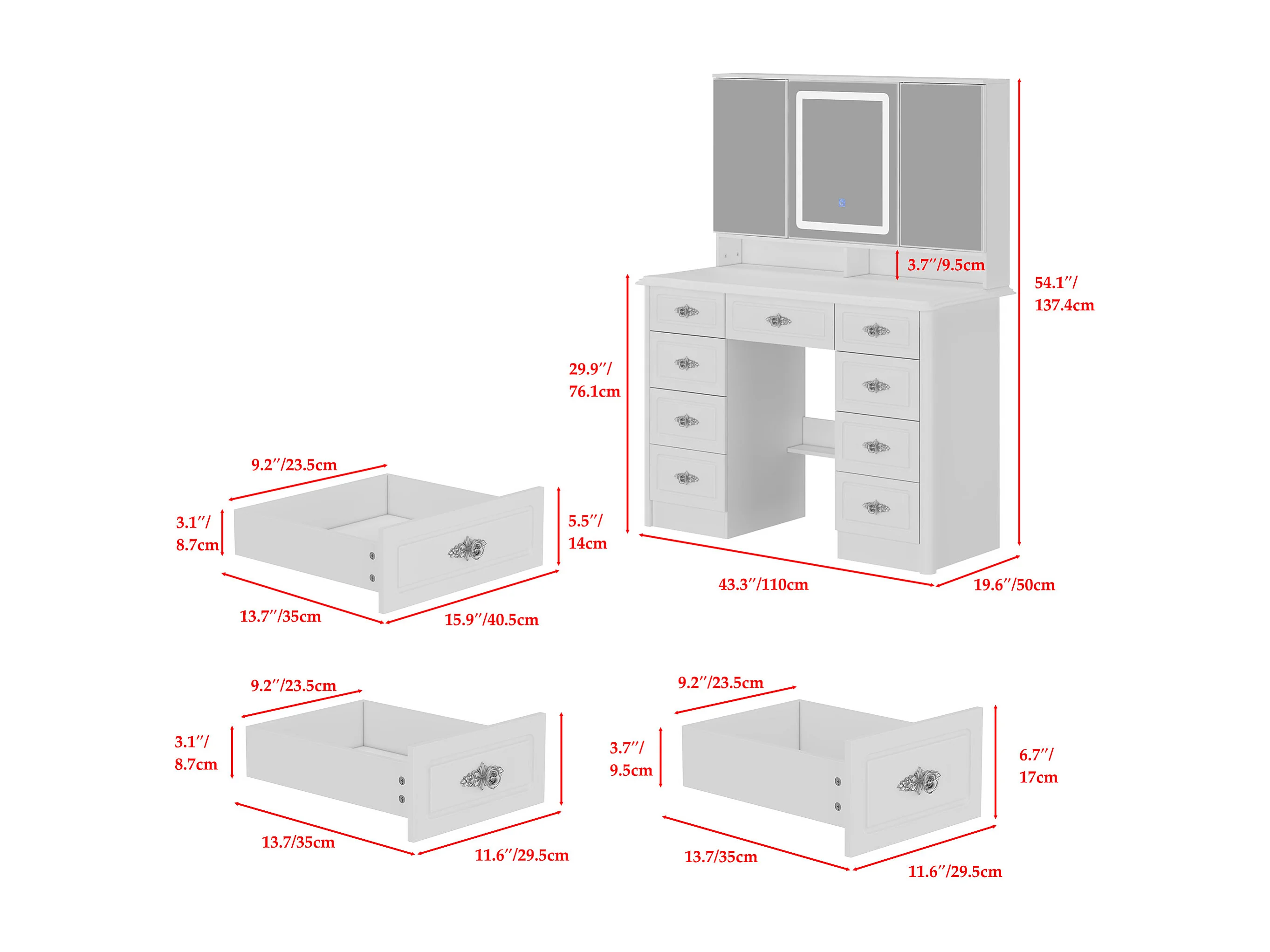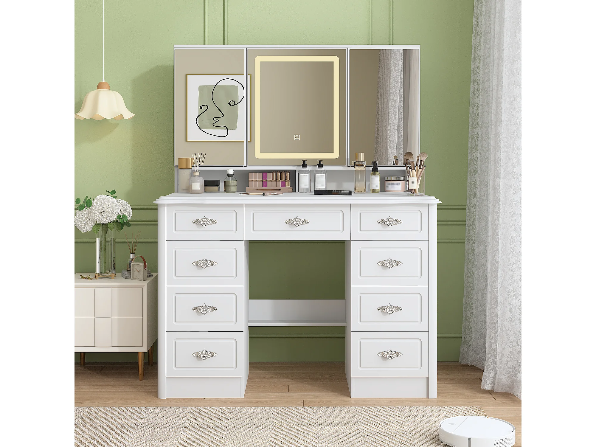Grande Coiffeuse avec Rectangulaire et Éclairage LED, Table de Maquillage avec 9 Tiroirs et Compartiments, 110 x 50 x 137, Blanc