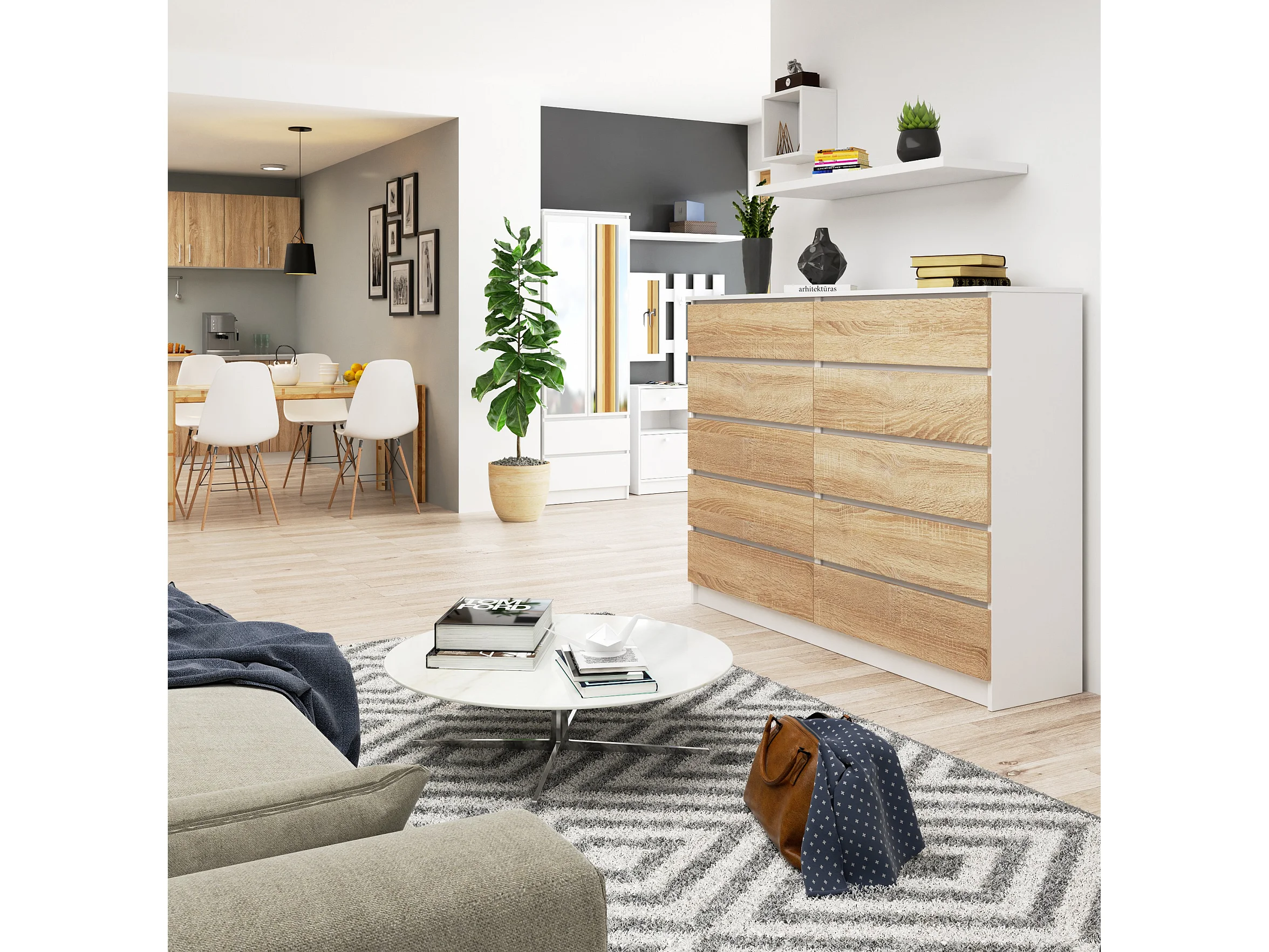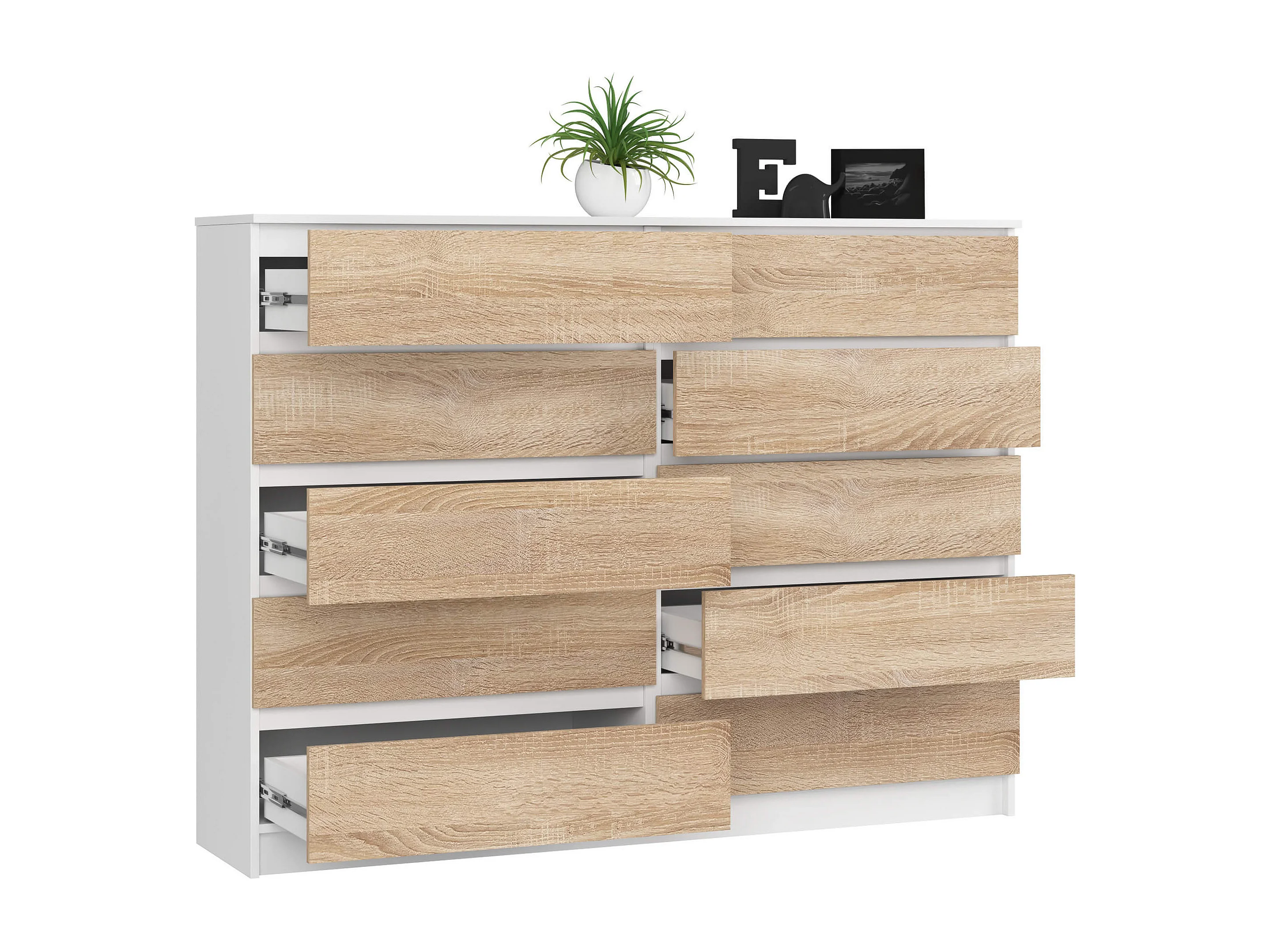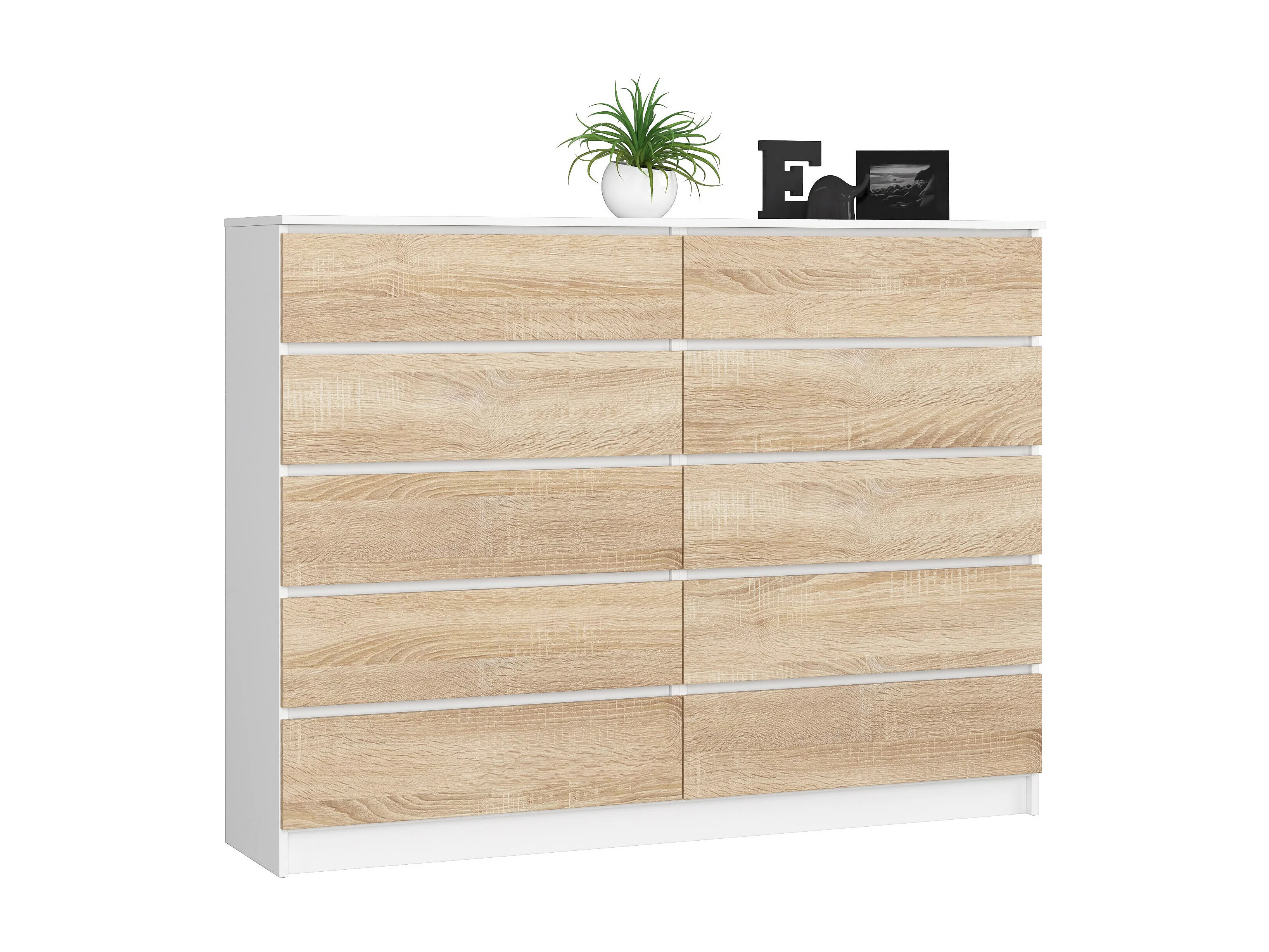 Grande Commode pour le salon AKORD K160 Blanche 160 cm 10 tiroirs façade Chêne Sonoma 160x40x121 cm