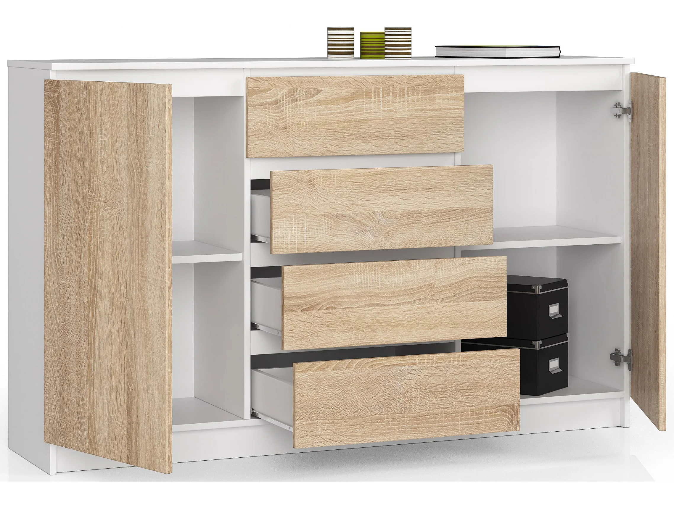 Grande Commode pour le salon AKORD K160 Blanche 160 cm 2 portes 4 tiroirs façade Chêne Sonoma 4 étagères 160x40x99 cm