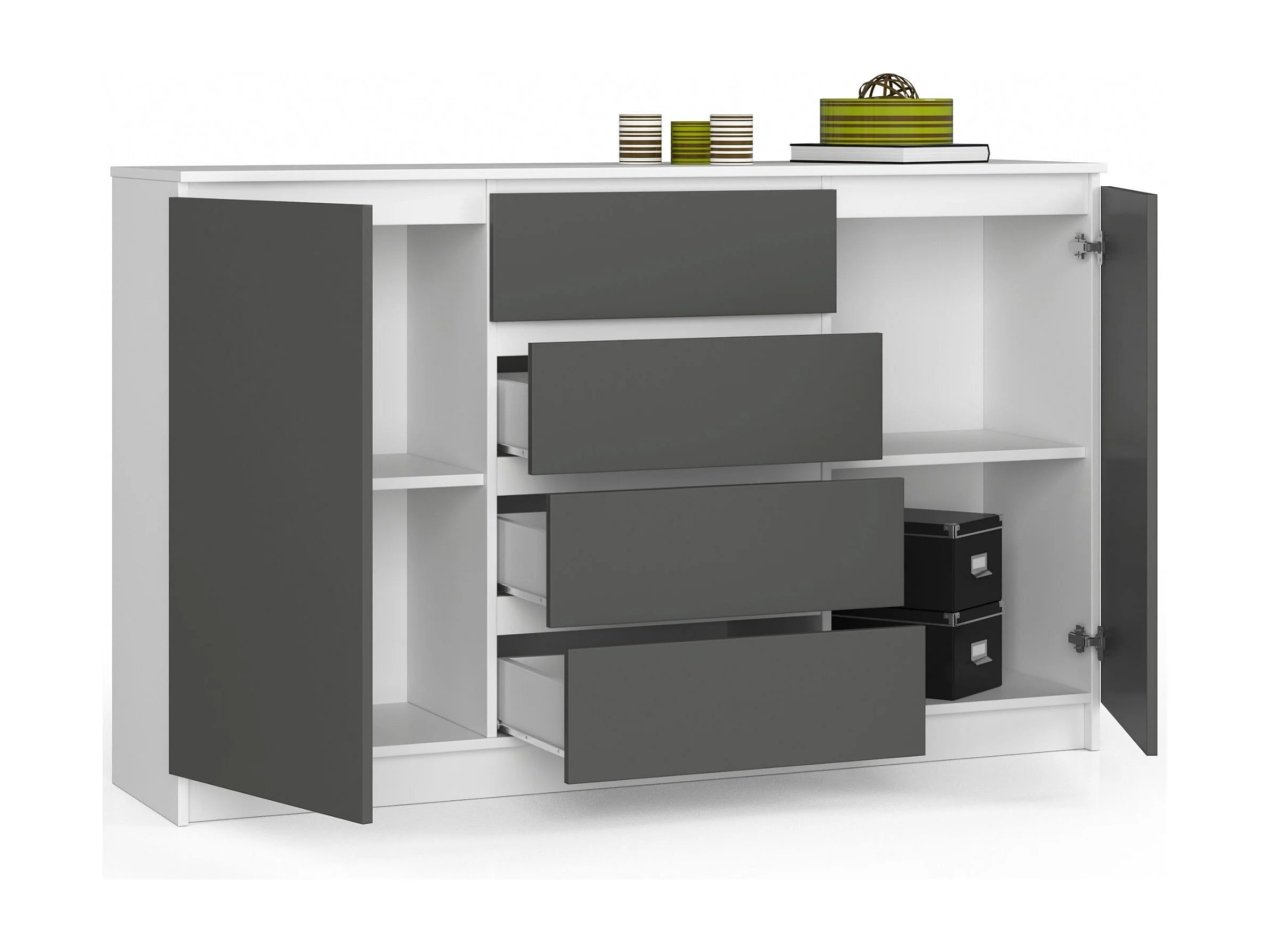 Grande Commode pour le salon AKORD K160 Blanche 160 cm 2 portes 4 tiroirs façade Gris Graphite 4 étagères 160x40x99 cm