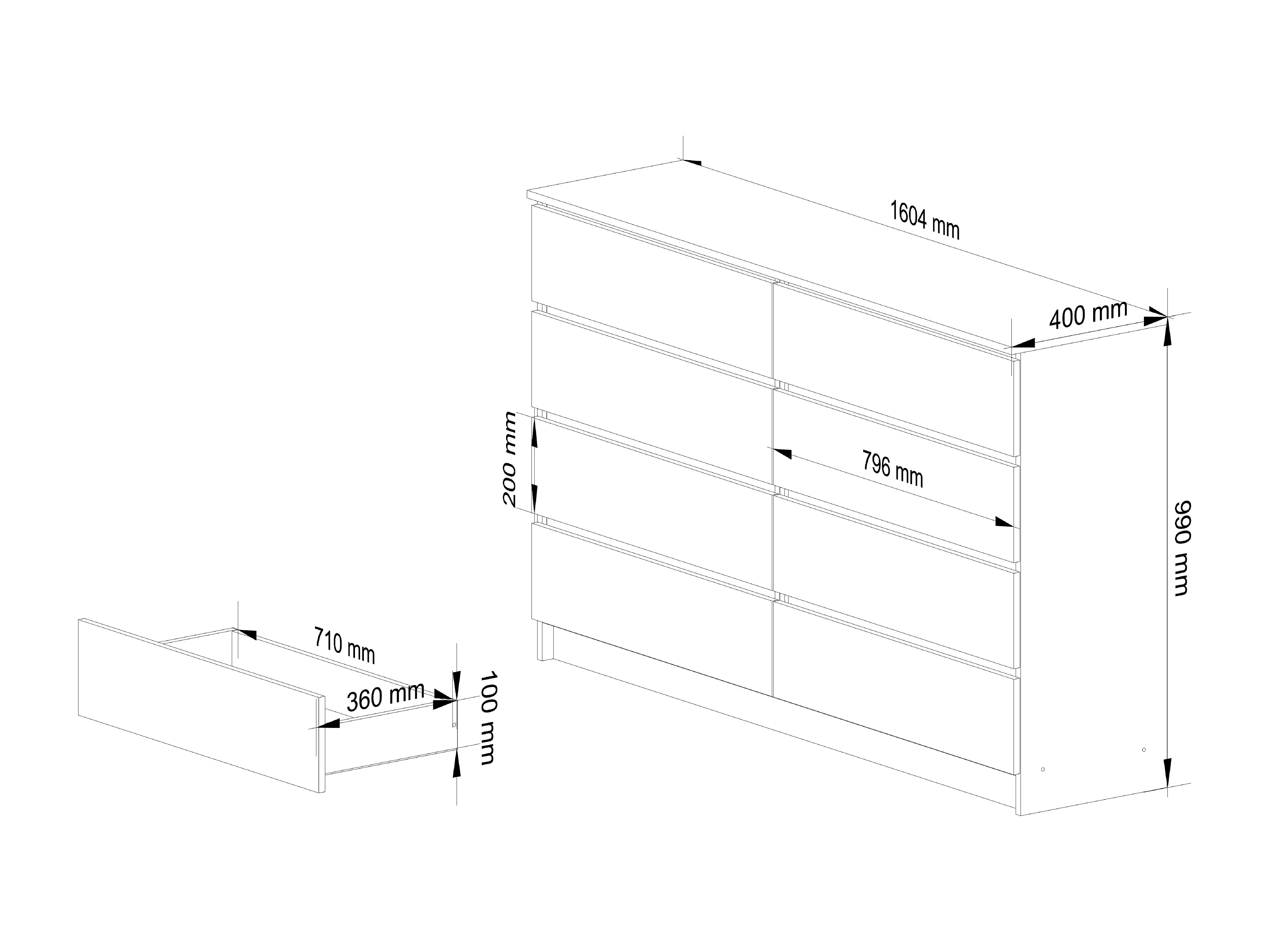 Grande Commode pour le salon AKORD K160 Chêne Artisan 160 cm 8 tiroirs façade Blanche 160x40x99 cm