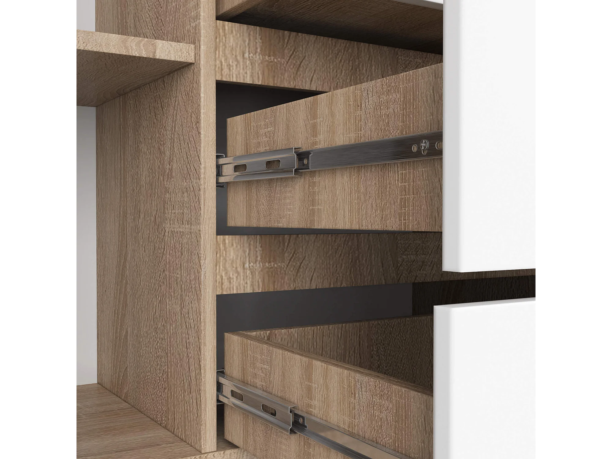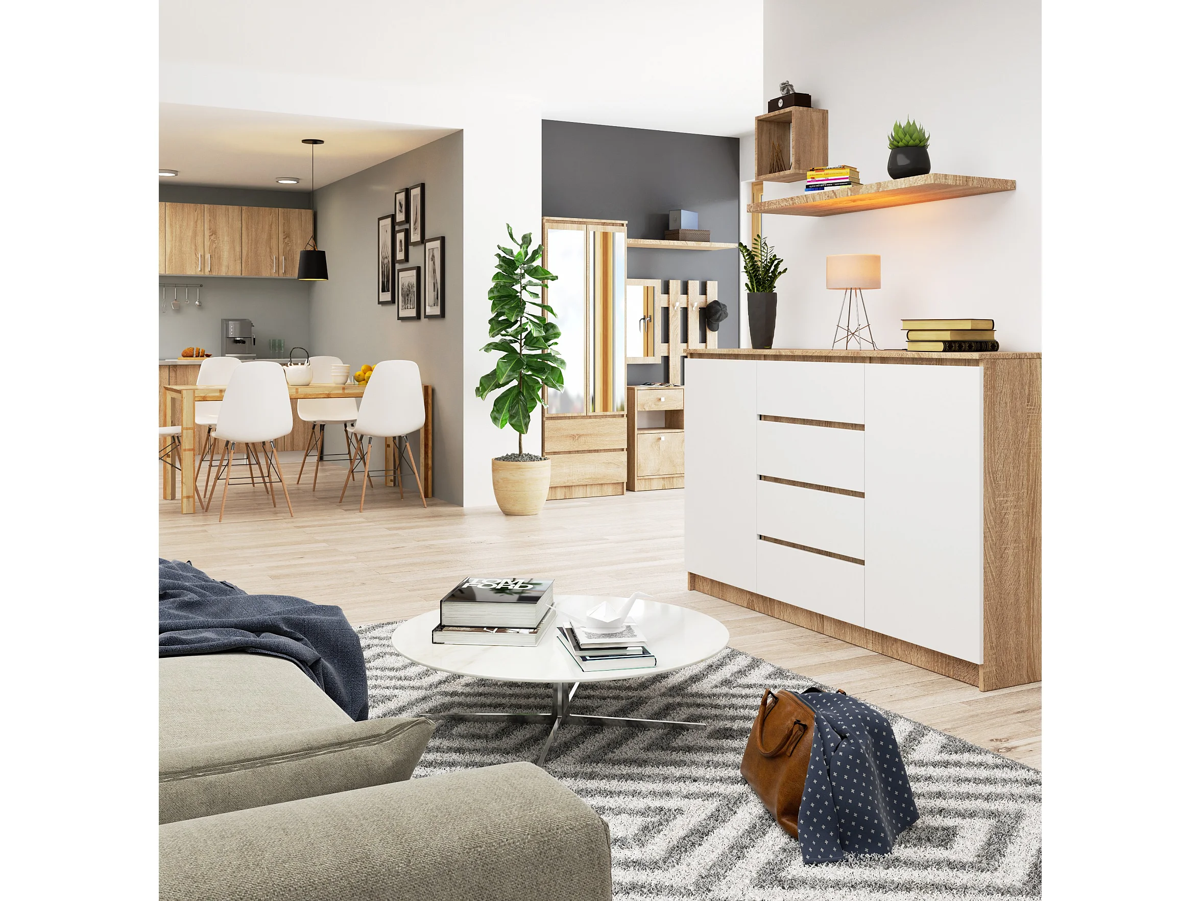 Grande Commode pour le salon AKORD K160 Chêne Sonoma 160 cm 2 portes 4 tiroirs façade Blanche 4 étagères 160x40x99 cm