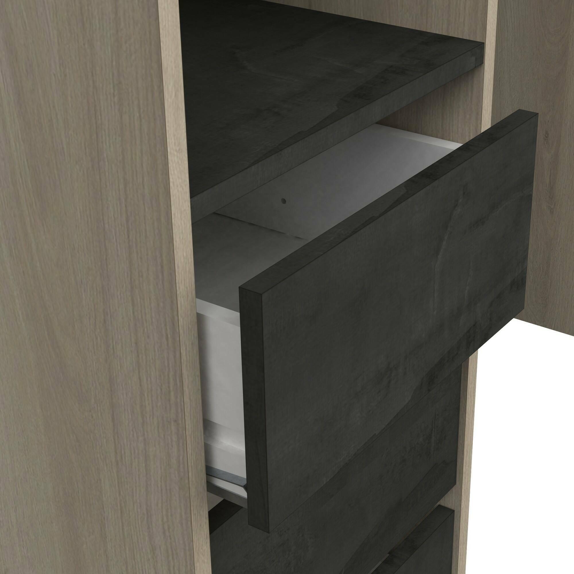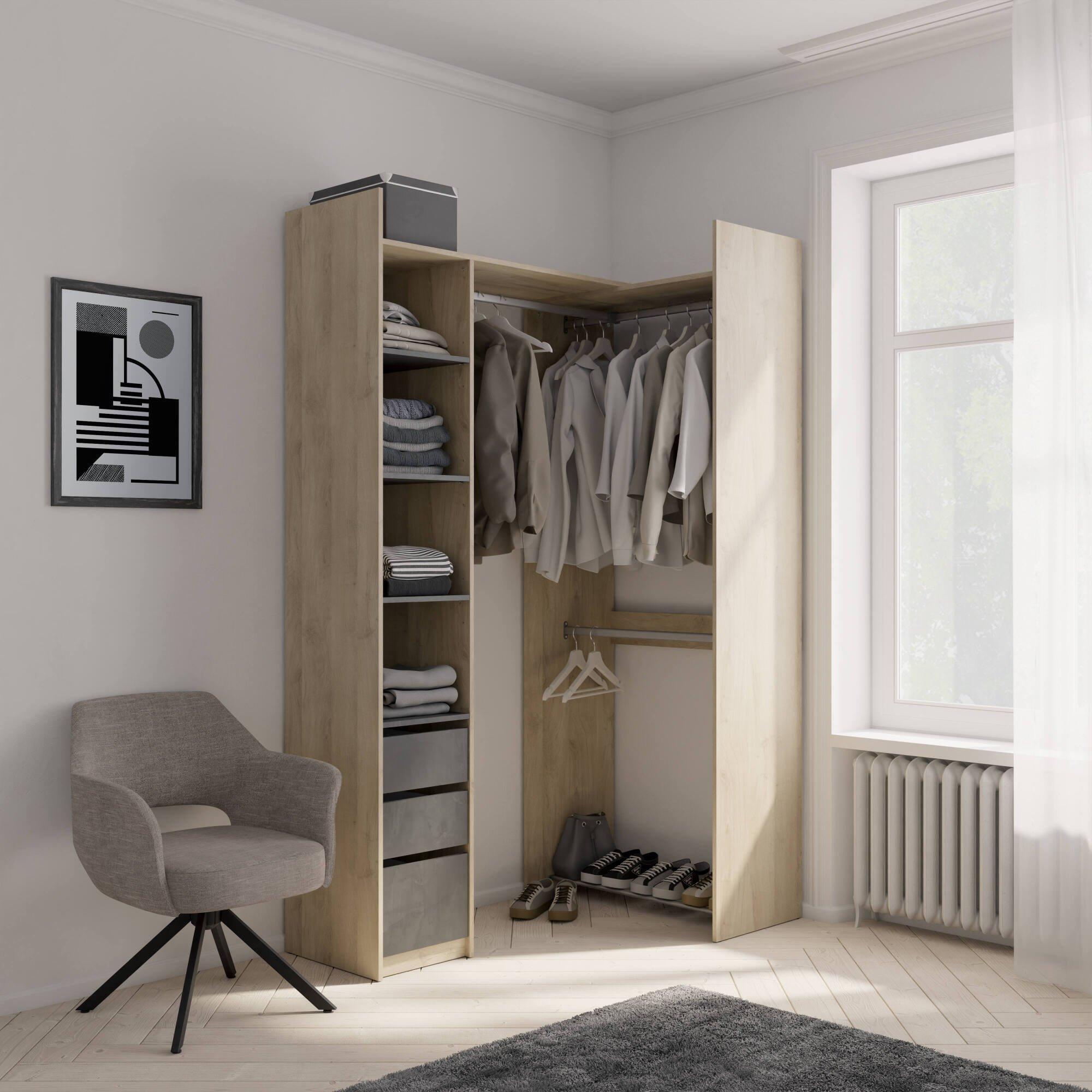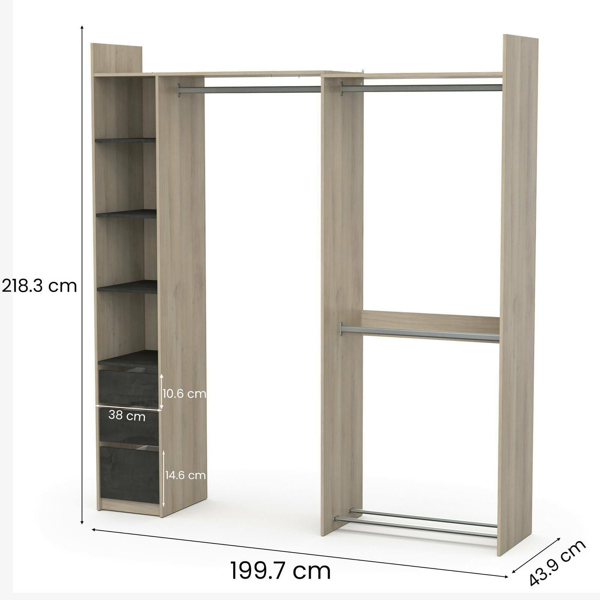 GRANDE GARDE-ROBE - Meubles de chambre, Dressing, Armoire à vêtements, 200x44 h218 cm, Chêne.STRUCTURE ET UTILISATION - Armoire-penderie polyvalente idéale pour garantir un grand espace de rangement, adaptée pour contenir des vêtements, des chaussures et des accessoires - Toute la structure design du meuble est multifonctionnelle, parfaite pour meubler une chambre double, une chambre d'enfant ou chambre d'amis - Solution élégante qui vous permet d'organiser vos vêtements avec style, offrant de grands espaces et des fonctionnalités conçues pour répondre aux besoins de rangement, tout en ajoutant une touche de raffinement et d'ordre à votre environnement domestique.QUALITÉ ET DESIGN - Objet d'ameublement au design moderne et élégant, parfait pour meubler un environnement contemporain et lumineux - Idéal pour ceux qui recherchent des solutions fonctionnelles et peu encombrantes, ce produit est parfait pour les maisons et appartements de toutes tailles - Deux -temps de garantie années à compter de la date d'achat.CARACTÉRISTIQUES TECHNIQUES - Complément d'ameublement polyvalent, conçu pour une intégration facile avec d'autres meubles - Emballage résistant, conçu pour le commerce électronique - Matériau : panneau de particules mélaminé de 15 mm - Informations complémentaires : Ensemble d'armoires d'angle extensibles, 1 colonne, 3 tiroirs sur roulettes, 3 caissons (charge maximale : 21 kg) en aggloméré de 15 mm - 3 étagères réglables sur 3 niveaux - Charge maximale : 2 kg - Charge maximale : 3 kg - Avec emballage renforcé.DIMENSIONS EN CM - Grande armoire : Longueur : 199,7 Largeur : 43,9 Hauteur : 218,3 - Dimensions supplémentaires : Dimensions utiles des 2 tiroirs supérieurs : 29,2 x 38,7 x 10,6 cm - Fond de tiroir : 29,2 x 38,7 x 14,6 cm