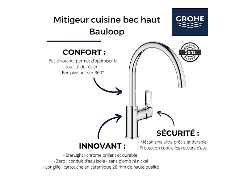 GROHE Mitigeur cuisine Bauloop Bec haut chrome levier carré