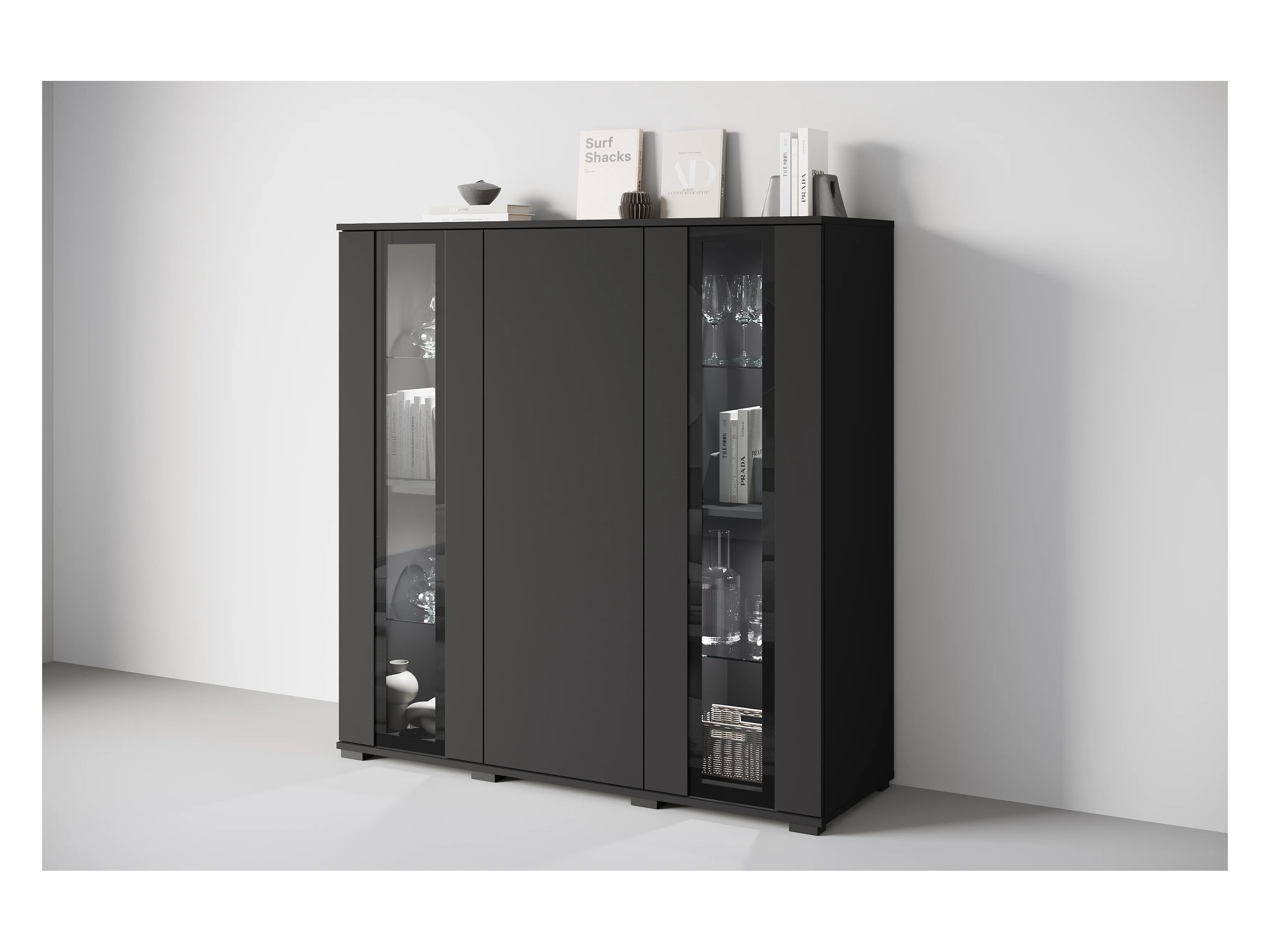 Commode 150 cm avec LED pour salon – vitrine moderne avec vitrages, noir mat