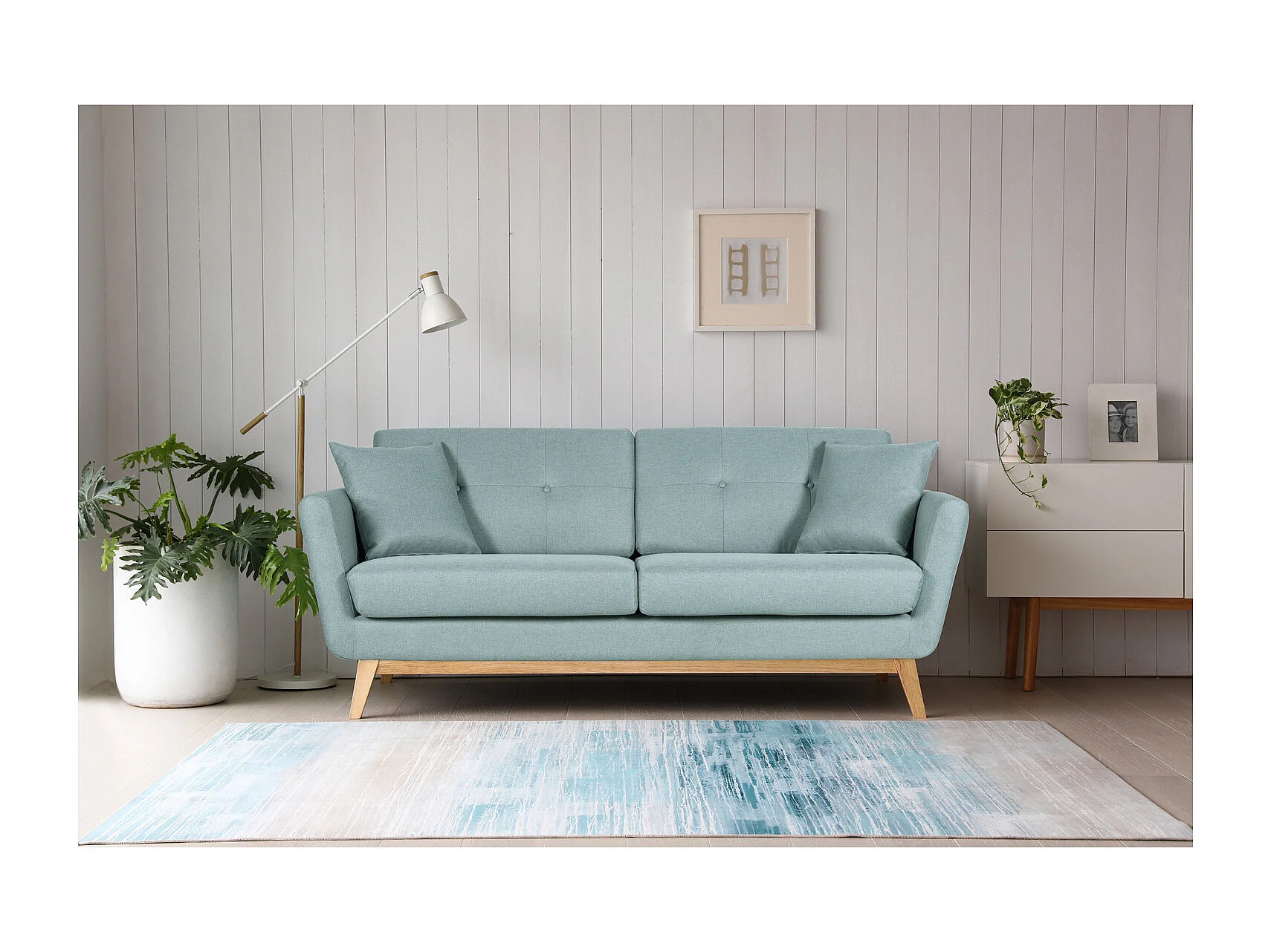 Canapé scandinave 3 places et 2 coussins en tissu vert d'eau HOGA