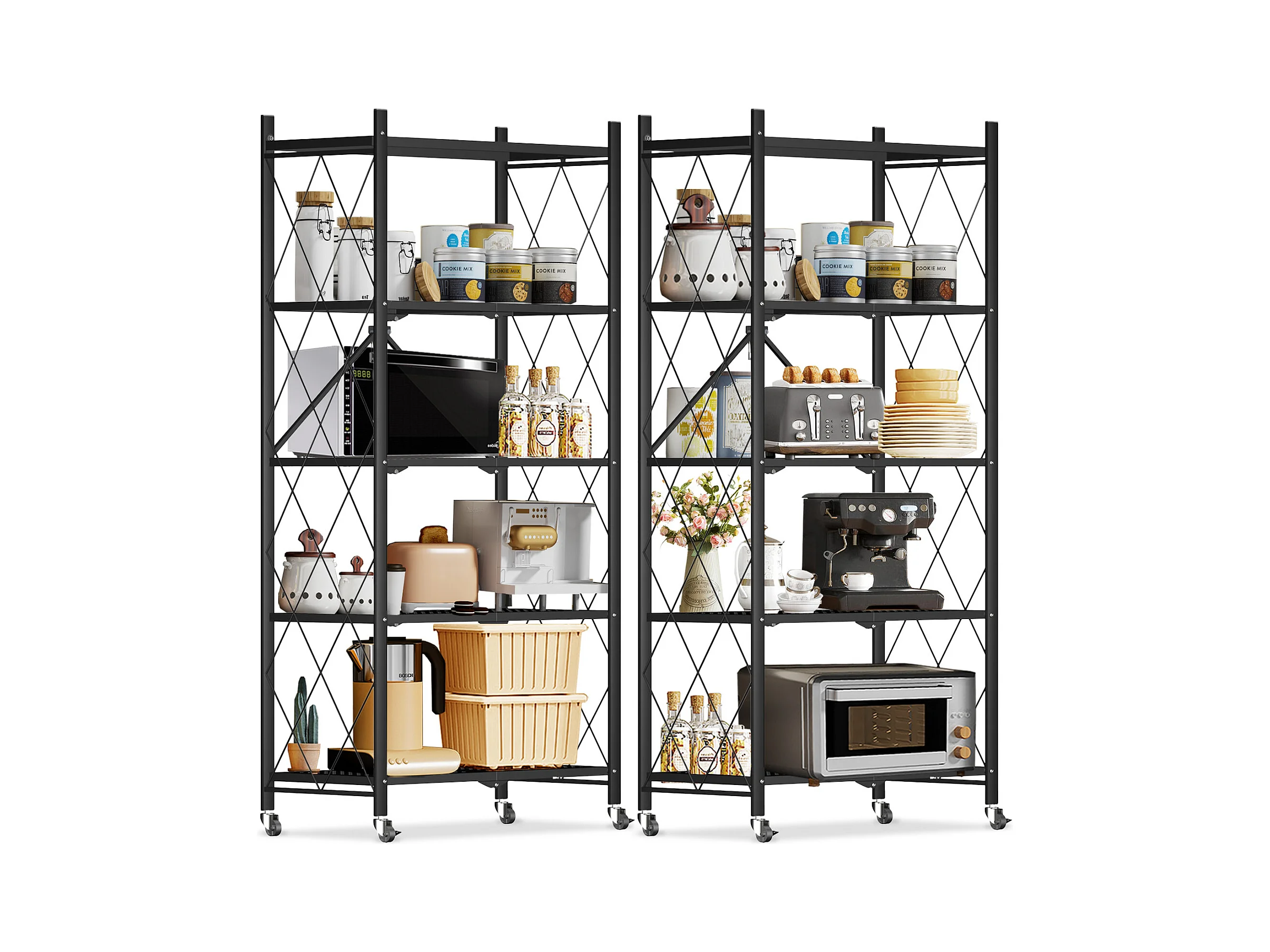 HomeMiYN Lot de 2 Étagères de Rangement Pliables 4 à 5 Niveaux - Étagères Multifonctionnelles à Roulettes 71x34x159 cm, Noir