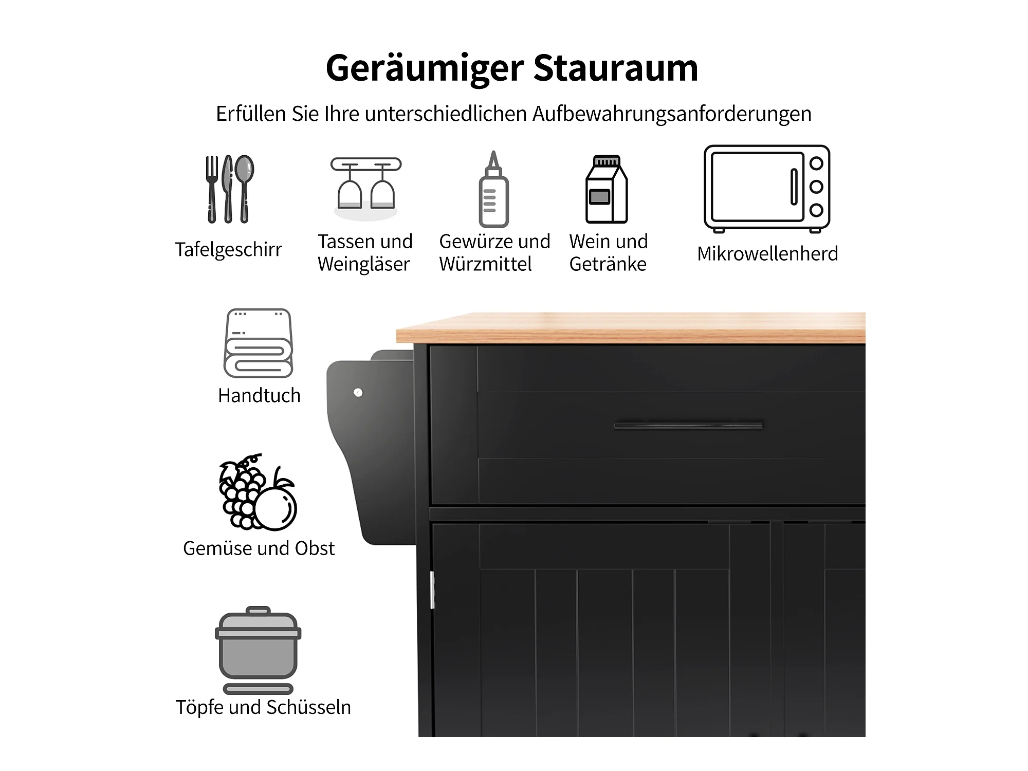Îlot central à roulettes - 129 x 46 x 92 cm - avec 1 porte + 2 tiroirs - MDF - noir
