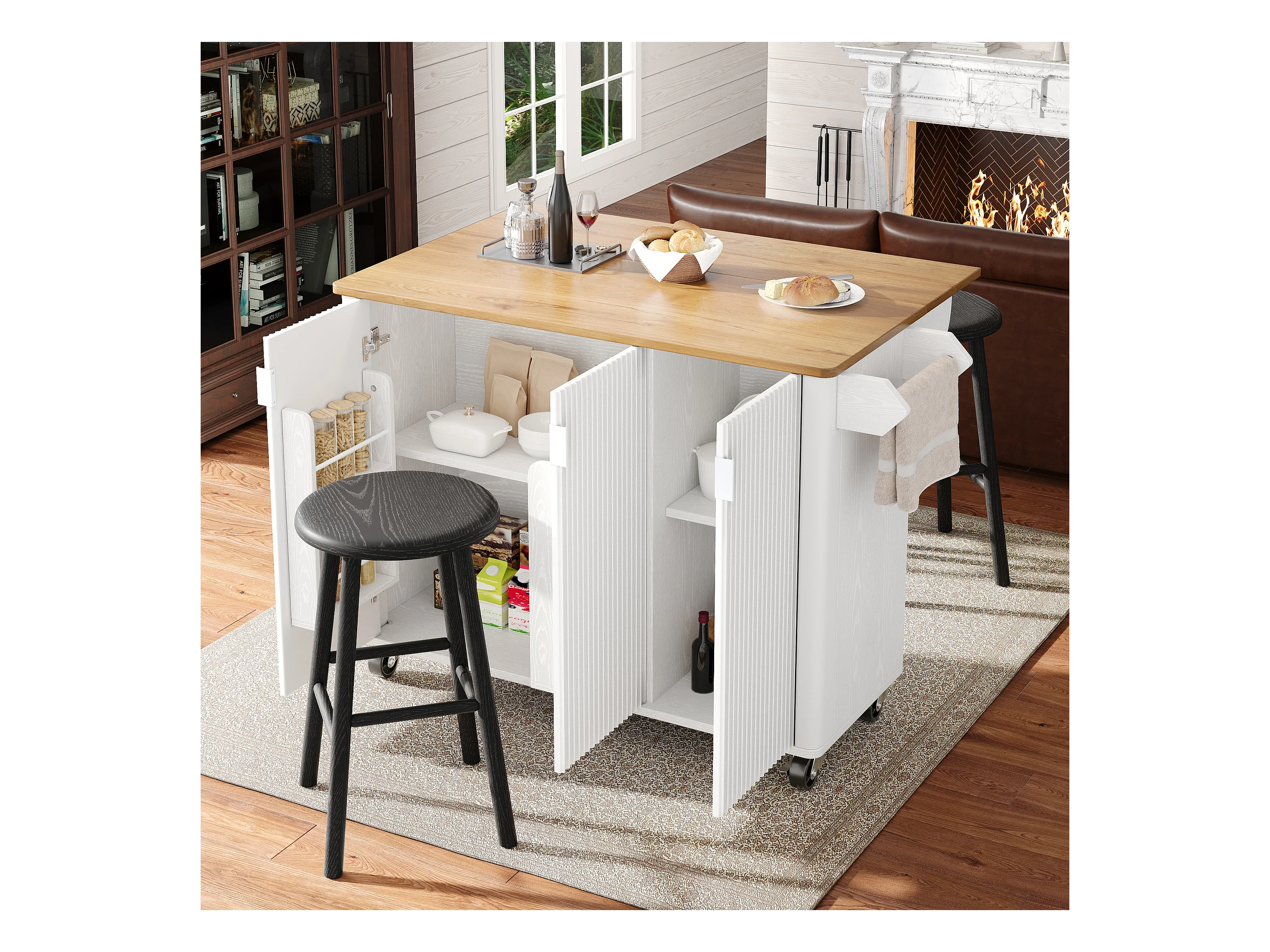 Îlot central avec plan de travail rabattable - 137 x 45/70 x 89.5 cm - avec 2 tiroirs + 3 portes - MDF - blanc