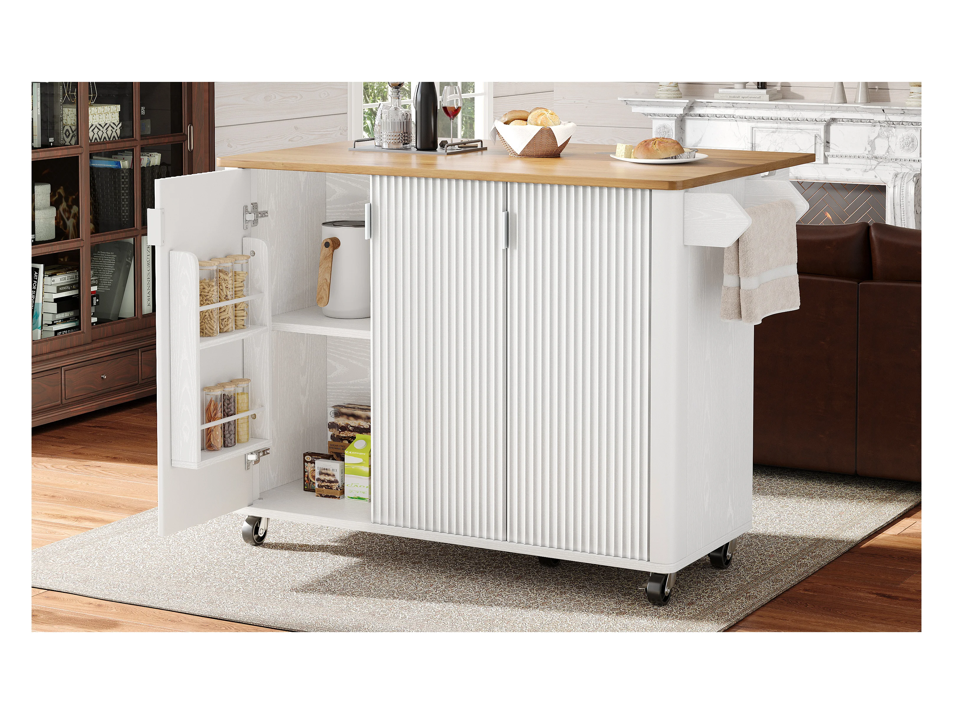 Îlot central à roulettes - 130 x 45/75 x 92 cm - desserte extensible + 3 portes - MDF - blanc