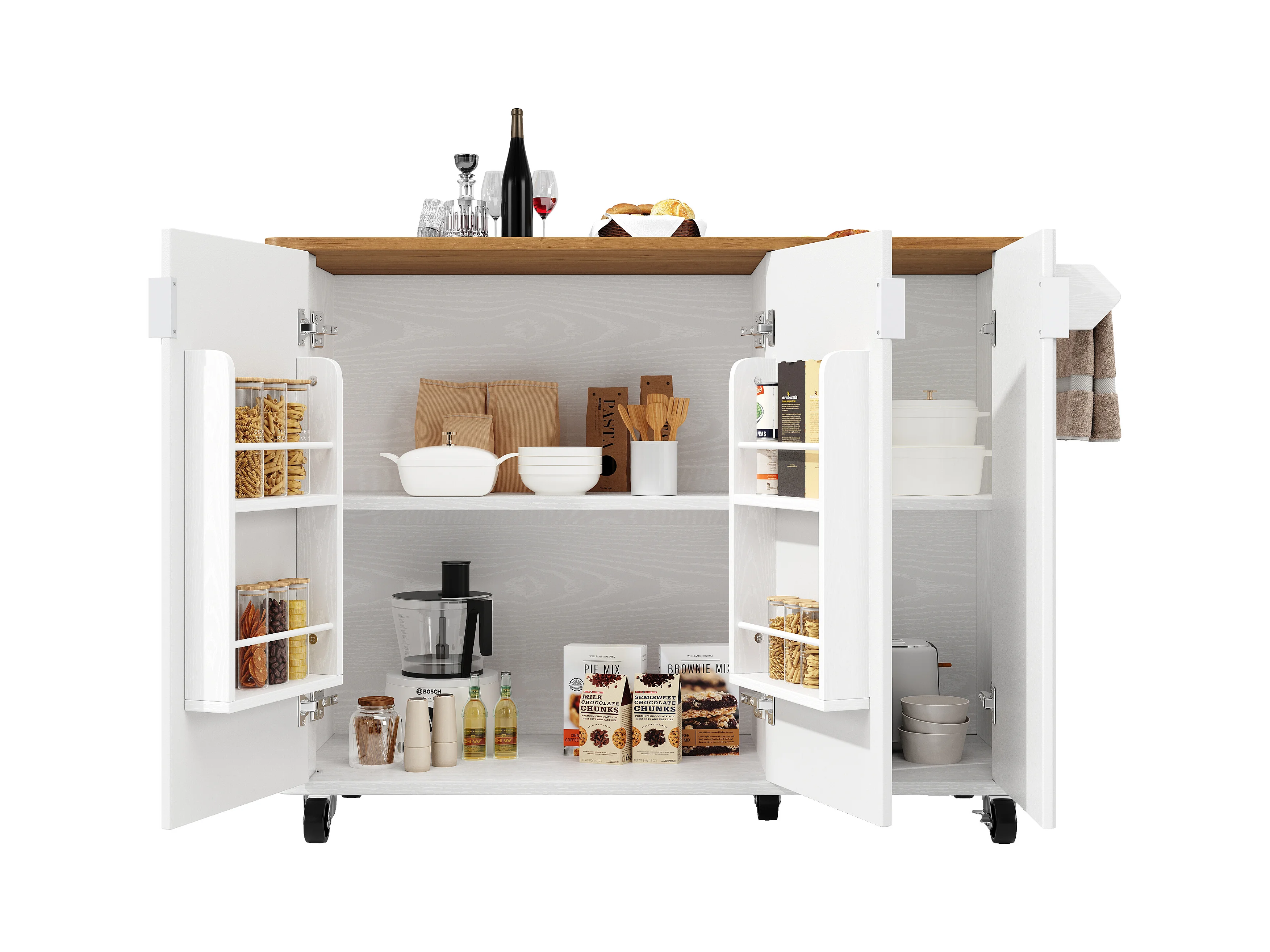Îlot central à roulettes - 140 x 40 x 93.5 cm - avec plan de travail + 2 portes + 2 tiroirs -MDF - blanc