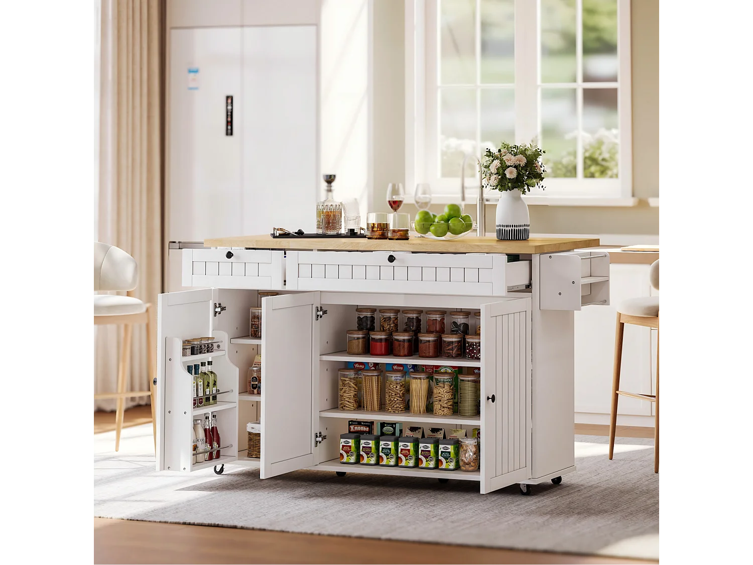 Îlot central avec plateau rabattable, 6 roulettes freinées et 2 tiroirs de rangement - blanc