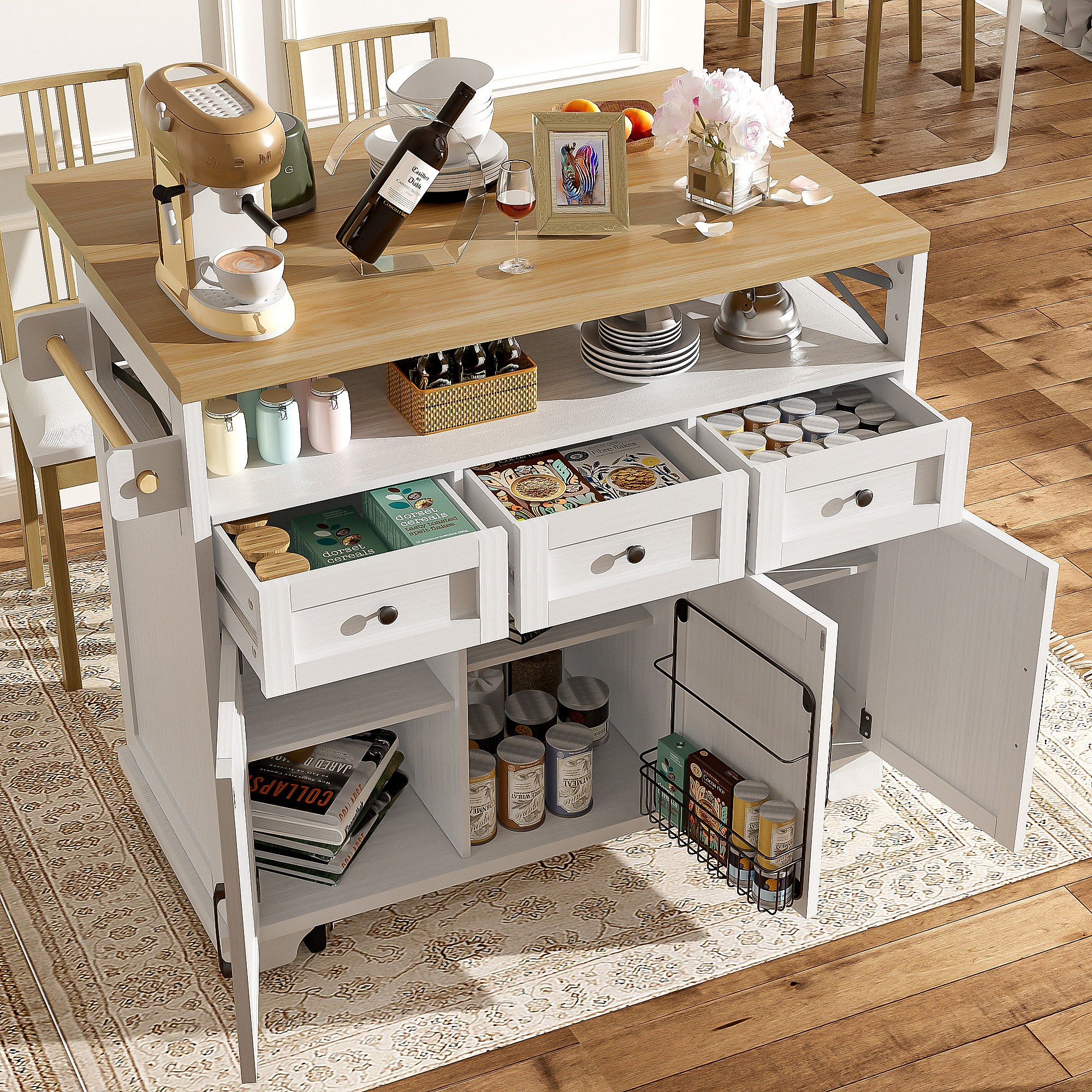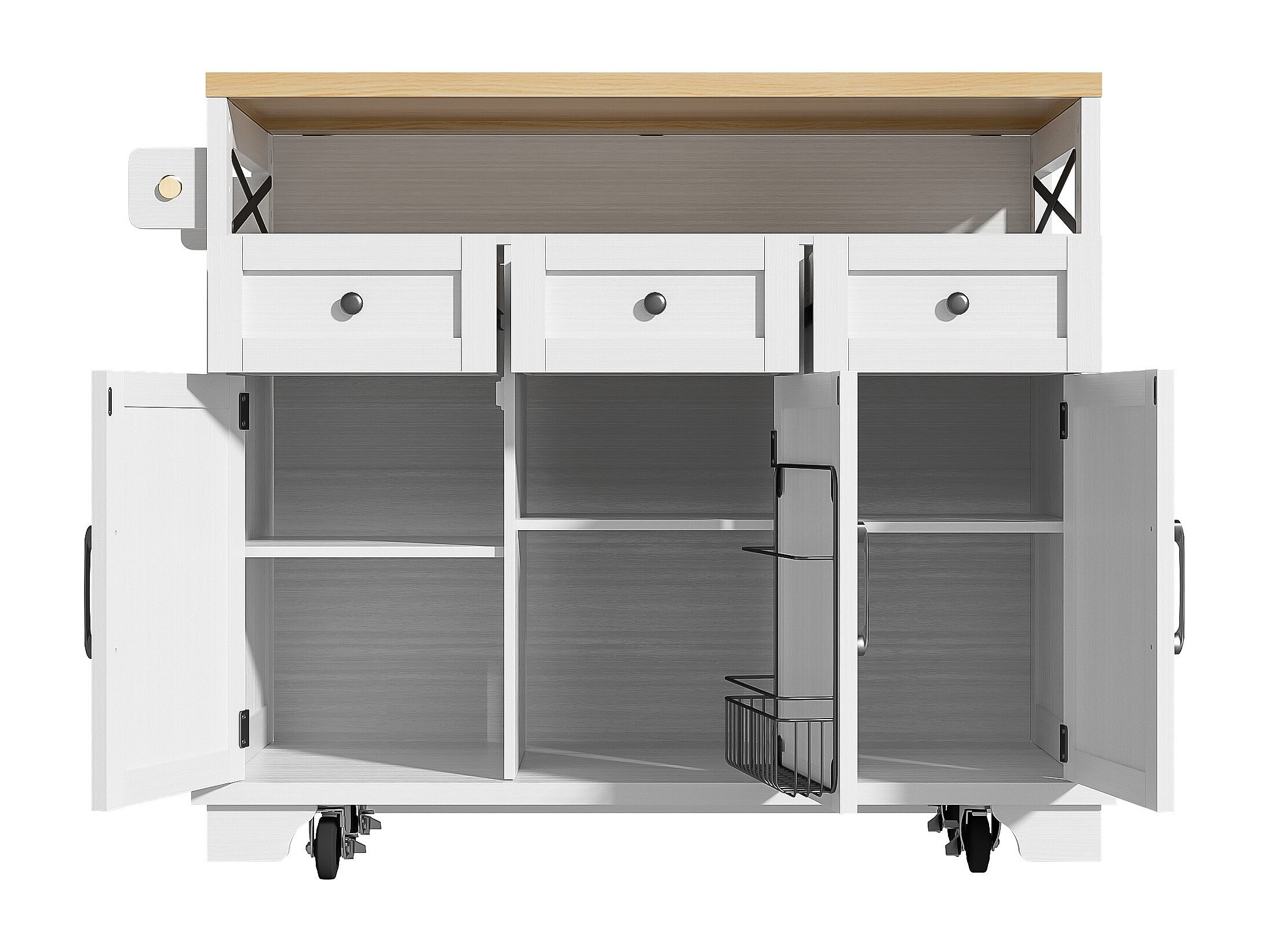 Îlot central blanc avec comptoir en grain de bois, 3 tiroirs de rangement et 3 portes