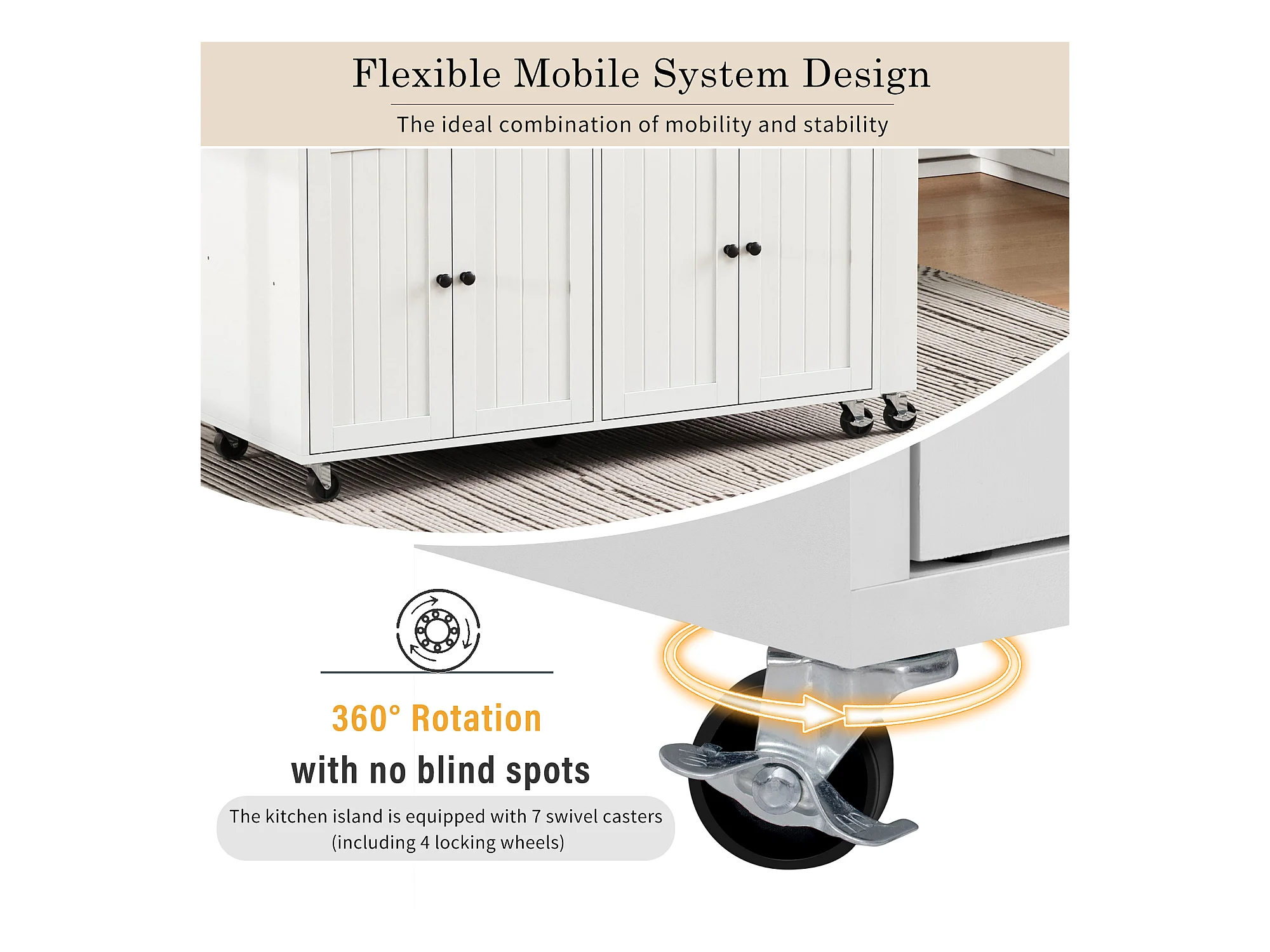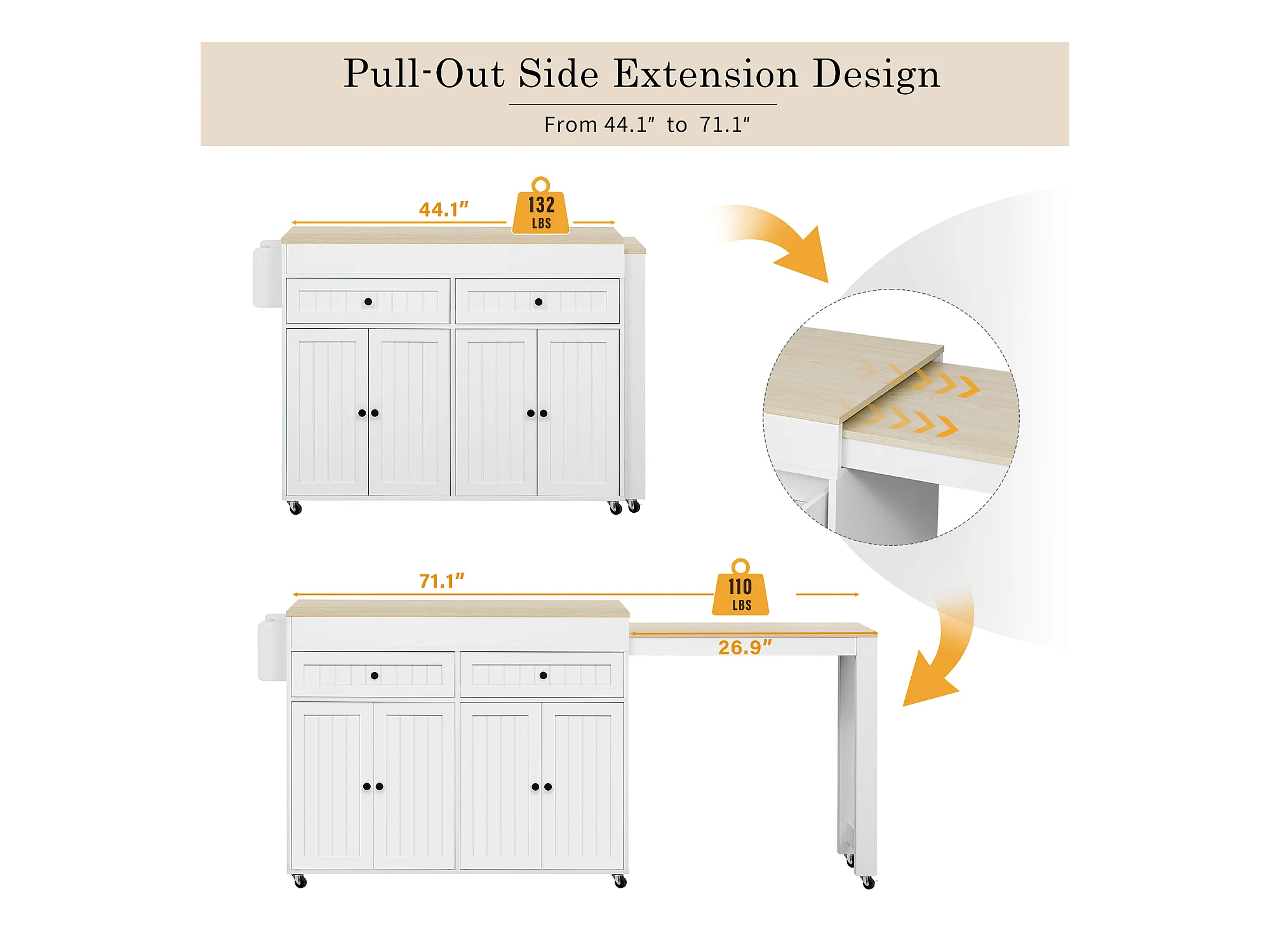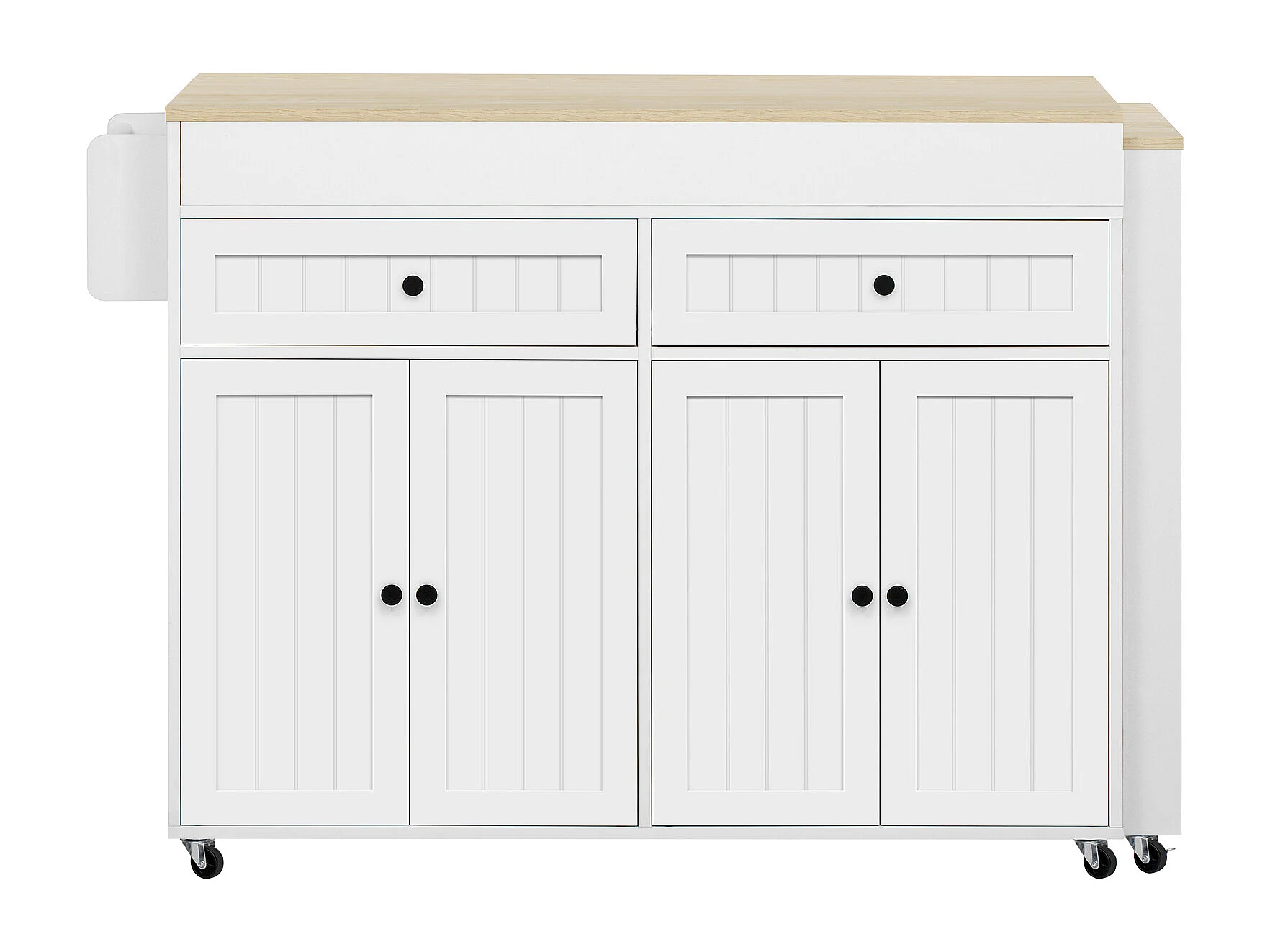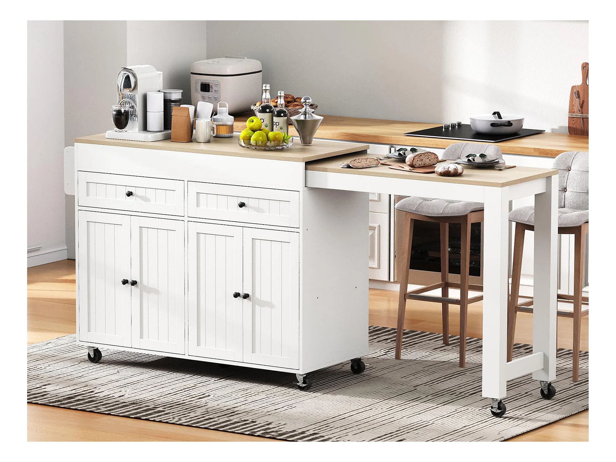 Ilot central de cuisine - avec 4 portes et 2 tiroirs - plateau extensible - avec roulettes - 180.5x45x92.2 cm - Blanc + Naturel