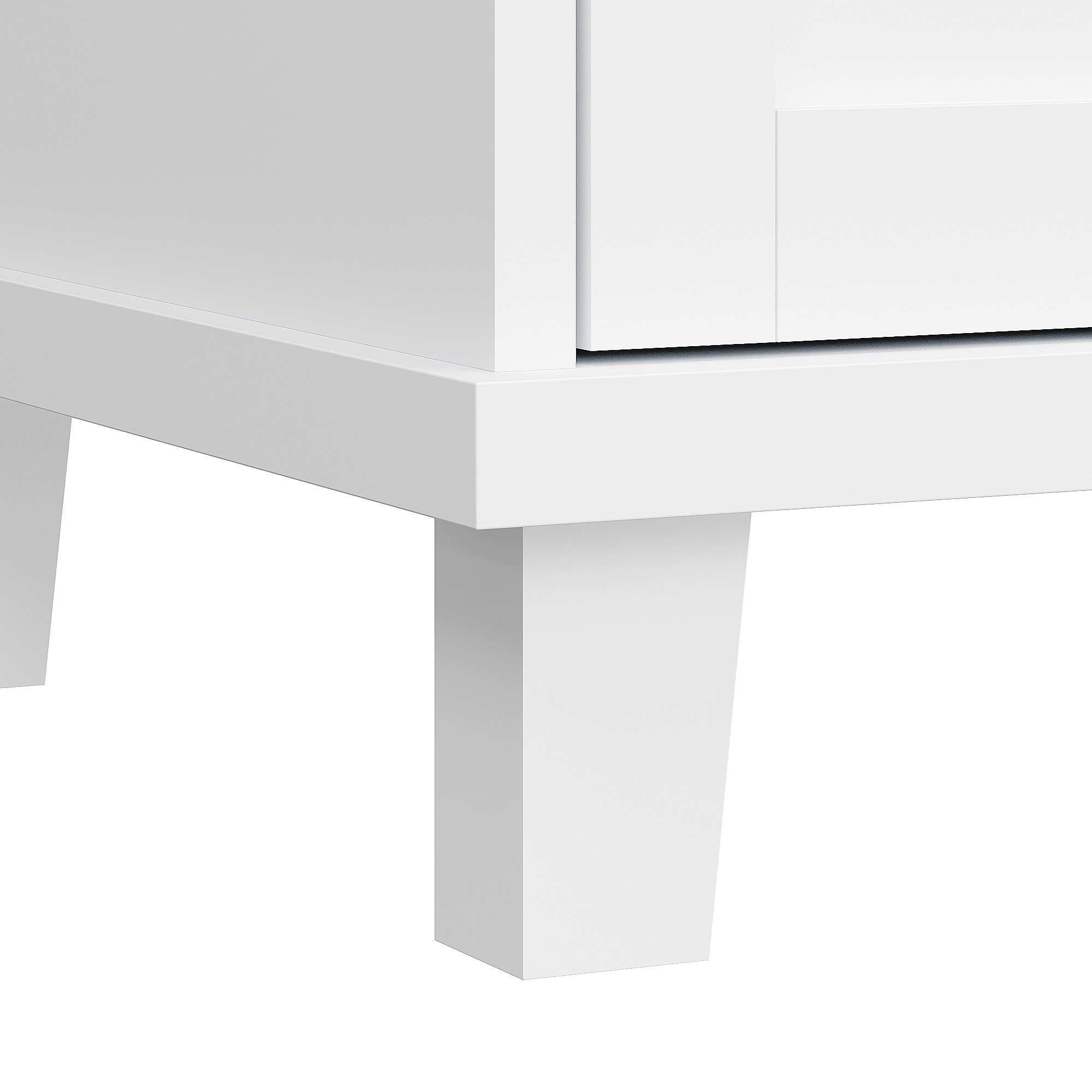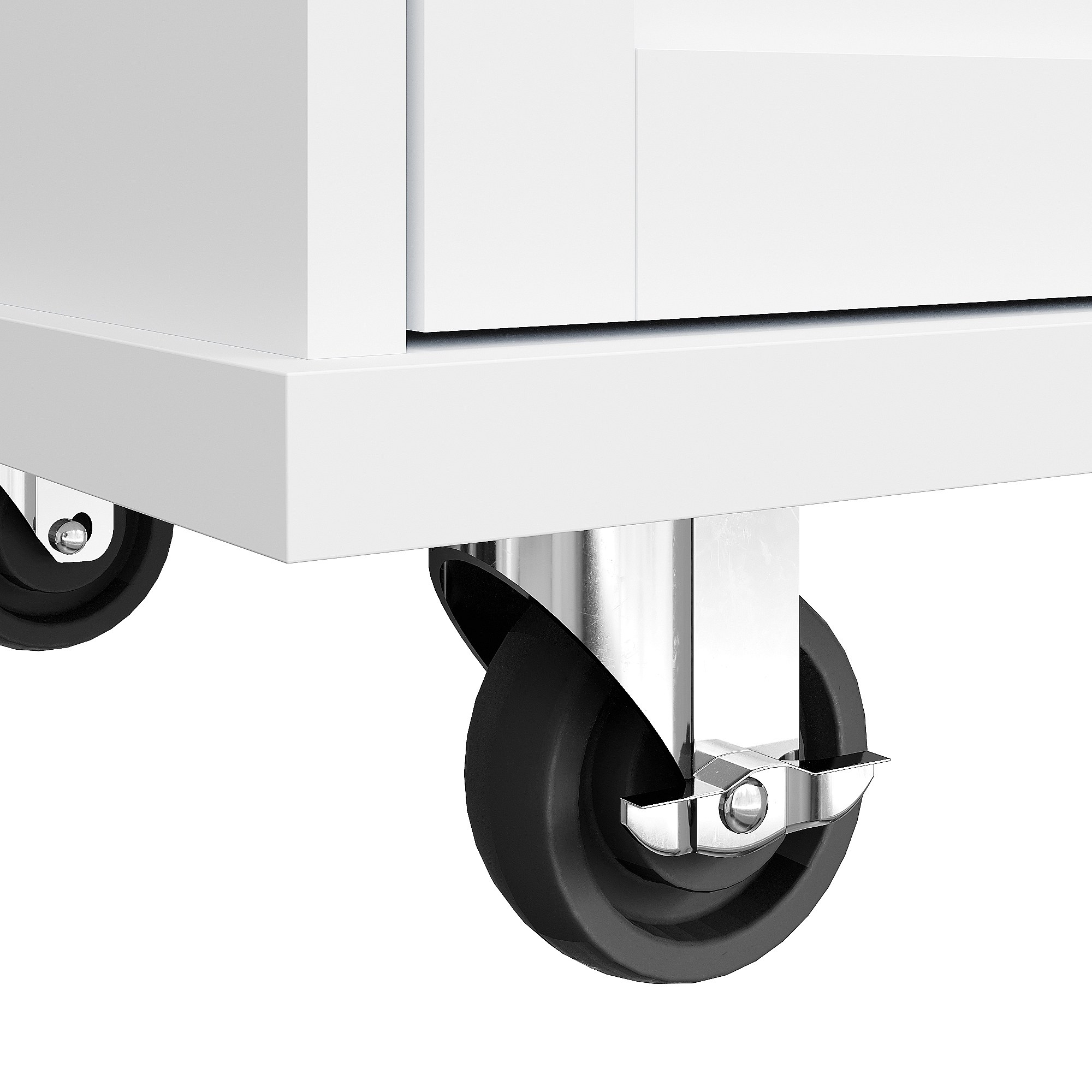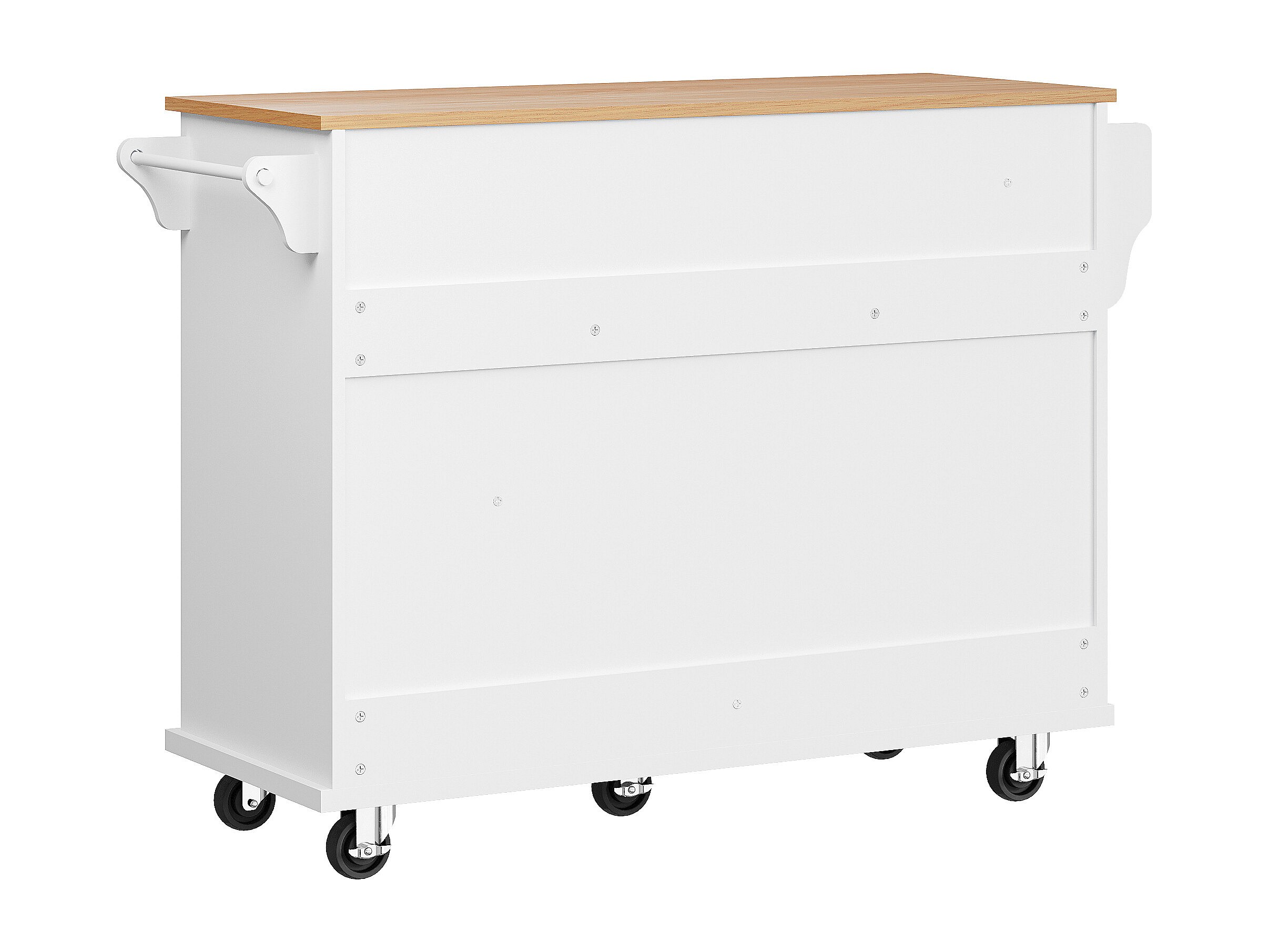 Îlot central de cuisine blanc à 5 tiroirs - Desserte de cuisine à 1 porte et 3 compartiments de rangement ouverts - etagère à épices et porte-serviettes