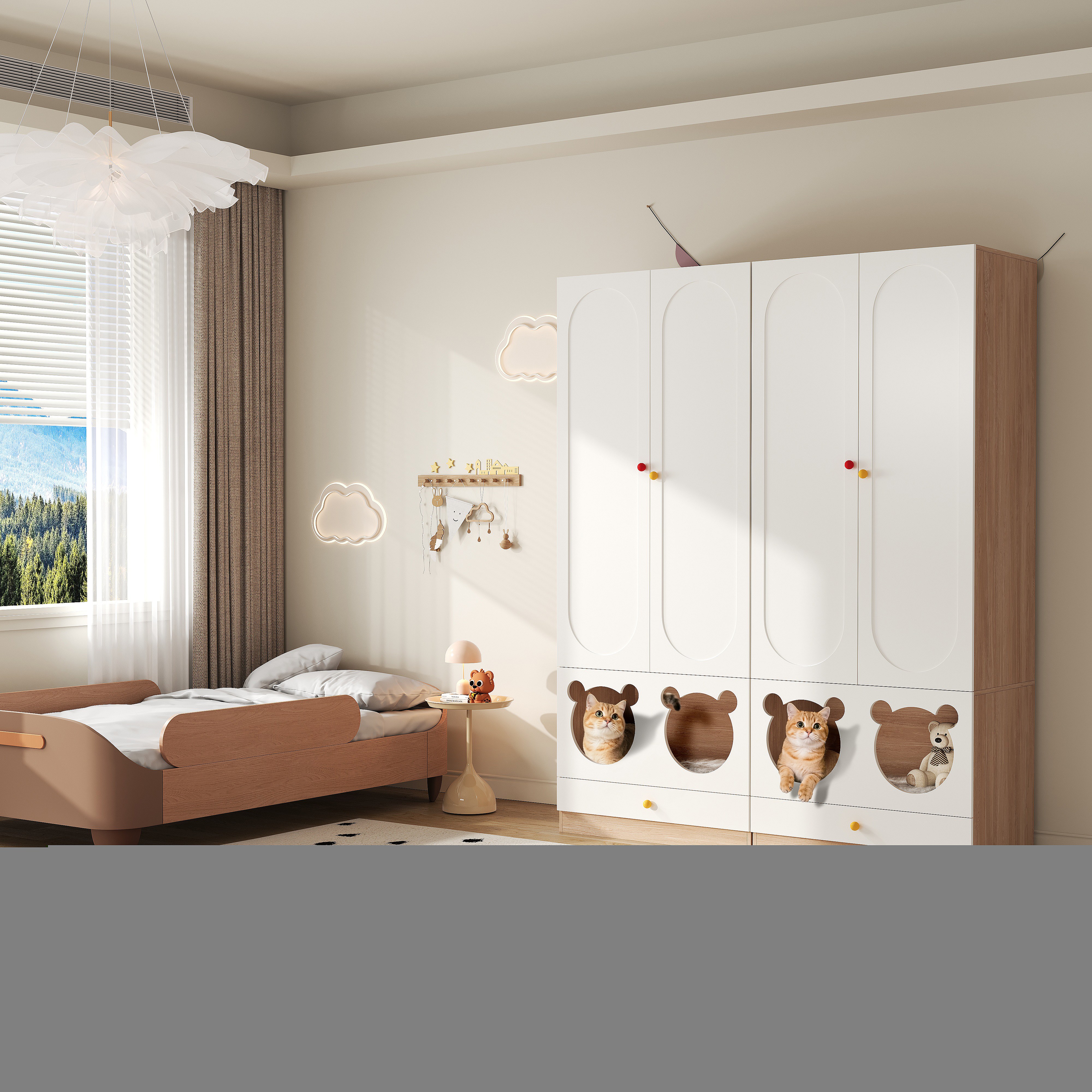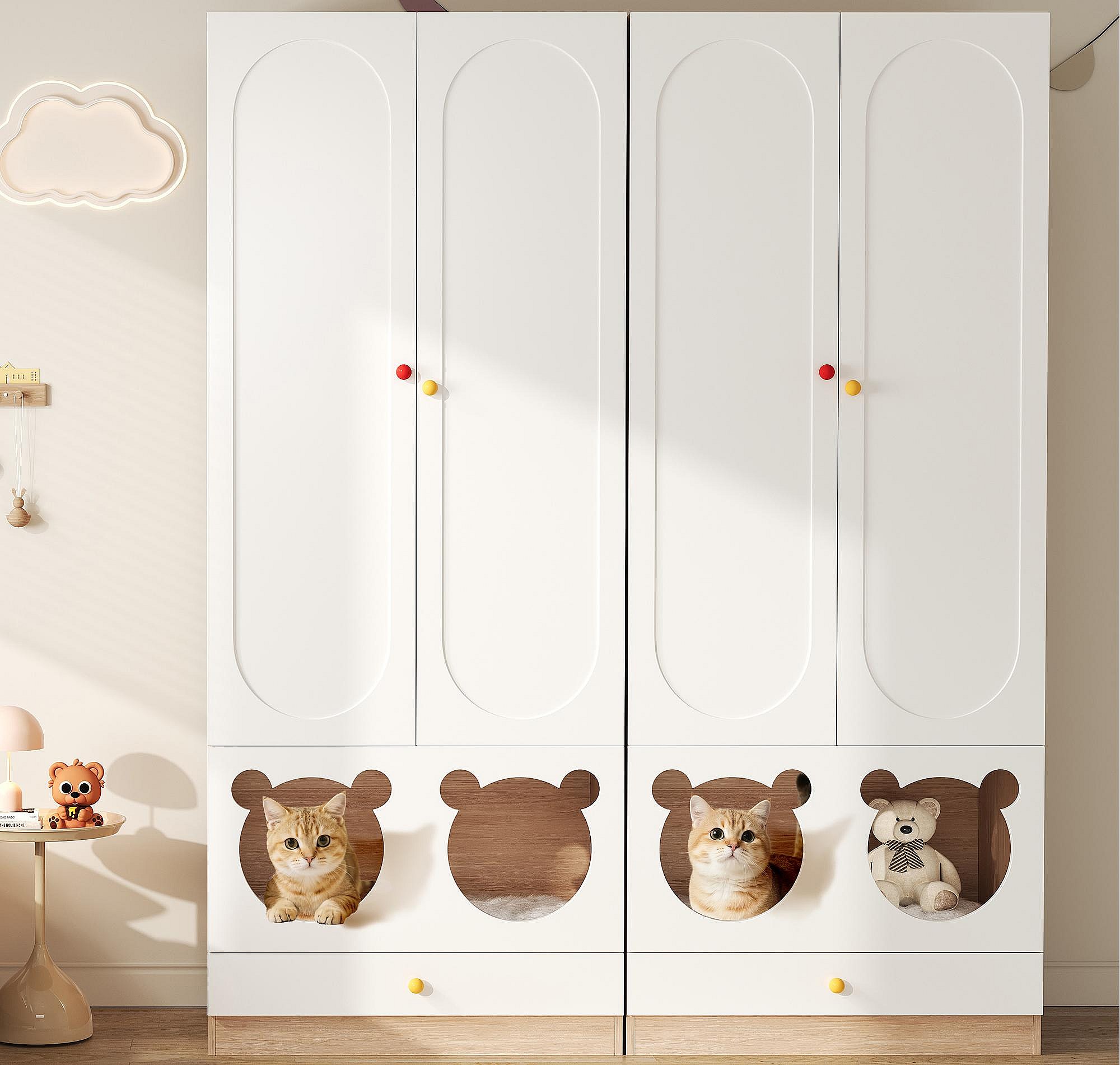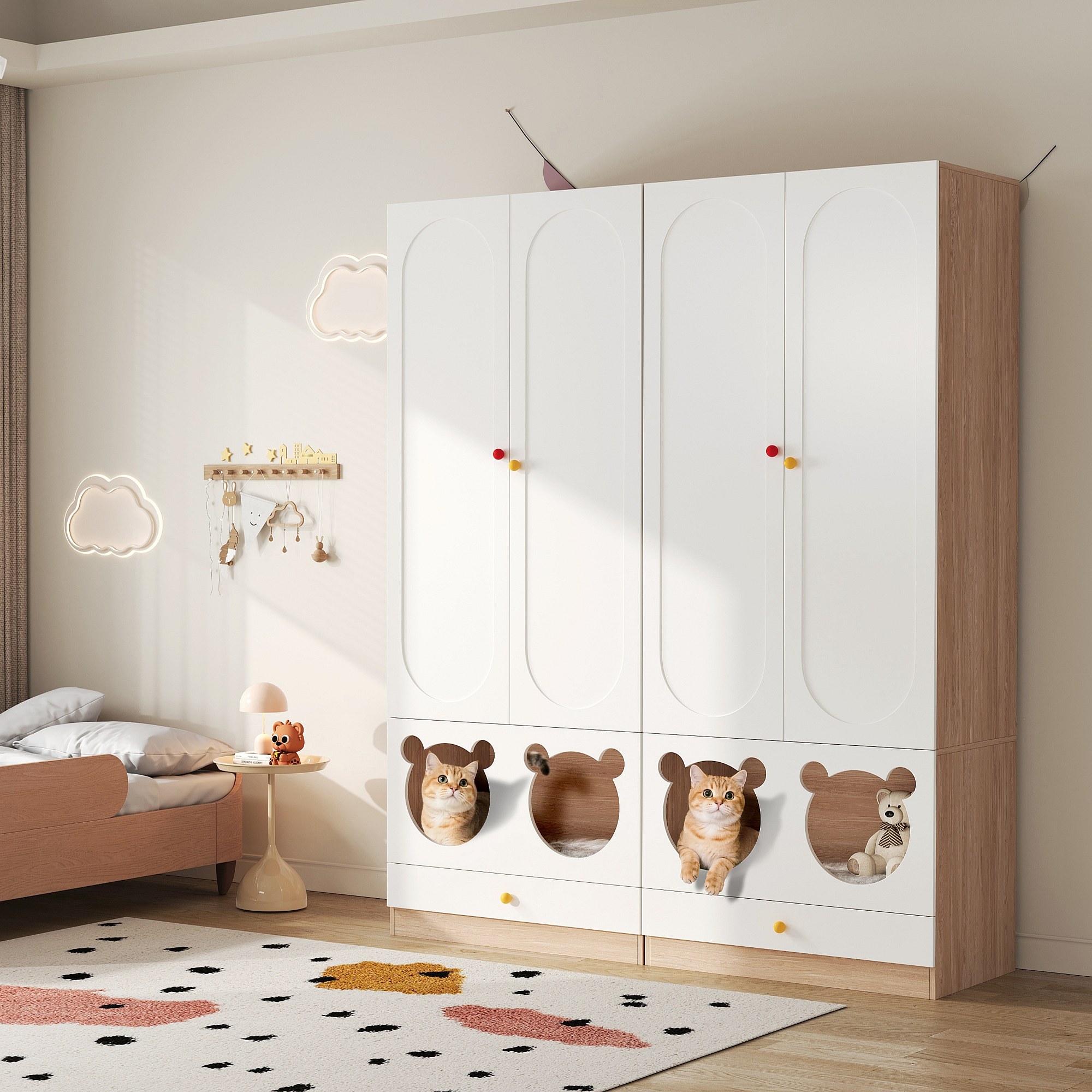 Lot de 2 armoires enfants 160x50x200 cm - avec tringles à vêtements - avec lits pour chats - 4 portes - blanc + naturel