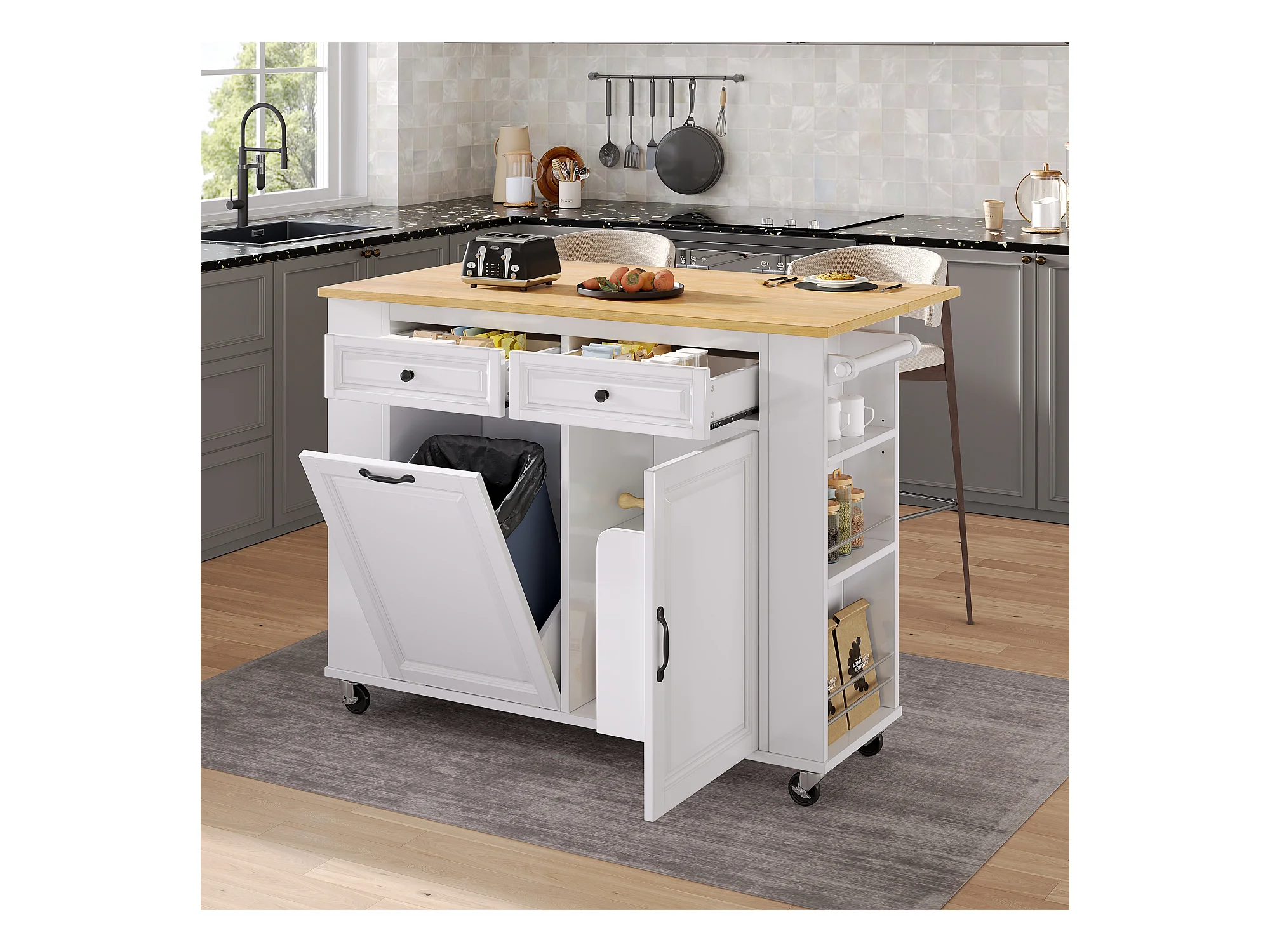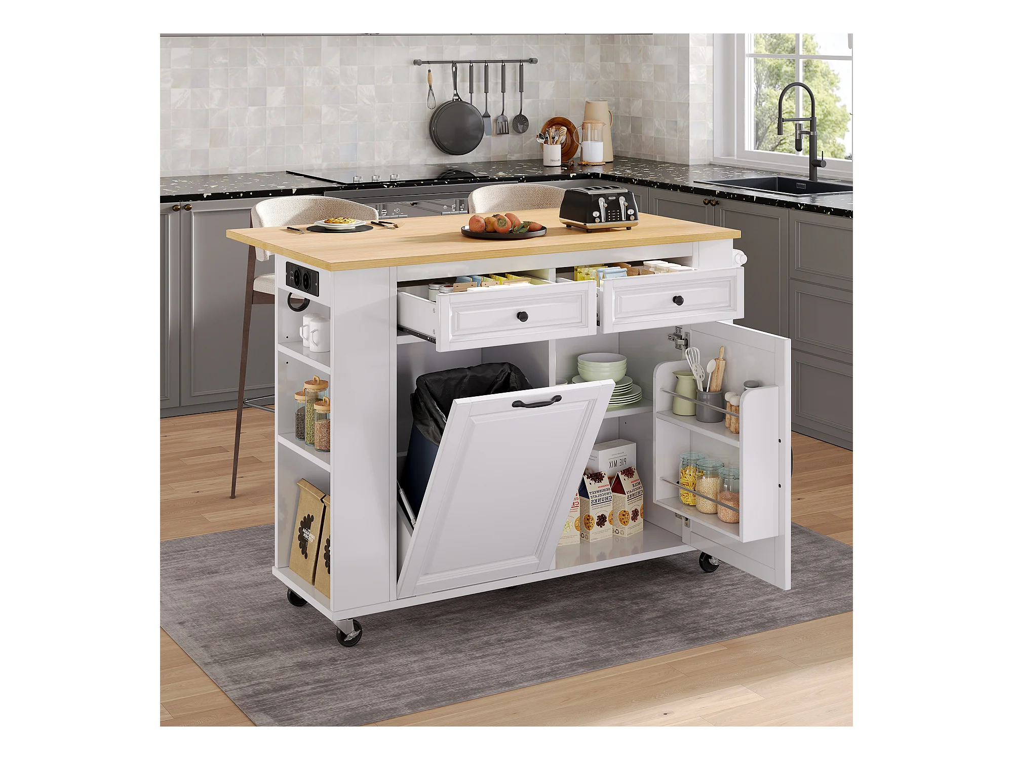 Ilot central de cuisine mobile 131.8x40x93.3cm - plateau extensible - avec USB - avec compartiment poubelle et rangement multifonctionnel - blanc