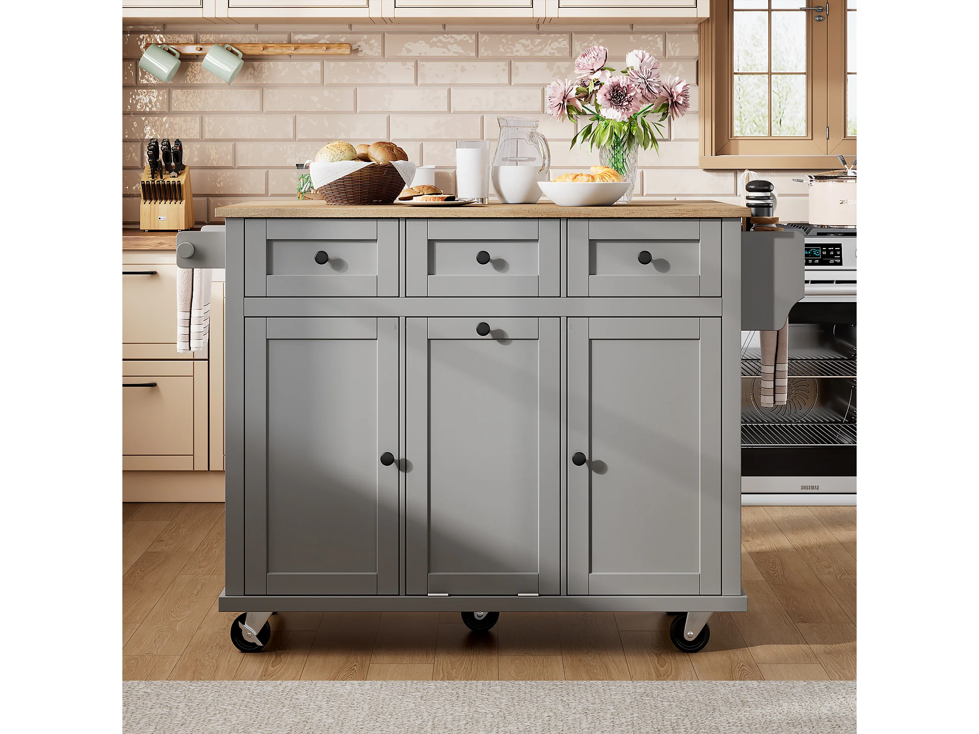 Ilot central de cuisine mobile 126x46.8x94.2cm - avec roulettes - 3 tiroirs et 3 portes - plateau extensible - avec porte-serviettes - gris
