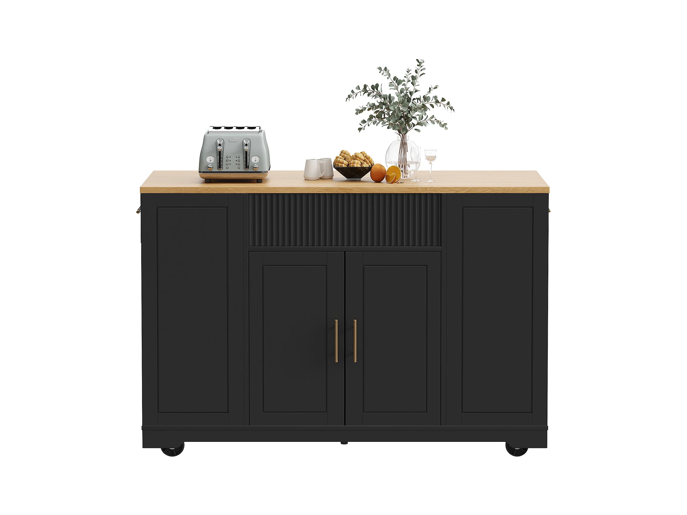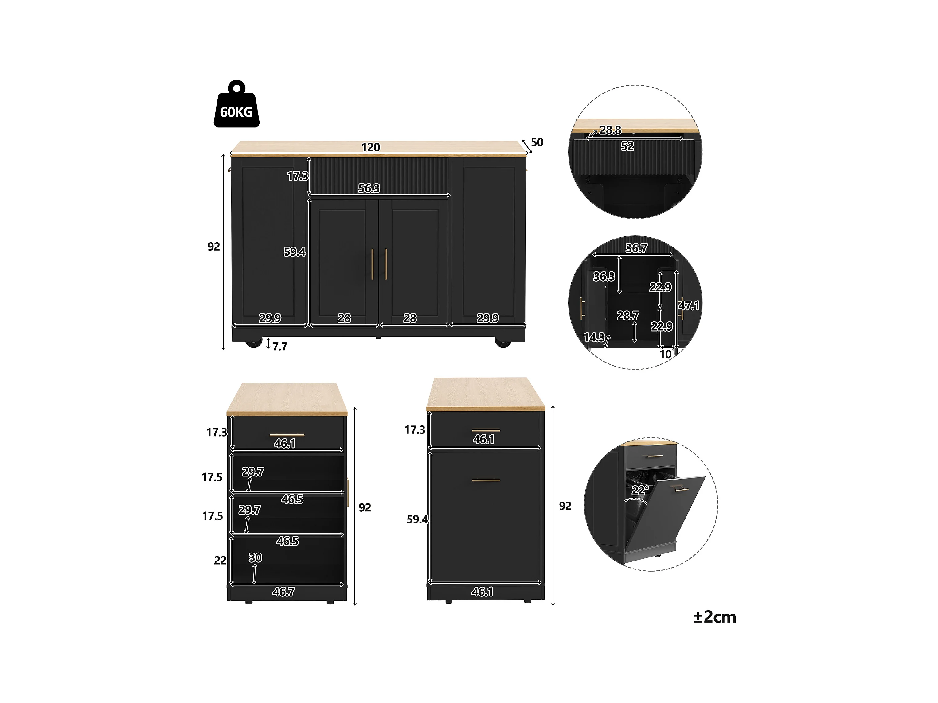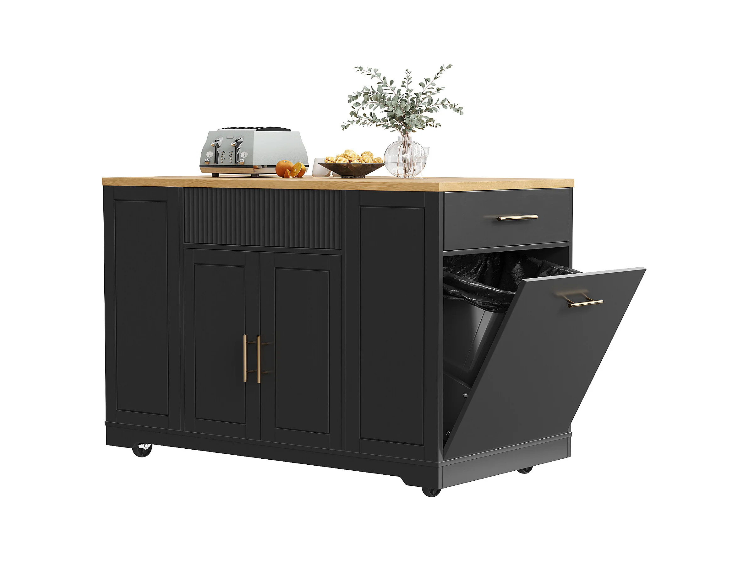 Ilot central de cuisine mobile - 3 portes et 2 tiroirs - étagères ouvertes - avec compartiment poubelle - MDF - Noir