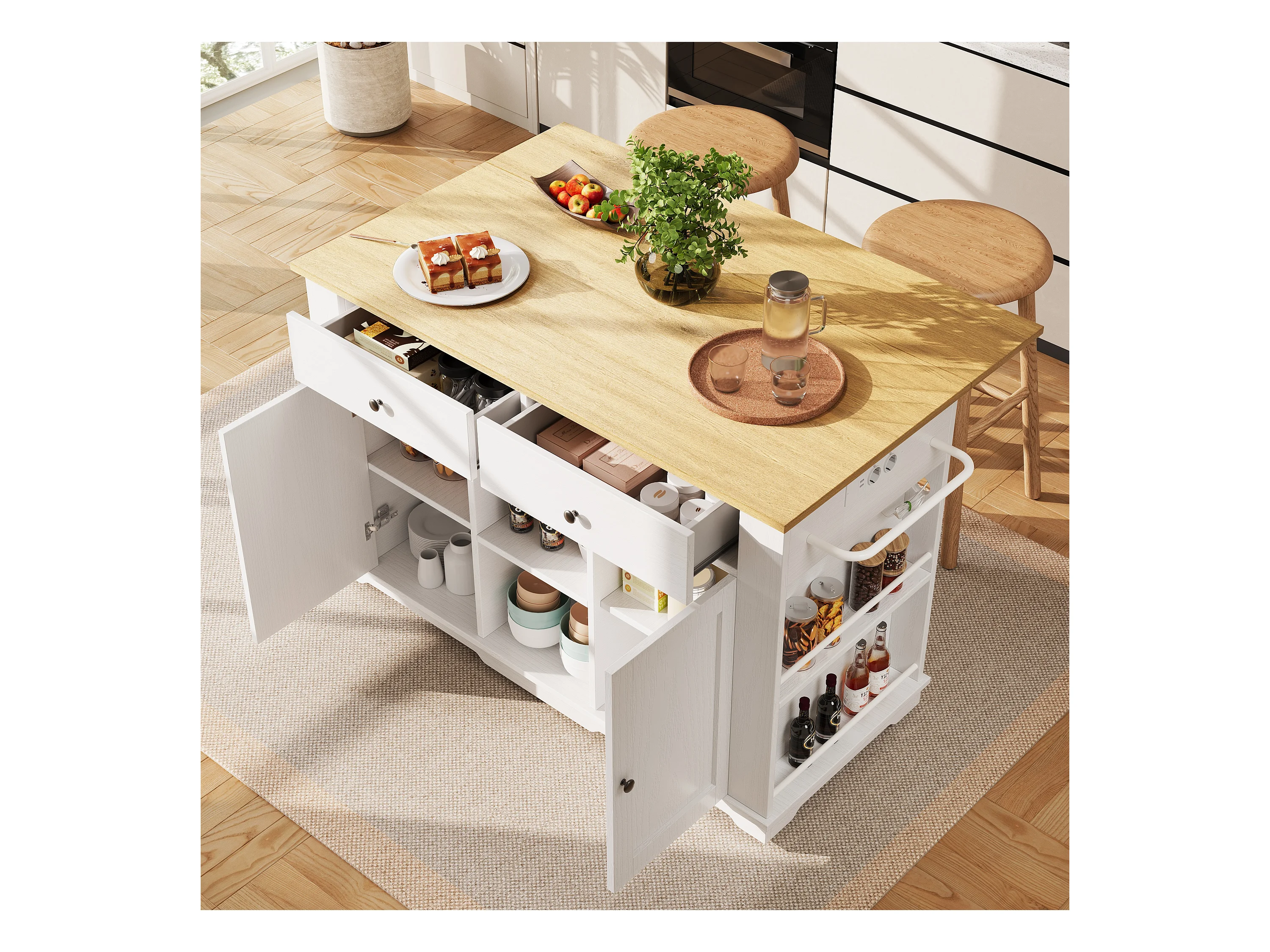 Ilot central de cuisine mobile avec 2 portes, 2 tiroirs et 4 Porte-Bouteilles - Plateau extensible - 131.5x43(76)x90.7cm - MDF - Blanc et naturel