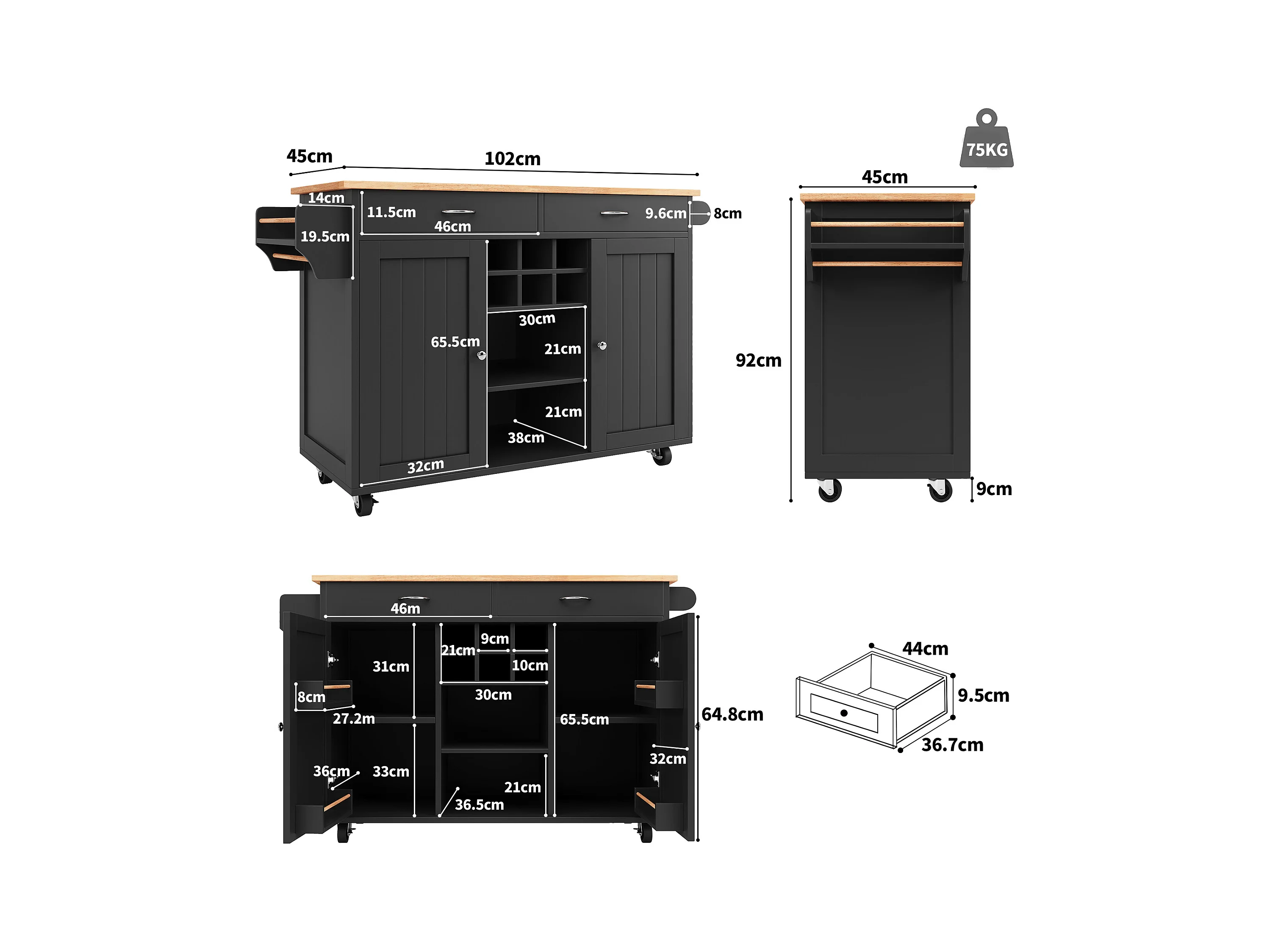 Ilot central de cuisine mobile avec 2 portes et 2 tiroirs - 102x45x92 cm - Bois MDF - Noir et naturel