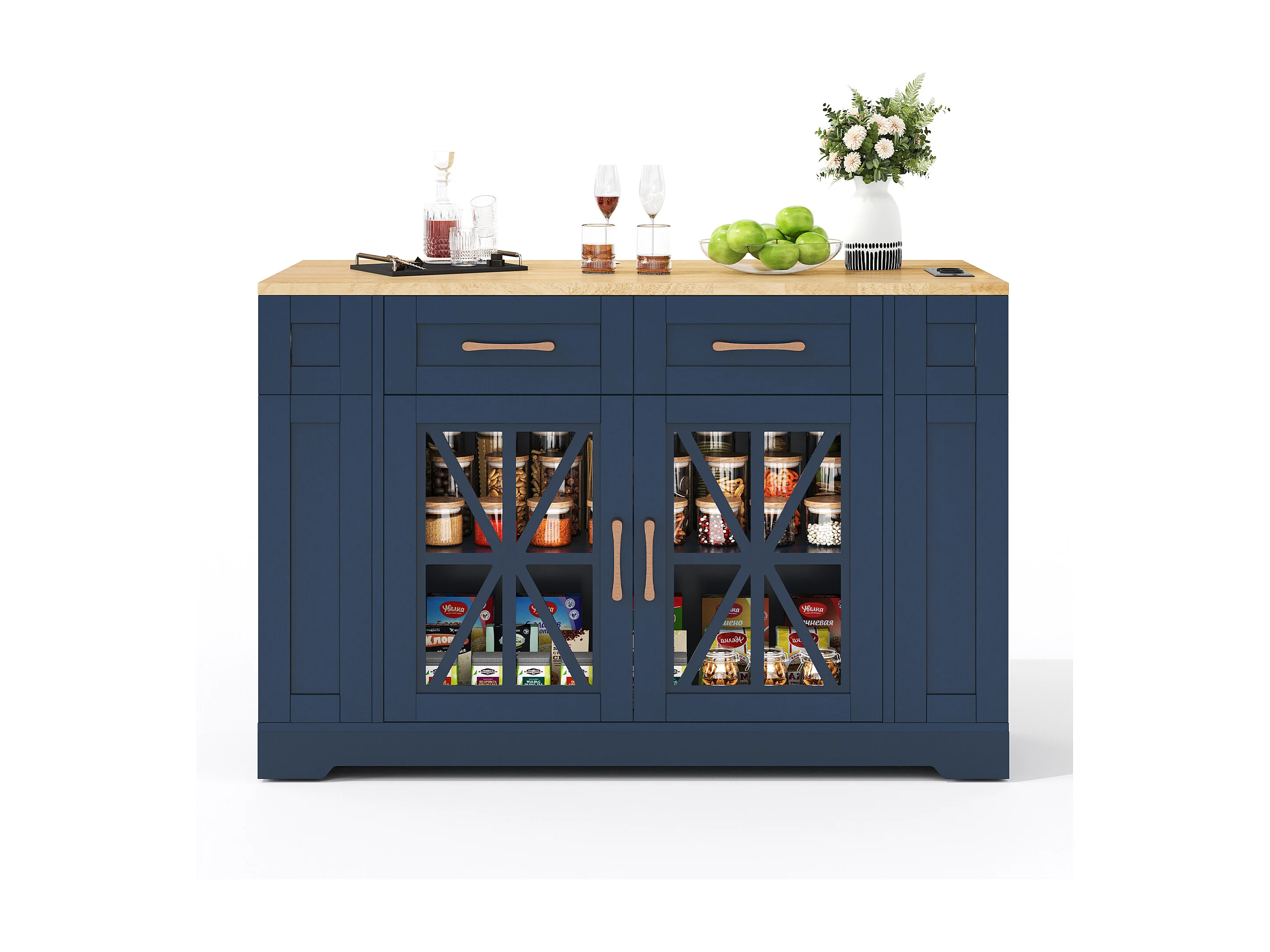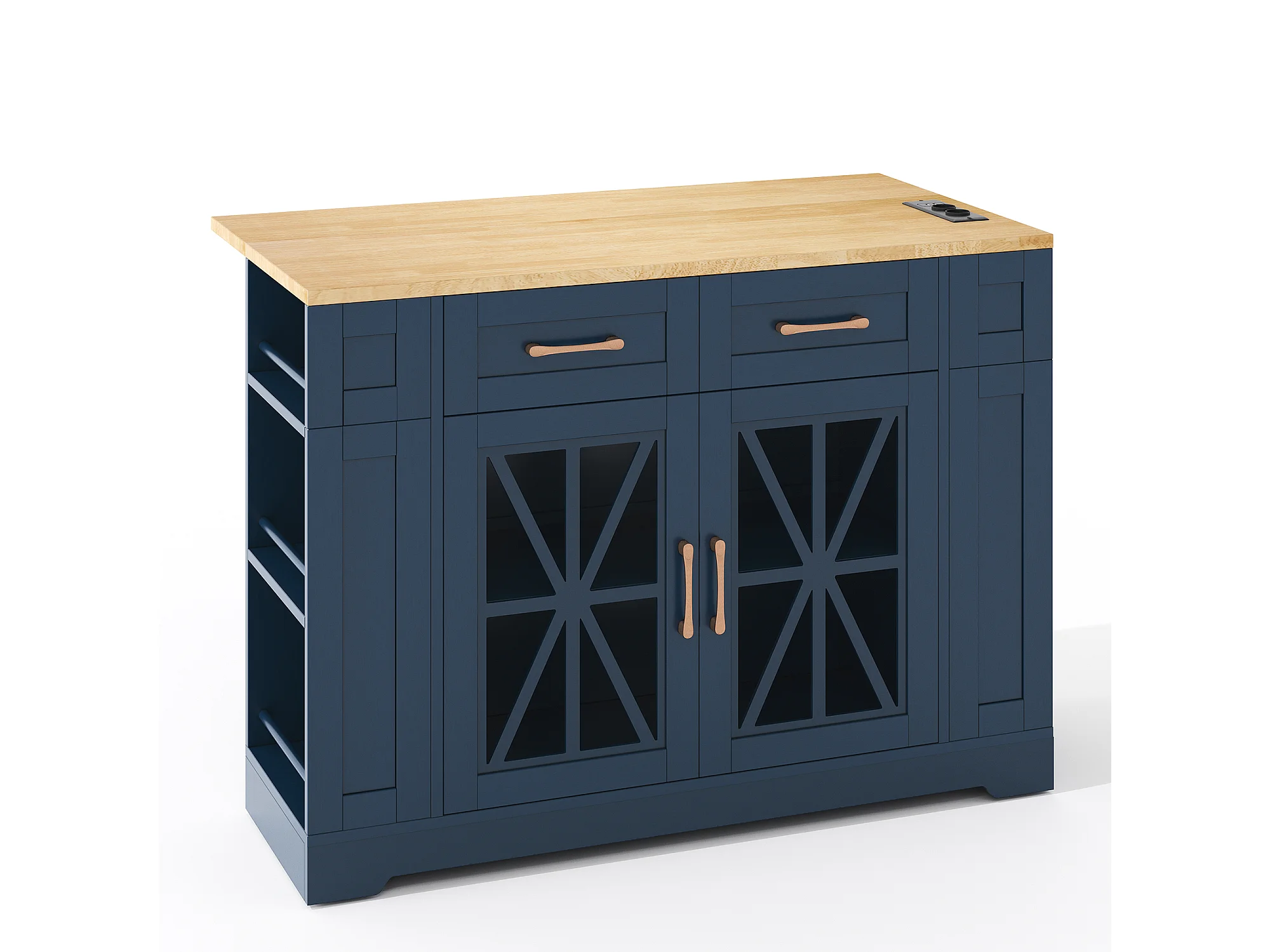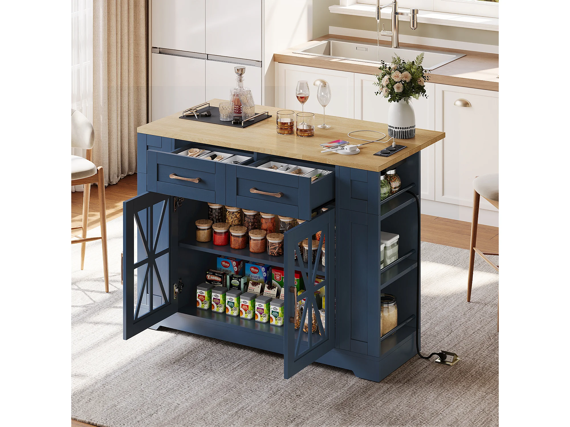 Ilot central de cuisine mobile - avec USB - plateau extensible - 2 tiroirs et 2 portes - MDF - Bleu