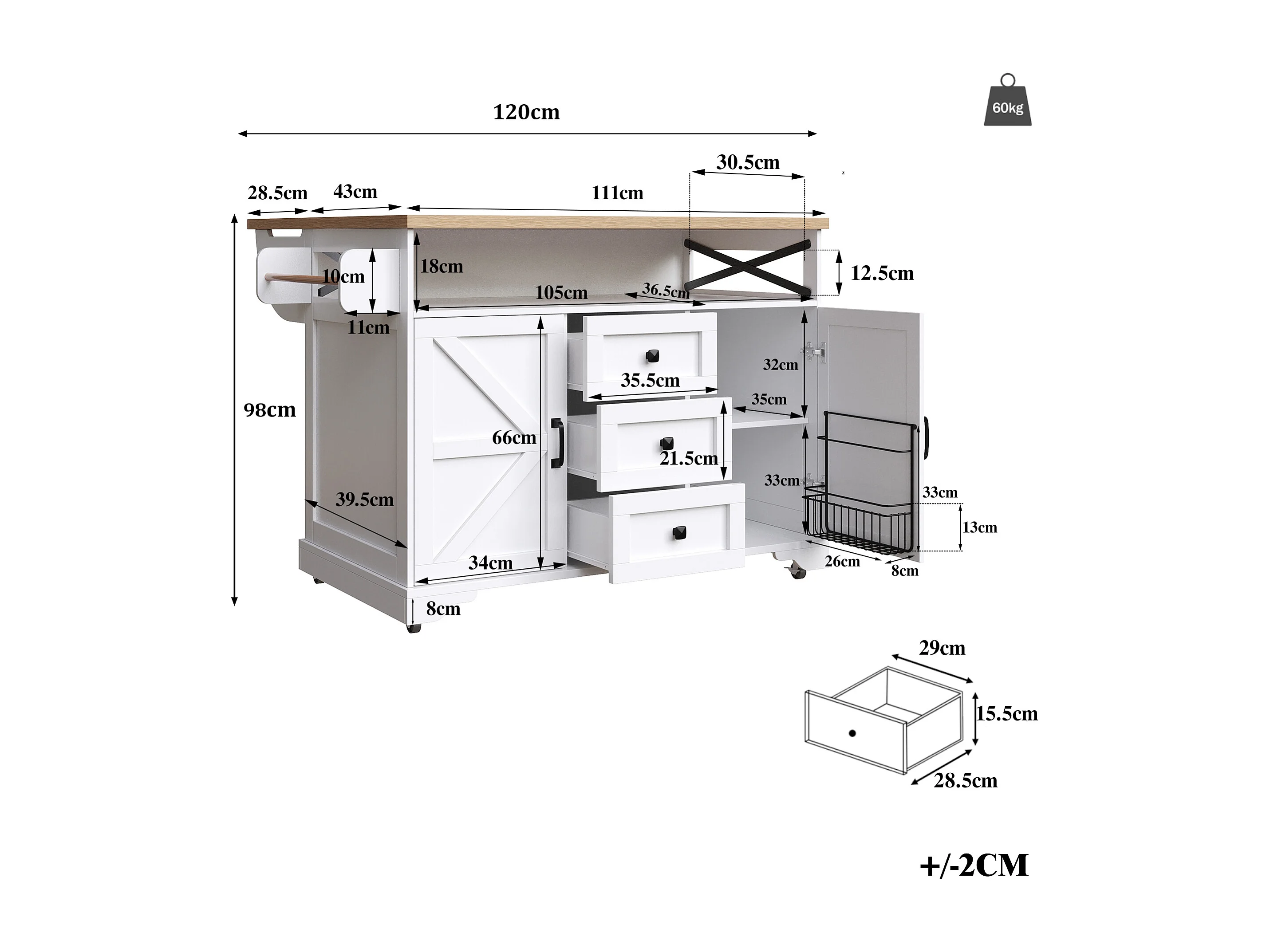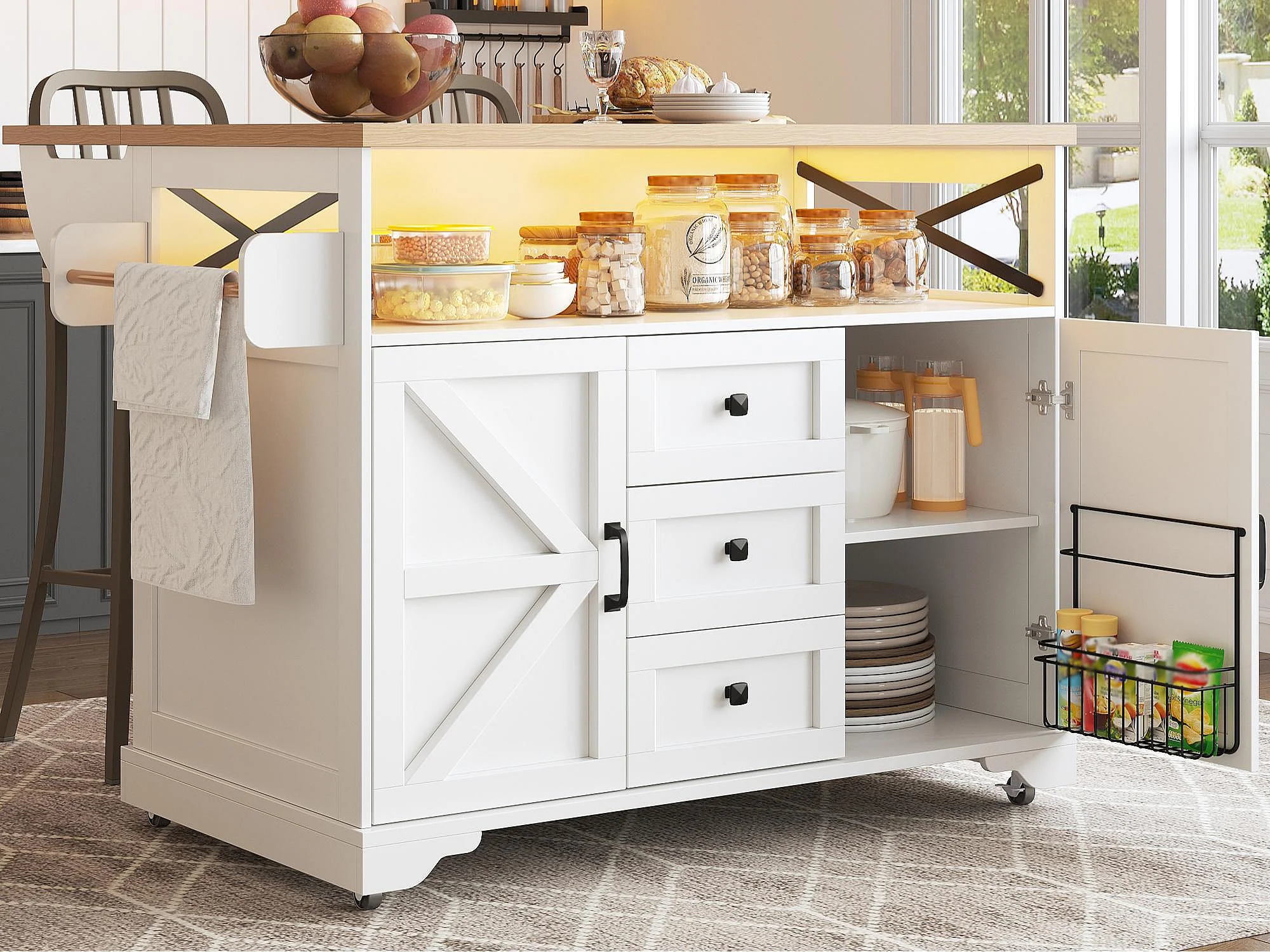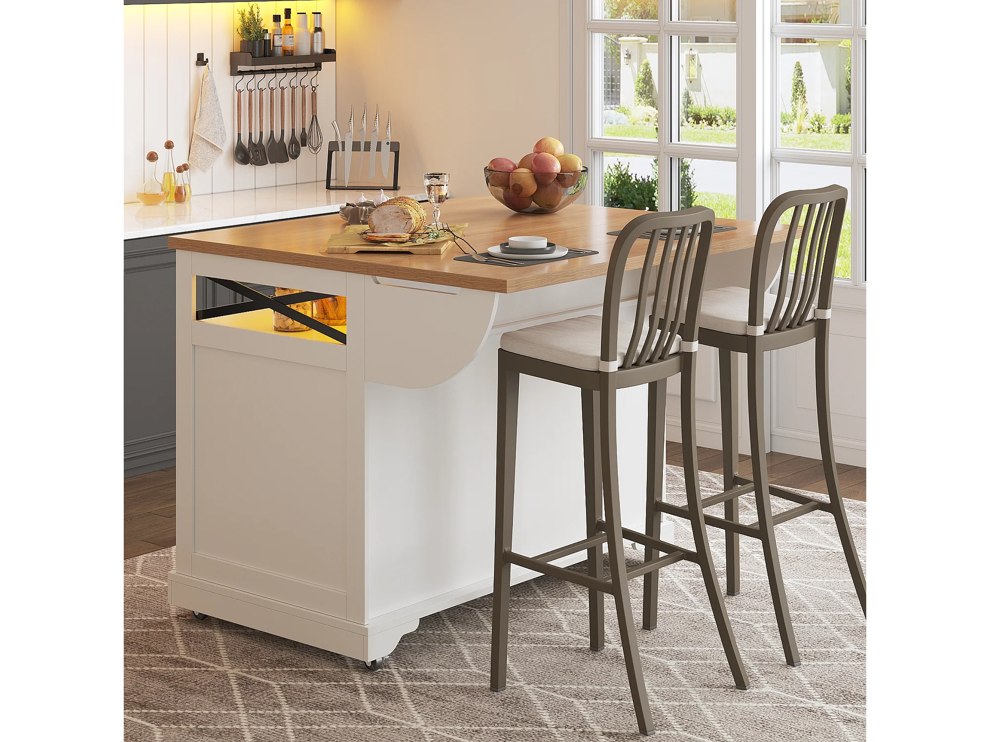 Ilot central de cuisine mobile - Plateau extensible - 120x71x98cm - avec LED - 2 portes et 3 tiroirs - étagères ouvertes - Blanc
