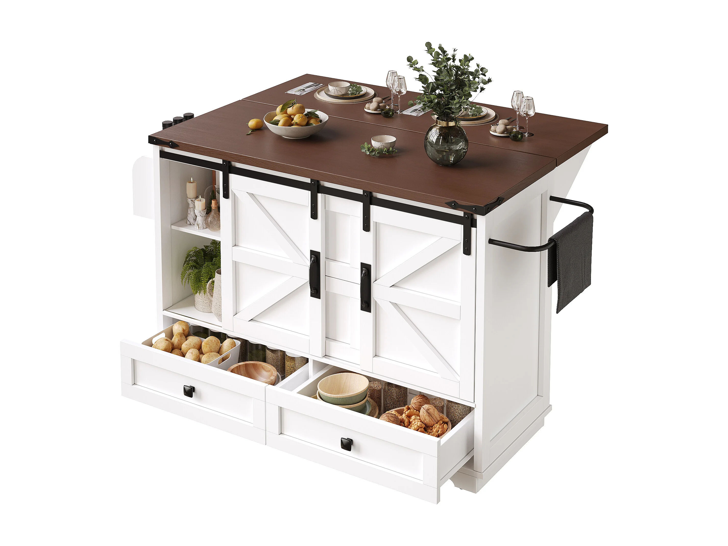 Ilot central de cuisine mobile - Plateau extensible - 120x73x93cm - 2 portes et 4 tiroirs - avec porte-serviettes - style campagnard - Blanc