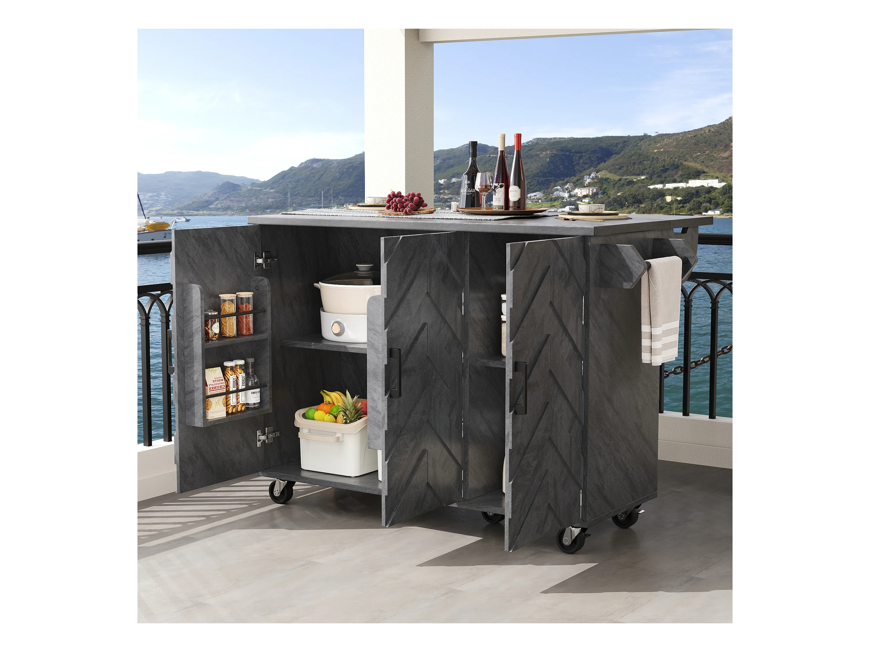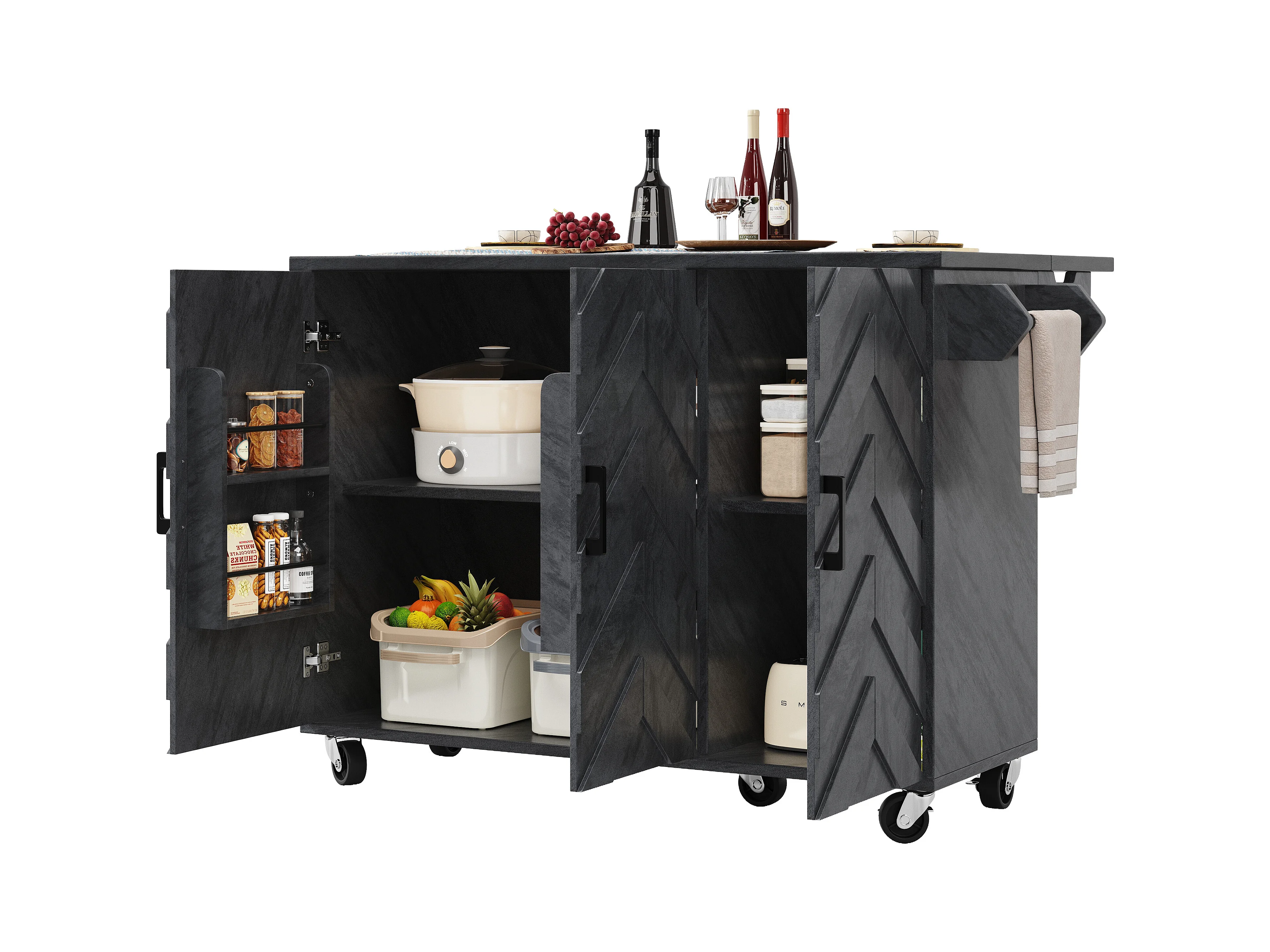 Ilot central de cuisine mobile - Plateau extensible - 3 tiroirs et 3 portes - étagères ouvertes - avec porte-serviettes - MDF - Gris
