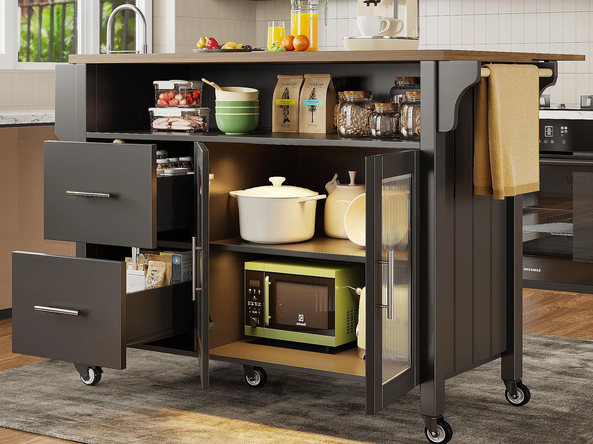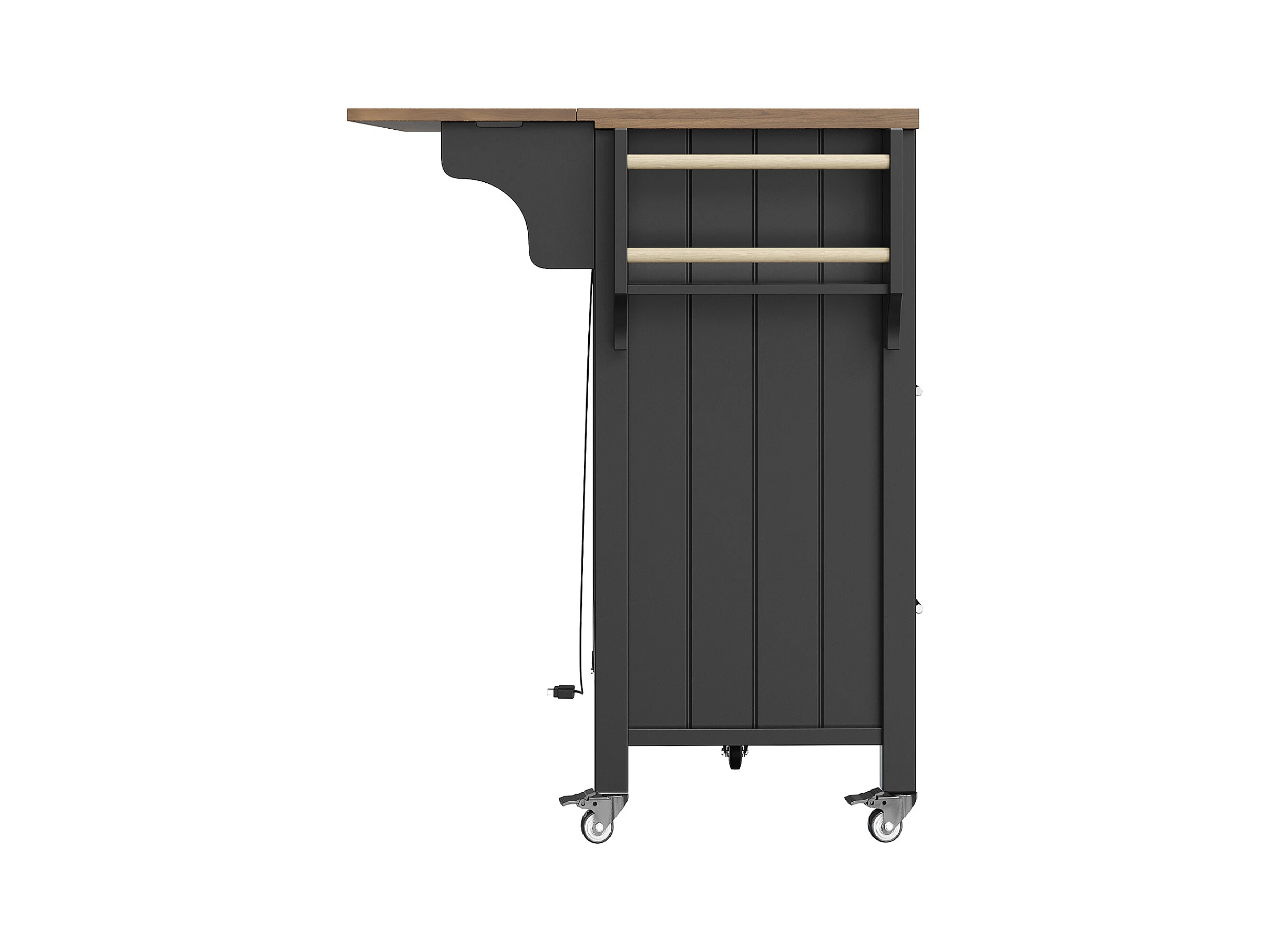 Ilot central de cuisine mobile - plateau extensible - avec LED - 2 tiroirs et 2 portes - avec porte-serviettes - MDF - noir + naturel