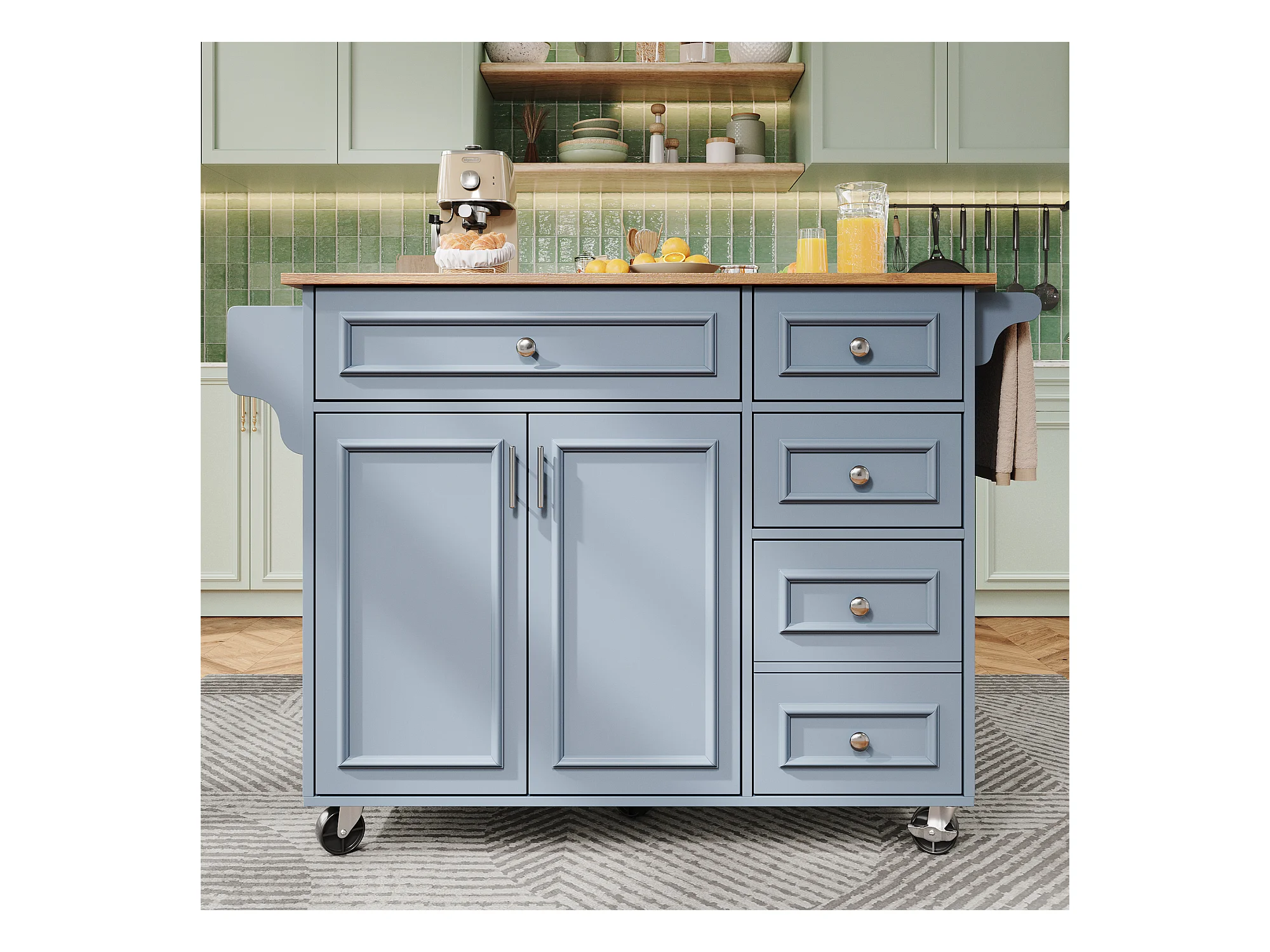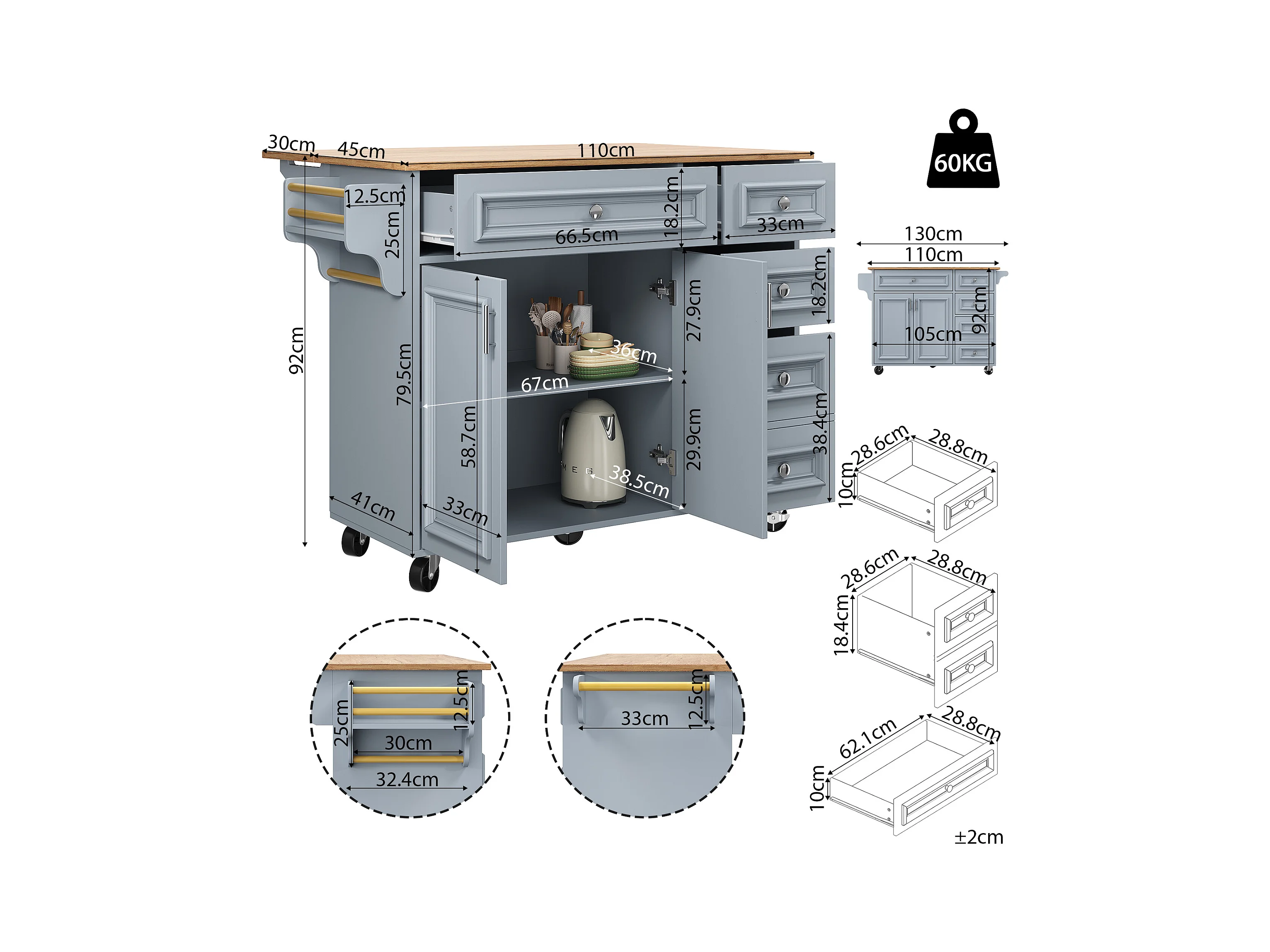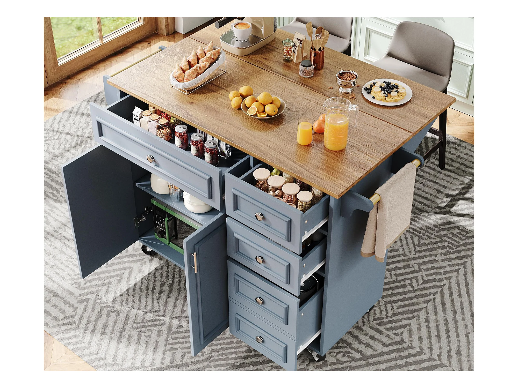 Ilot central de cuisine moderne 130x45x92cm - 5 tiroirs et 2 portes - plateau extensible - avec roulettes - Bleu