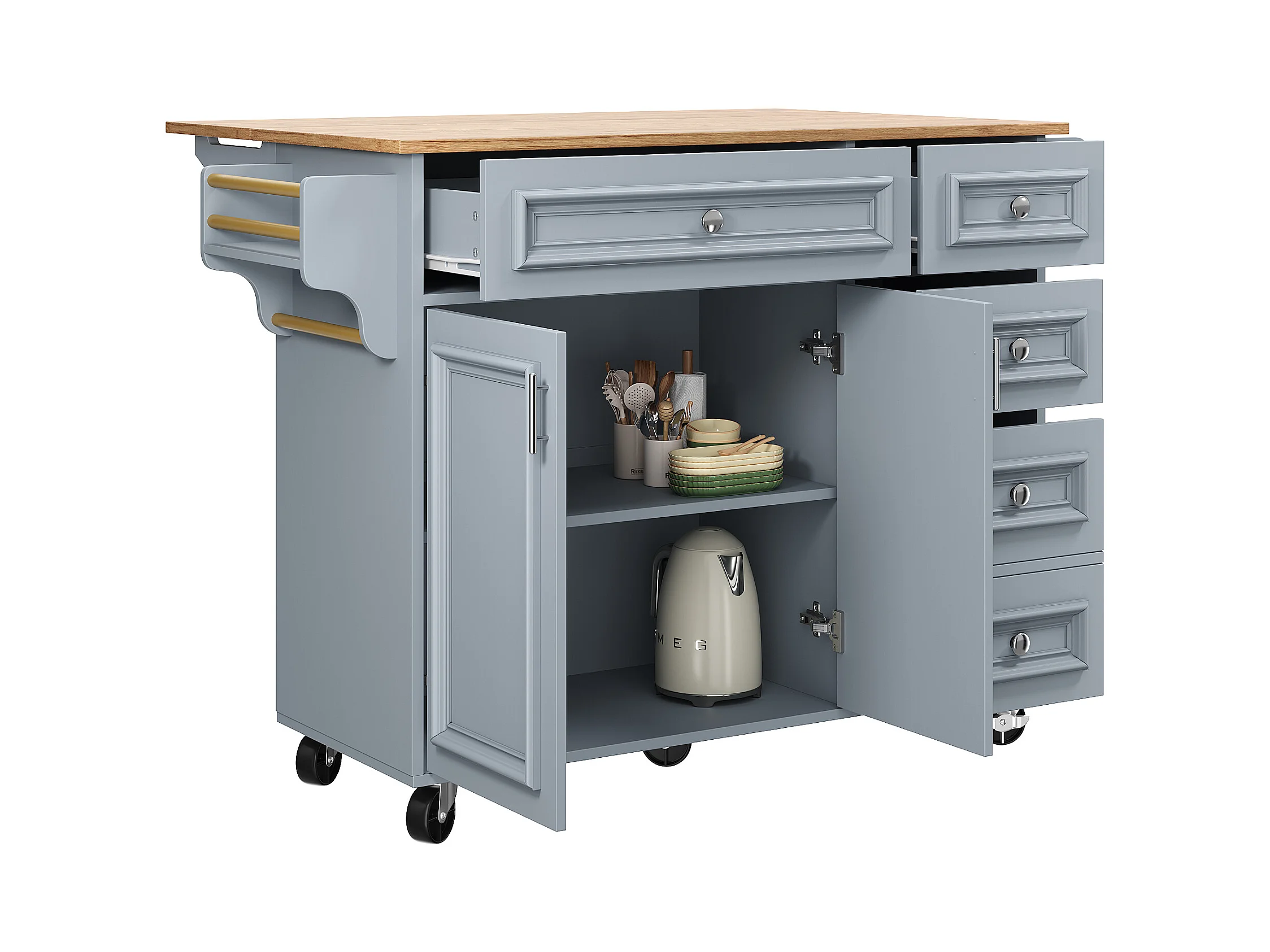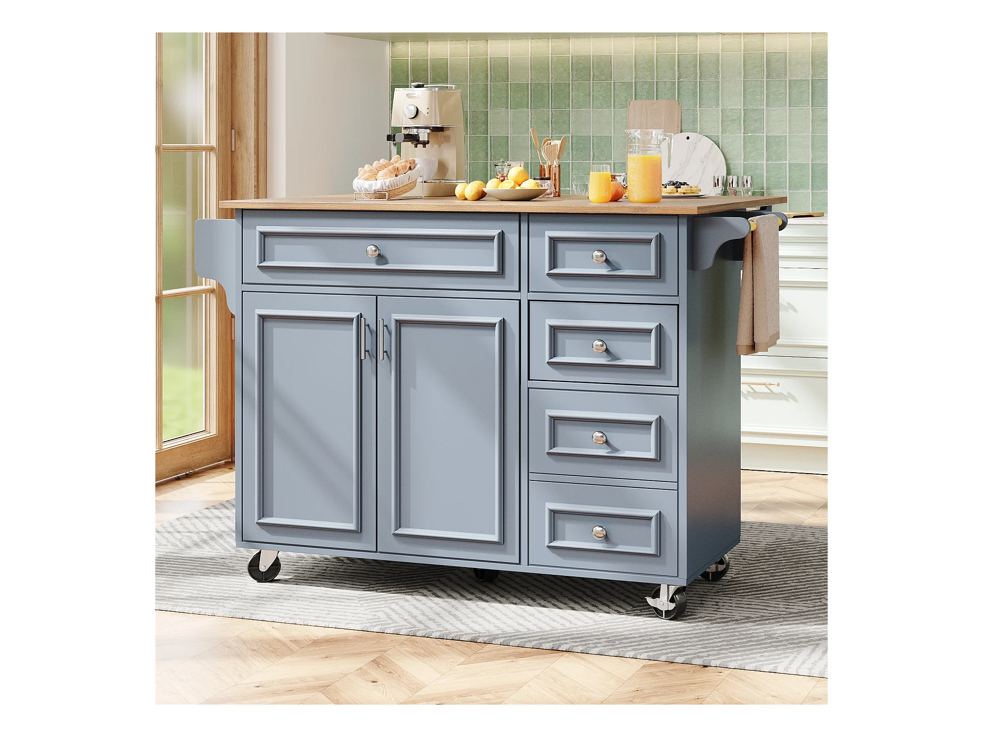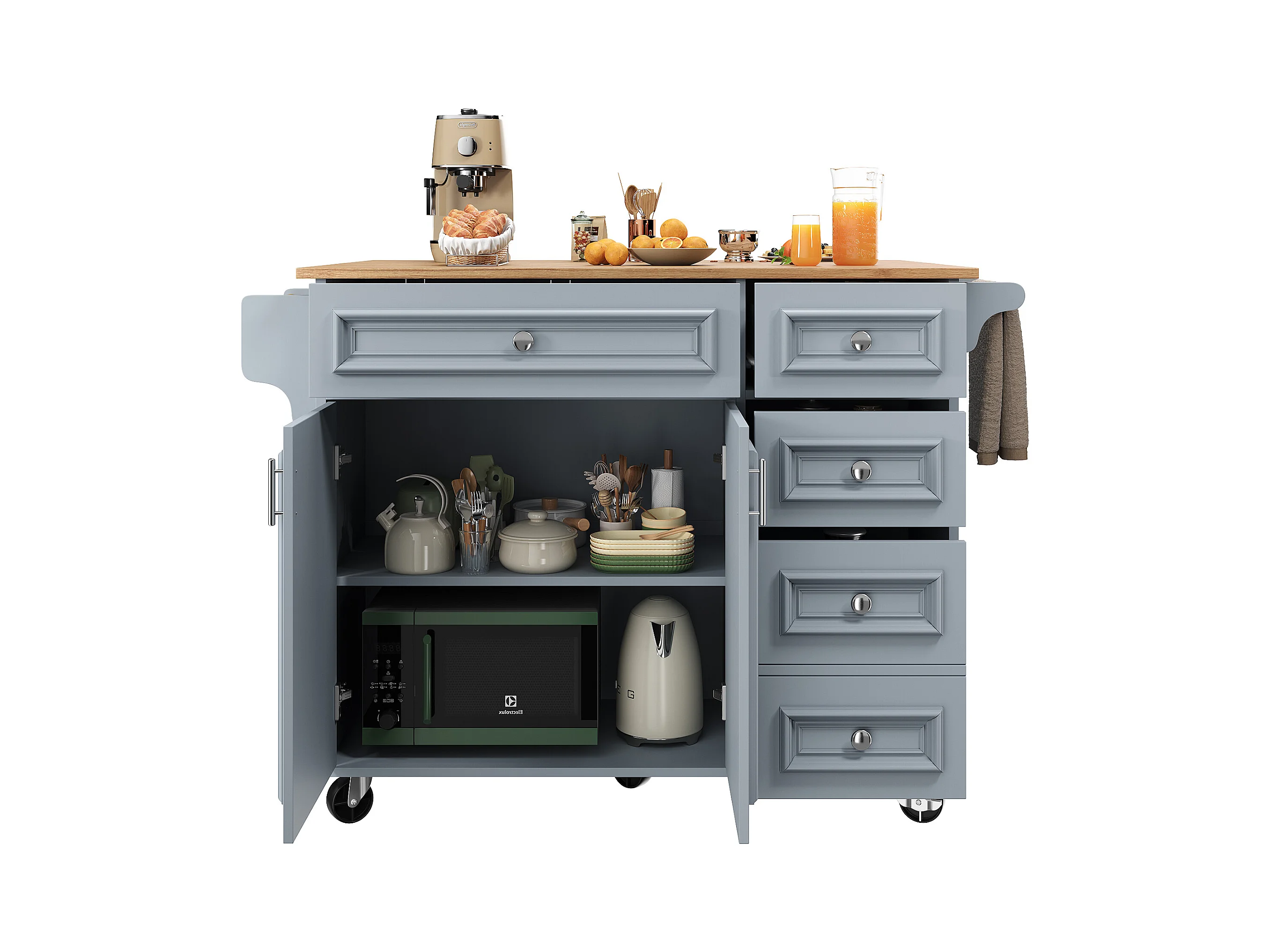 Ilot central de cuisine moderne 130x45x92cm - 5 tiroirs et 2 portes - plateau extensible - avec roulettes - Bleu